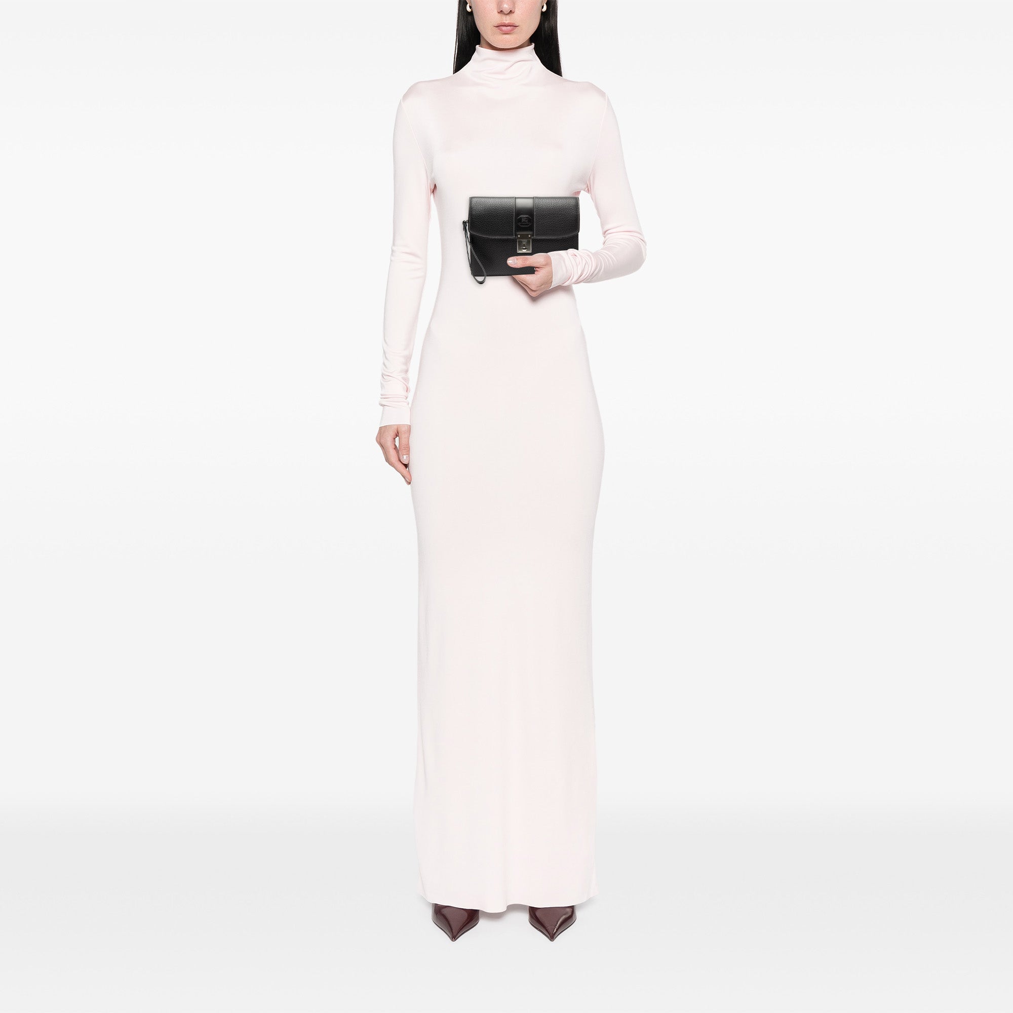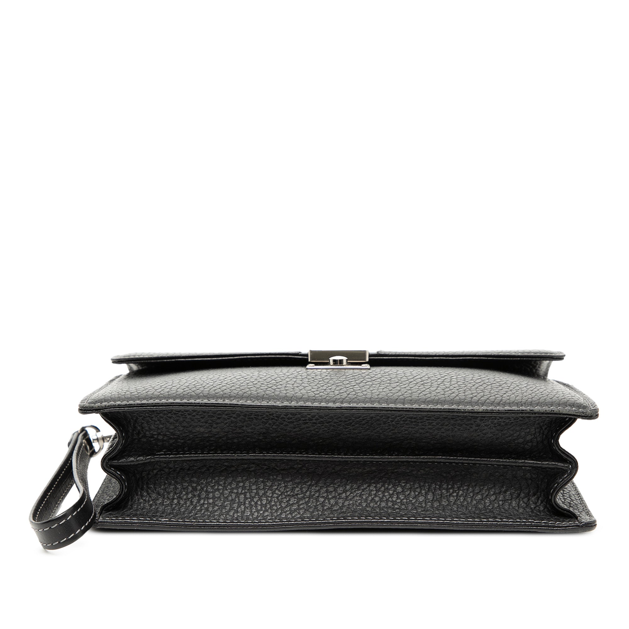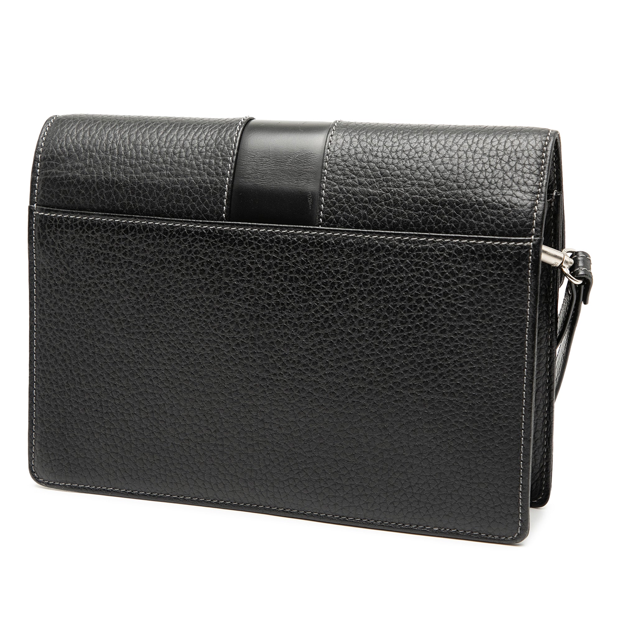 This clutch bag features a leather body, a flat leather wristlet, a top flap with a push lock closure, and an interior zip compartment. Retail Price: 995.00
