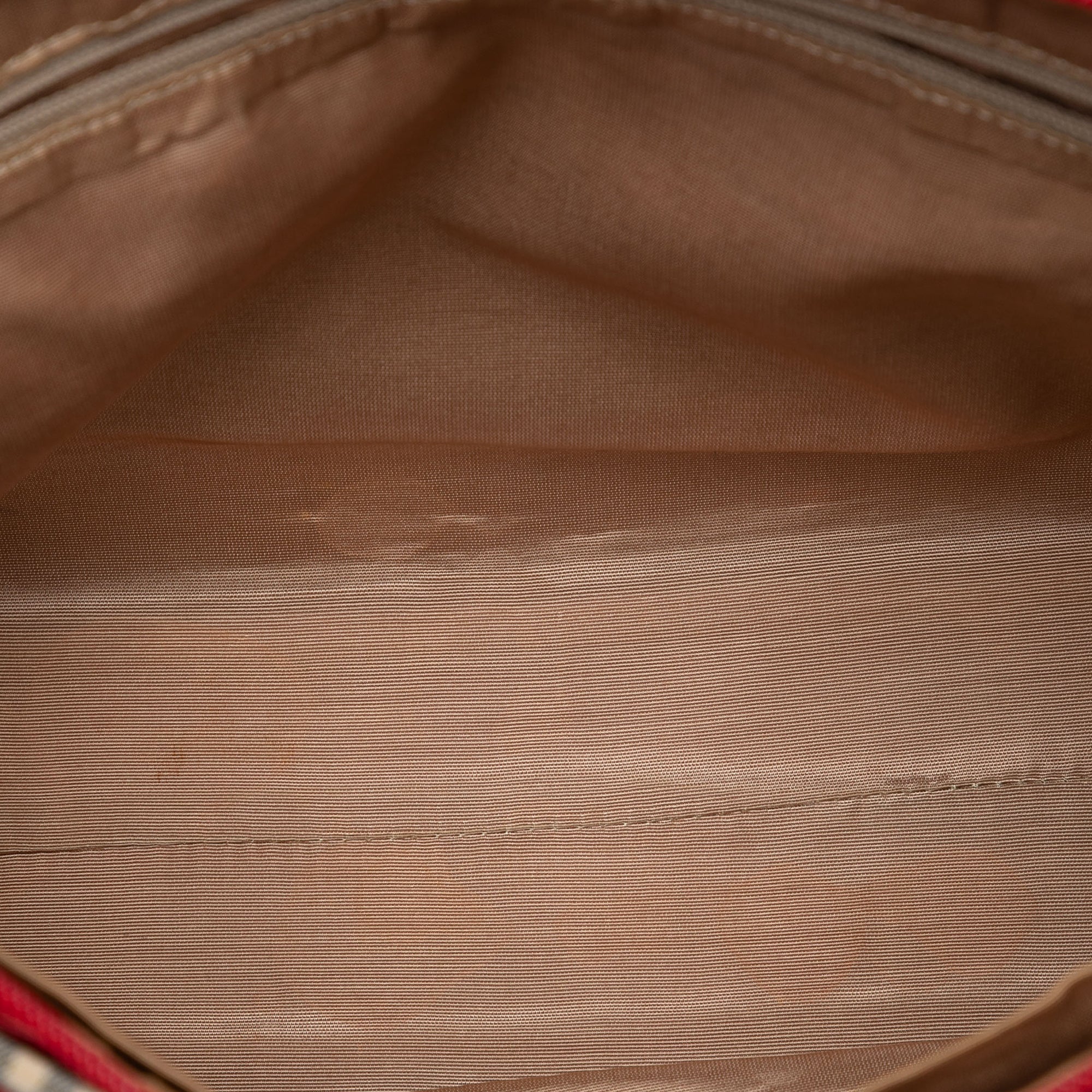 This tote bag features a haymarket check canvas body with leather trim, flat leather straps, a top zip closure, an exterior front zip compartment, and interior zip and slip pockets. Retail Price: 763.00
