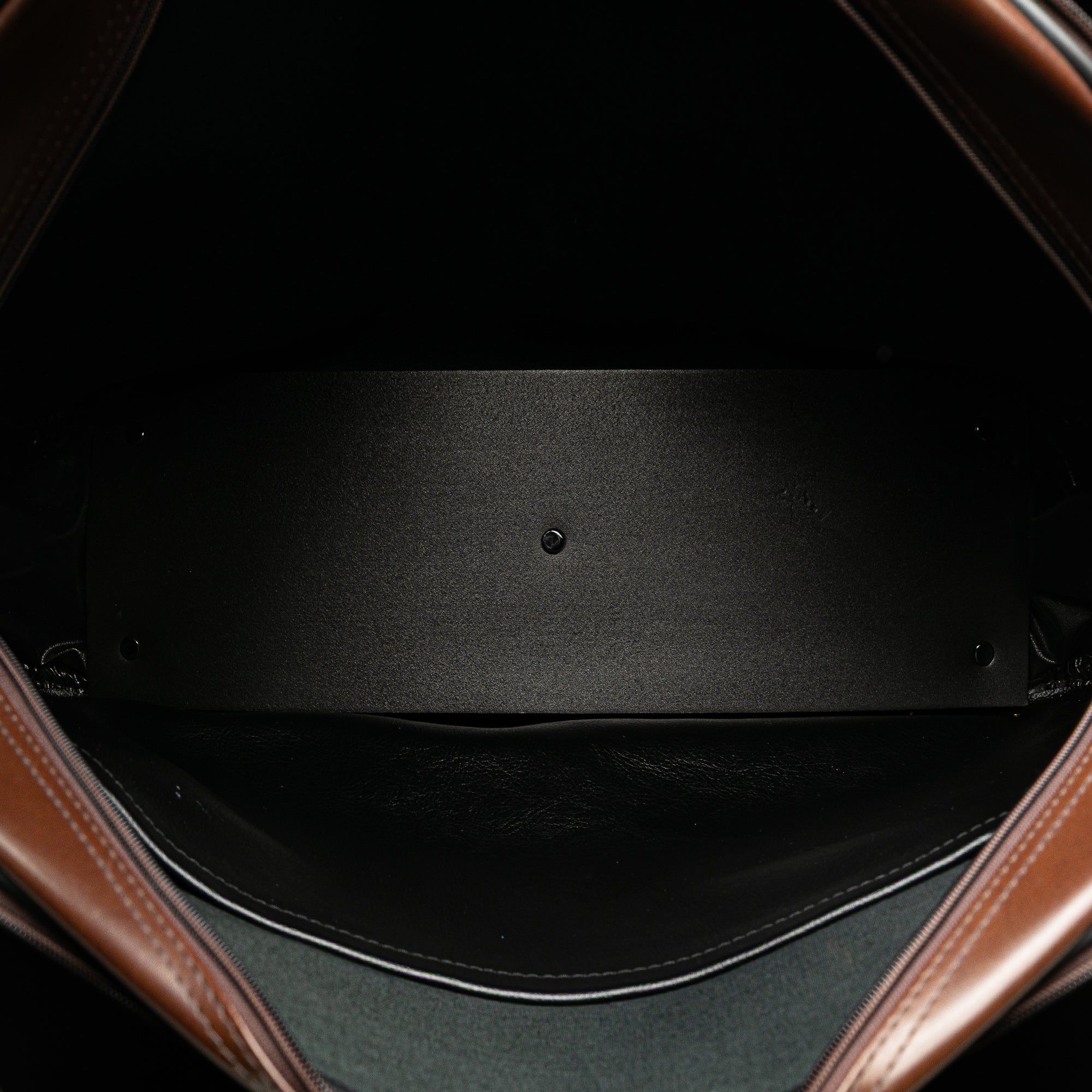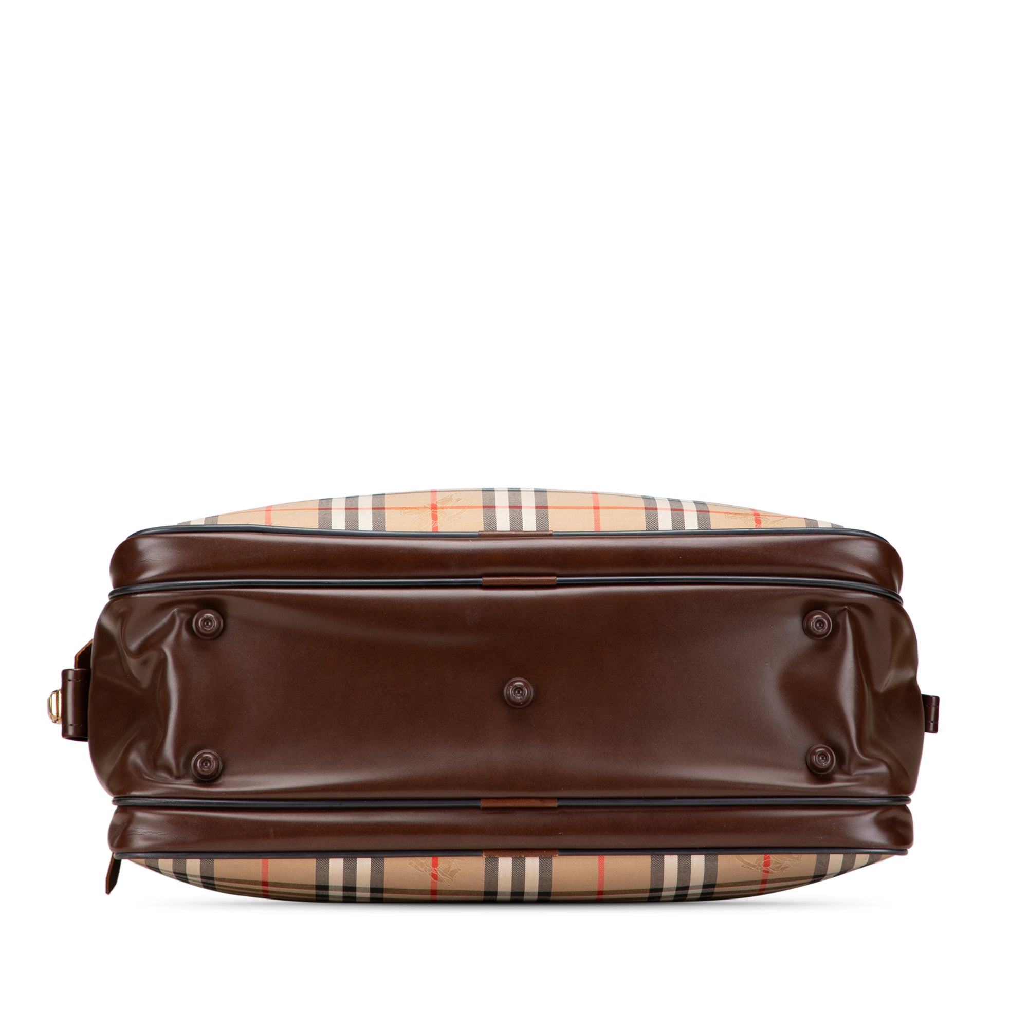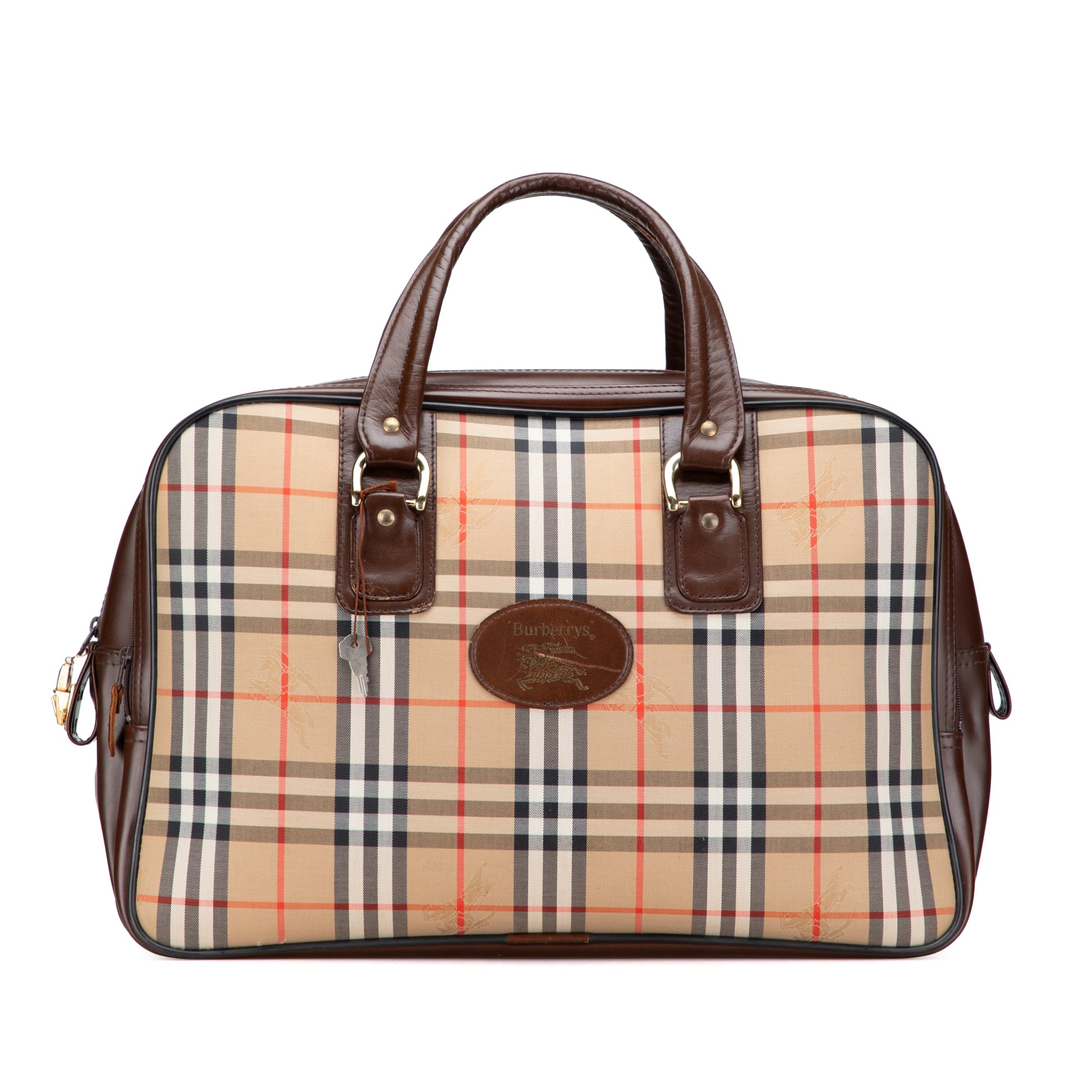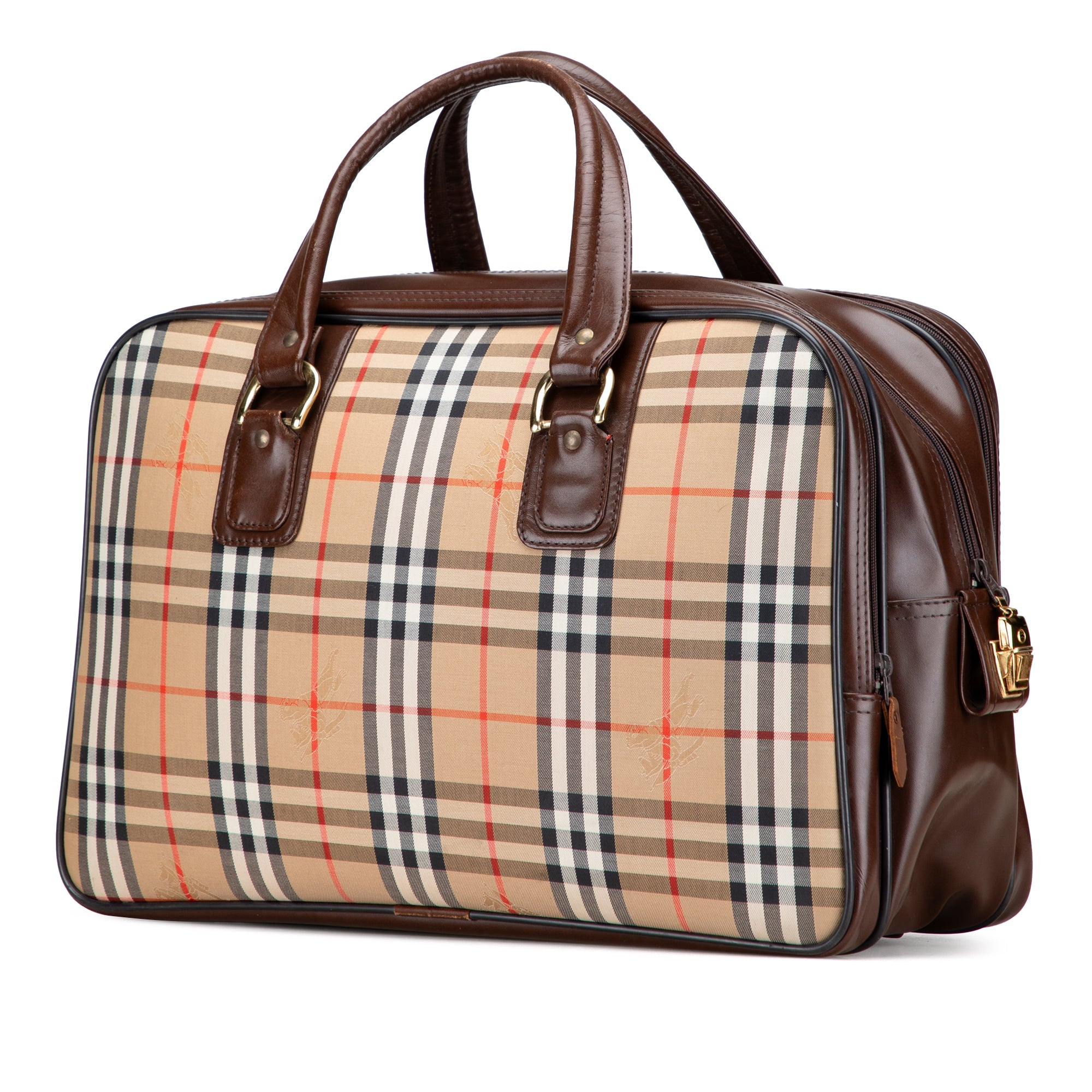 This travel bag features a haymarket check canvas body with leather trim, flat leather handles, triple compartments with top zip closures, and an interior slip pocket. Retail Price: 950.00
