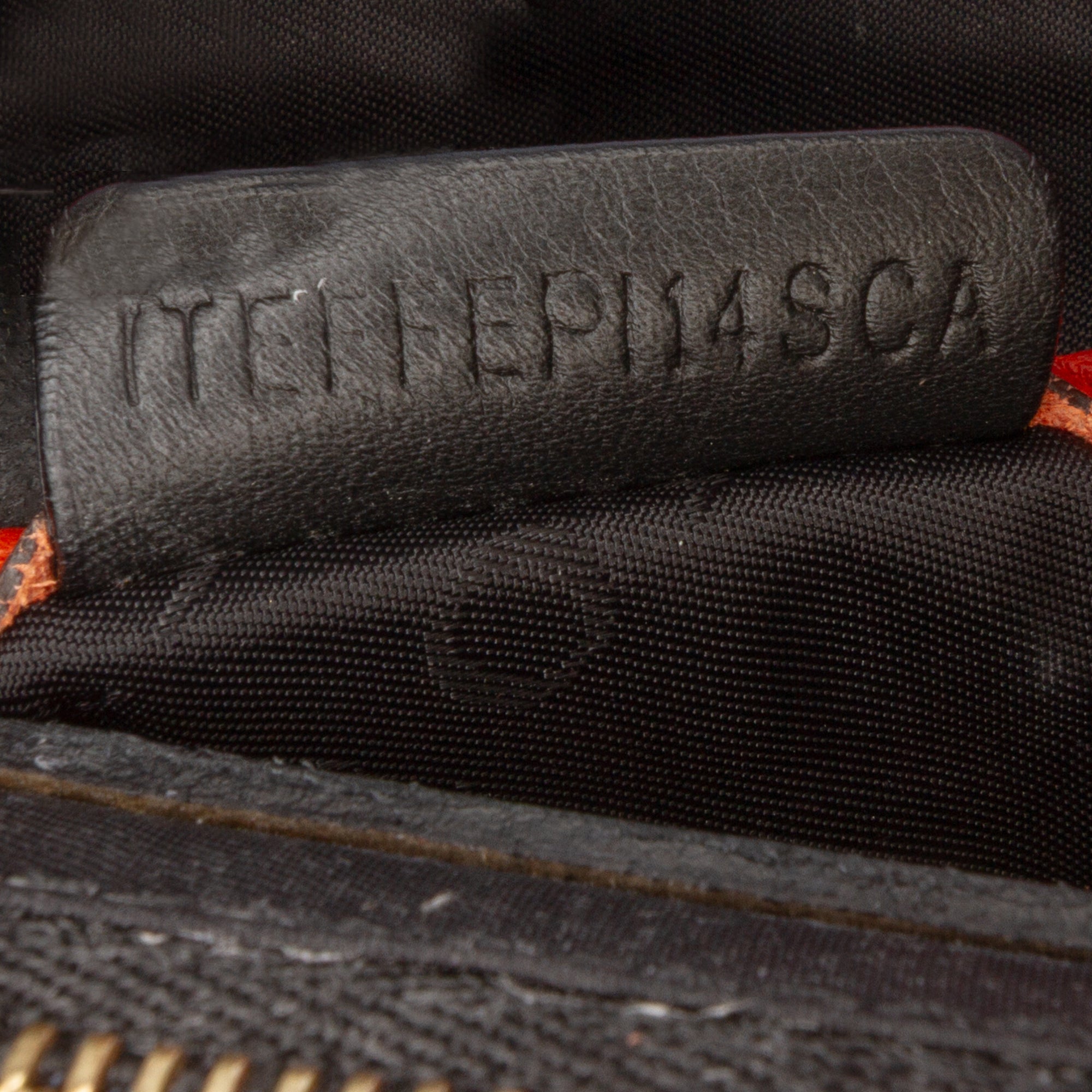 This clutch features a grained leather body with haymarket check coated canvas trim, a rolled leather wrist strap, a front flap with buckle details and snap closure, and interior zip and slip pockets. Inclusion: Dust bag. Retail Price: 500.00