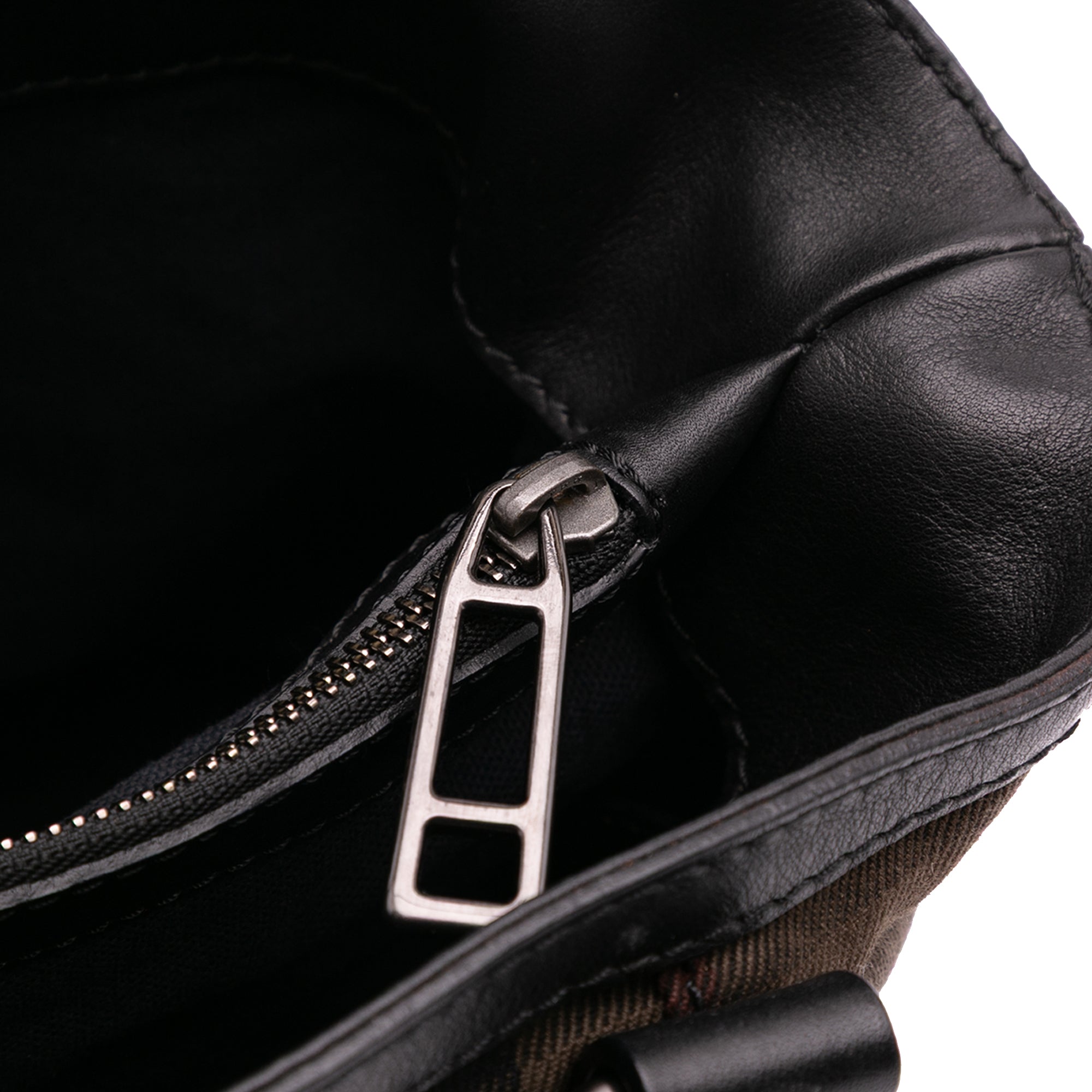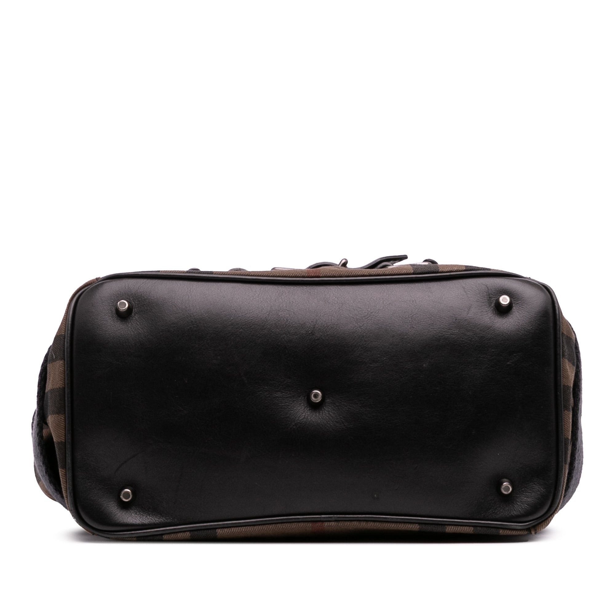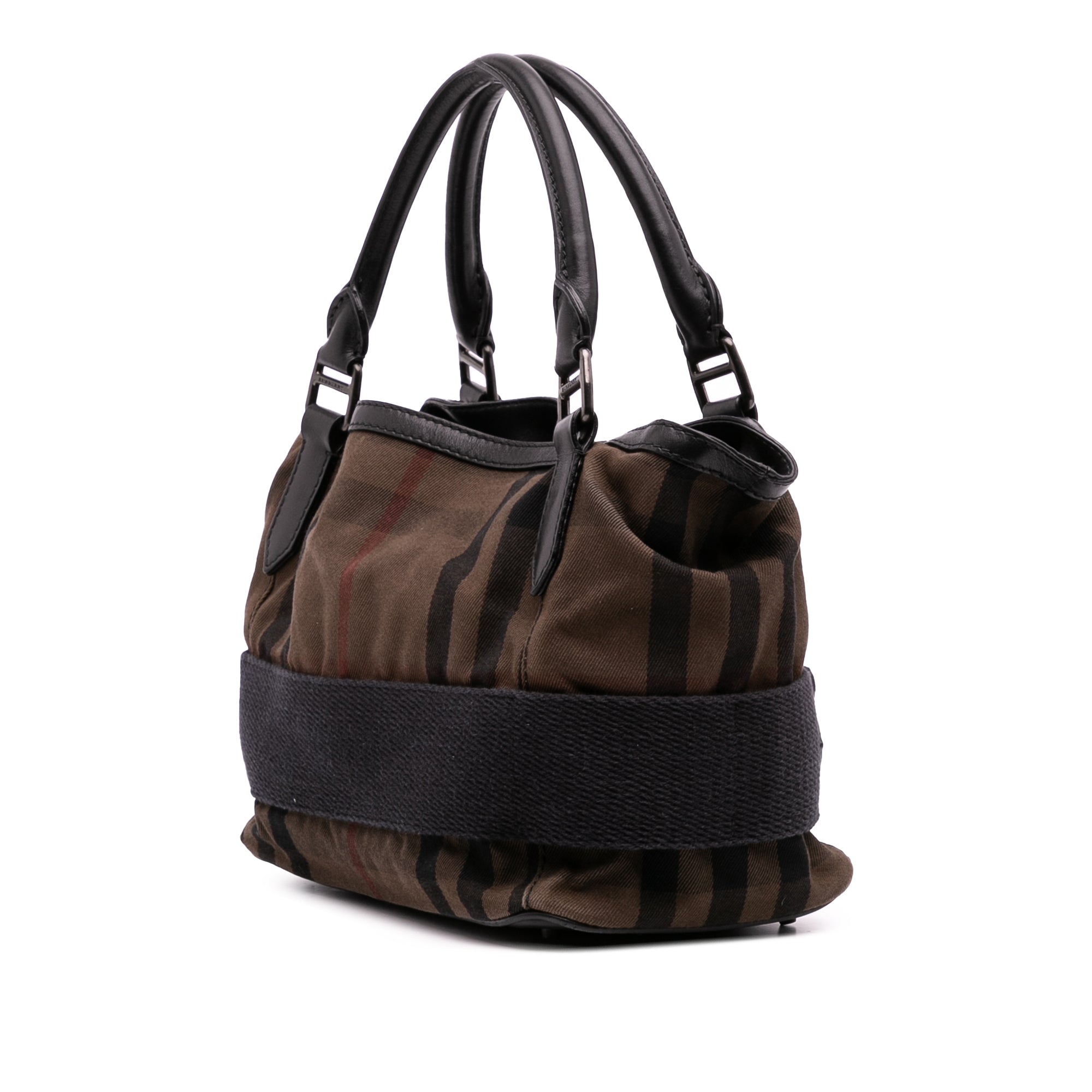 This satchel features a house check canvas body with leather trim and belt details, rolled leather top handles, a detachable and adjustable shoulder strap, an open top, an interior zip compartment, and an interior zip pocket. Retail Price: 845.00