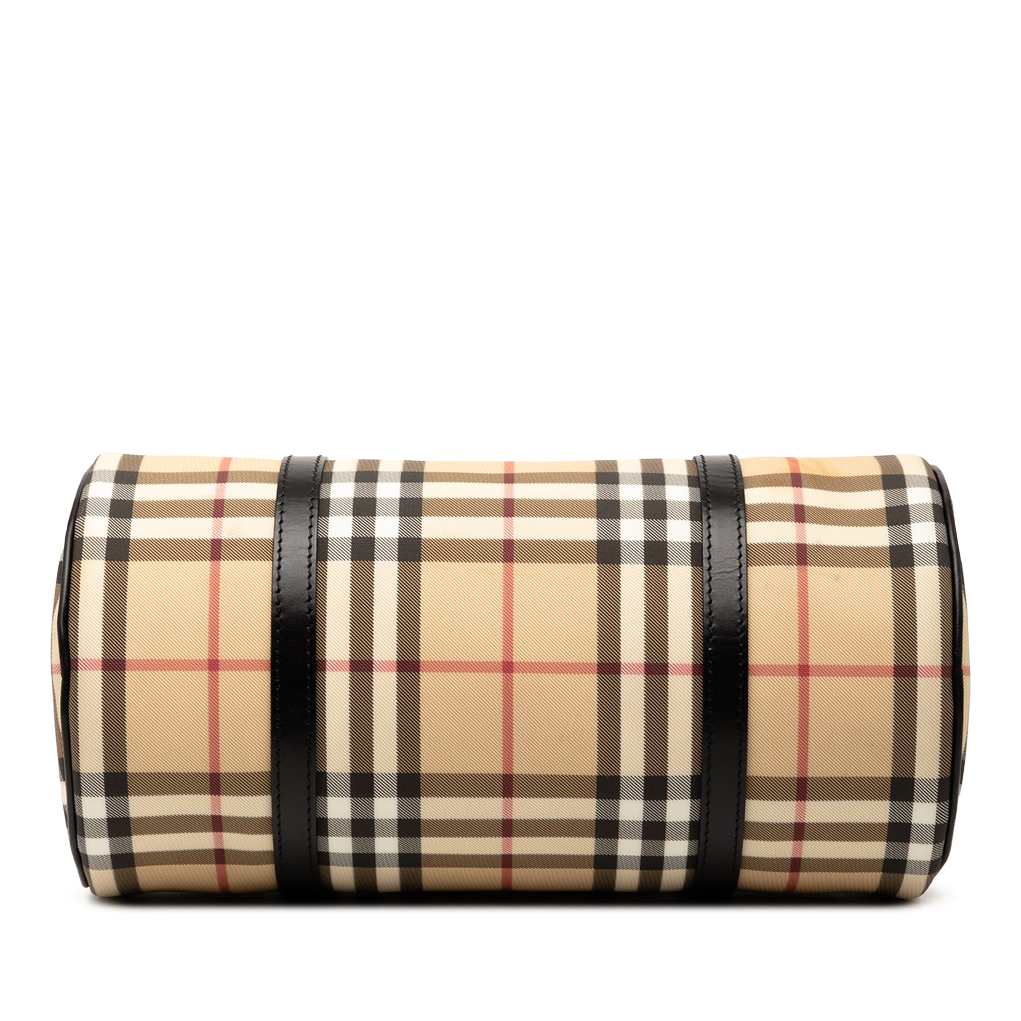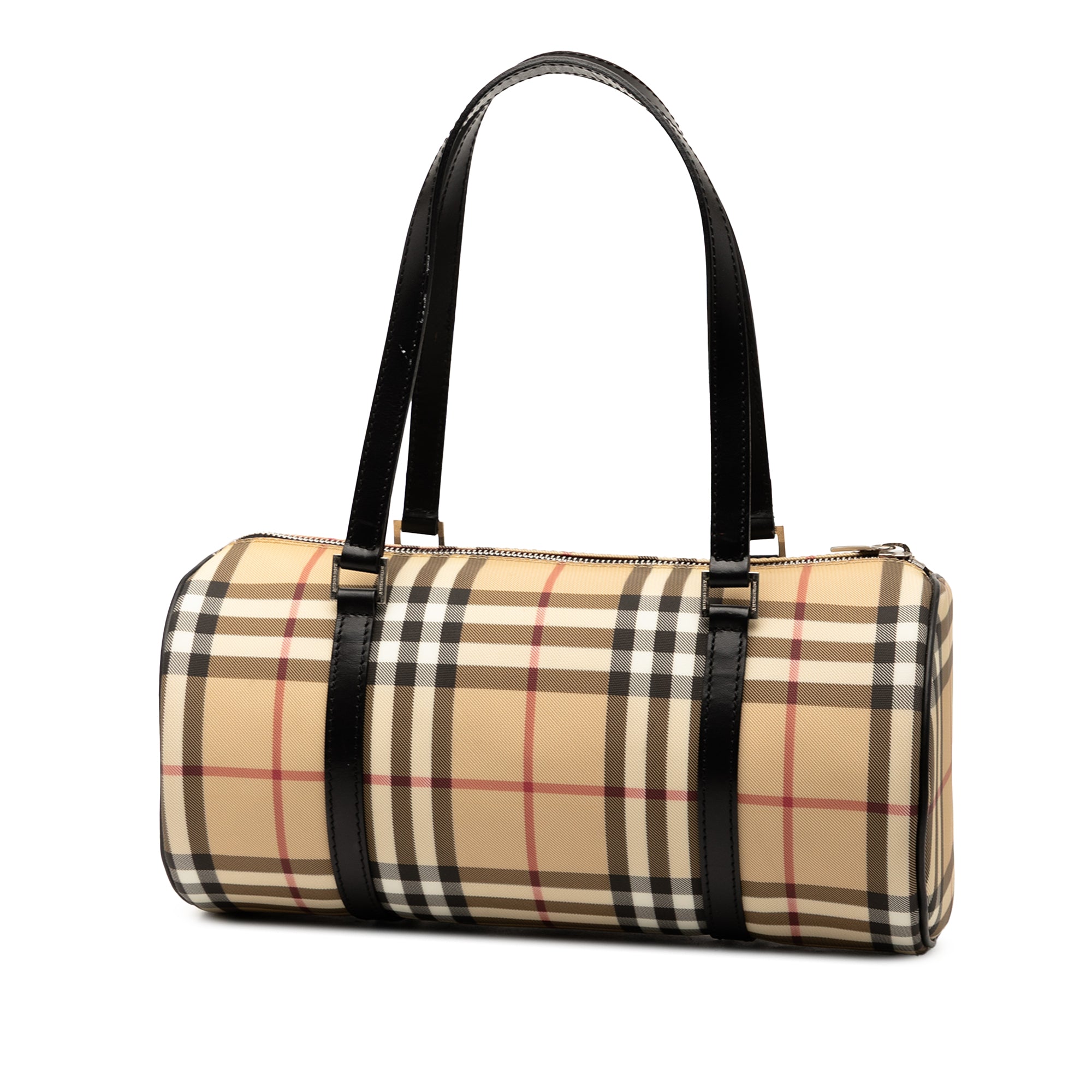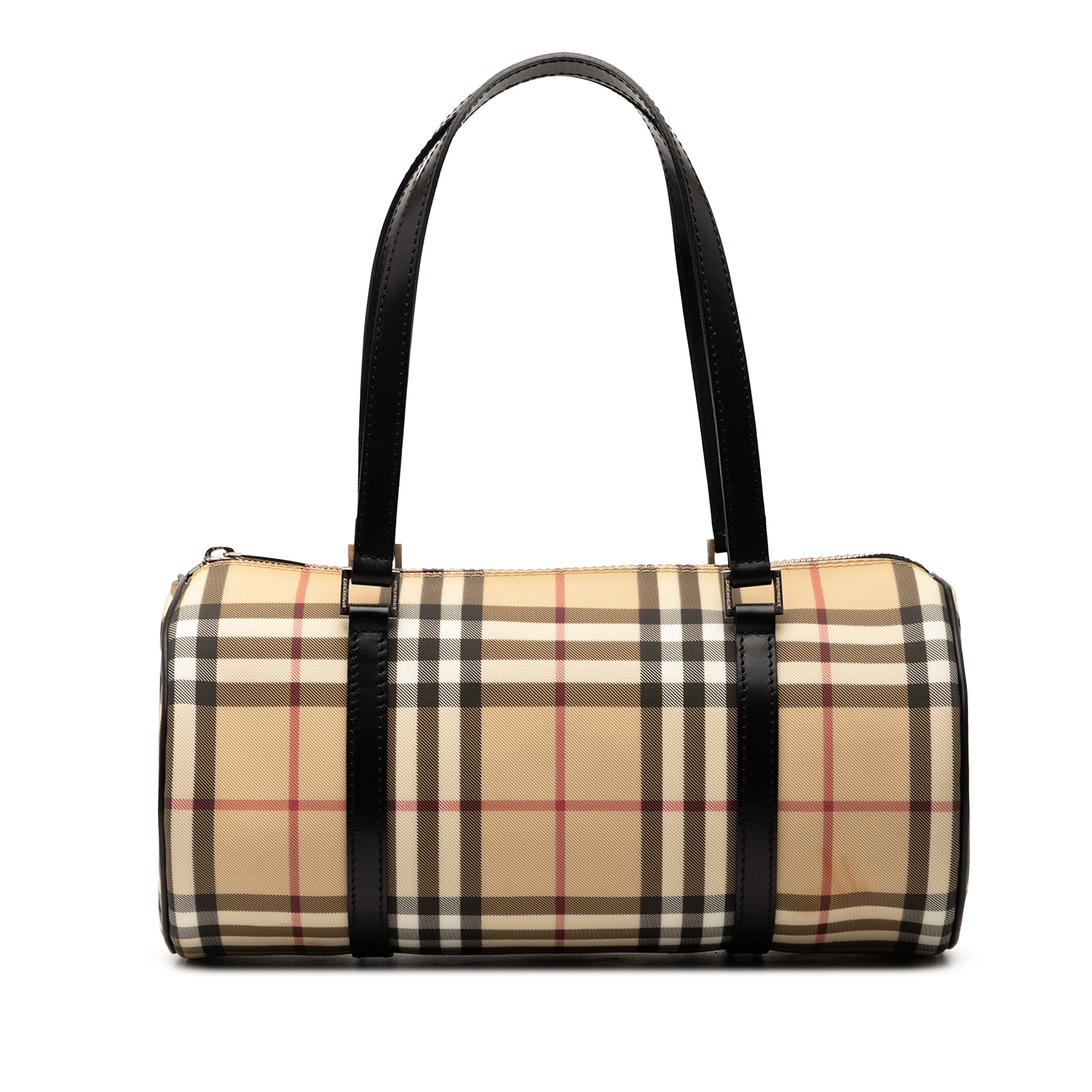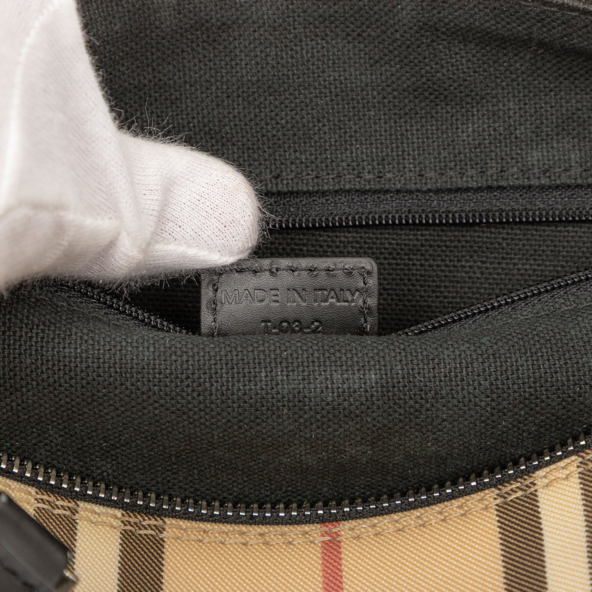 This handbag features a house check canvas body with leather trim, flat leather handles, a top zip closure, and an interior zip pocket. Retail Price: 700.00