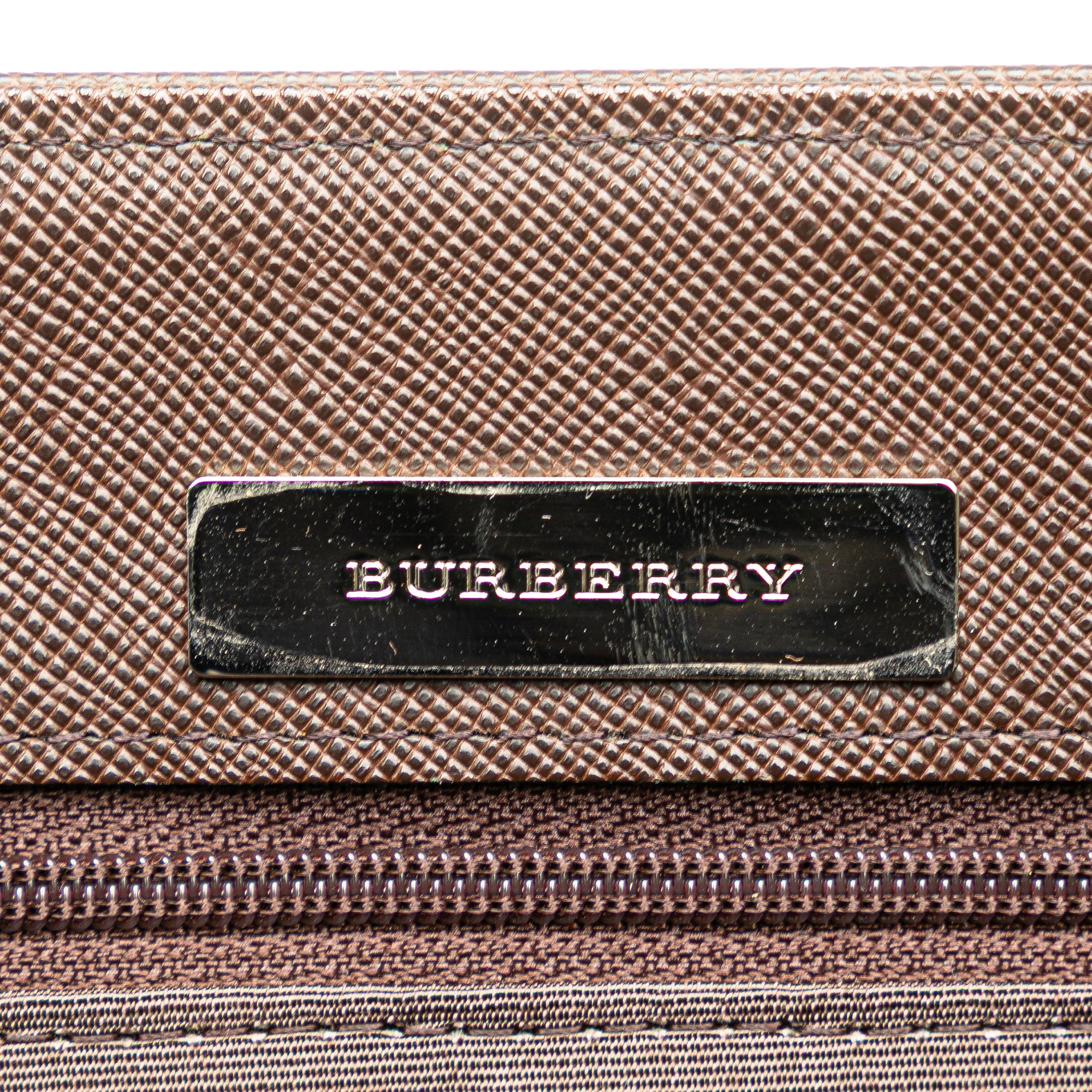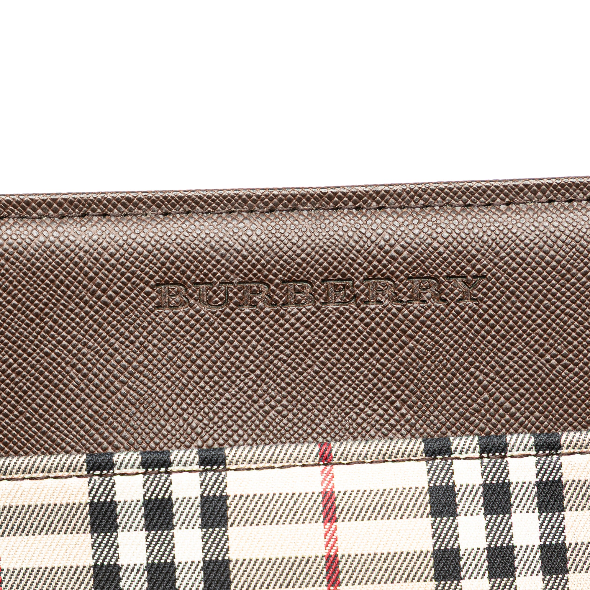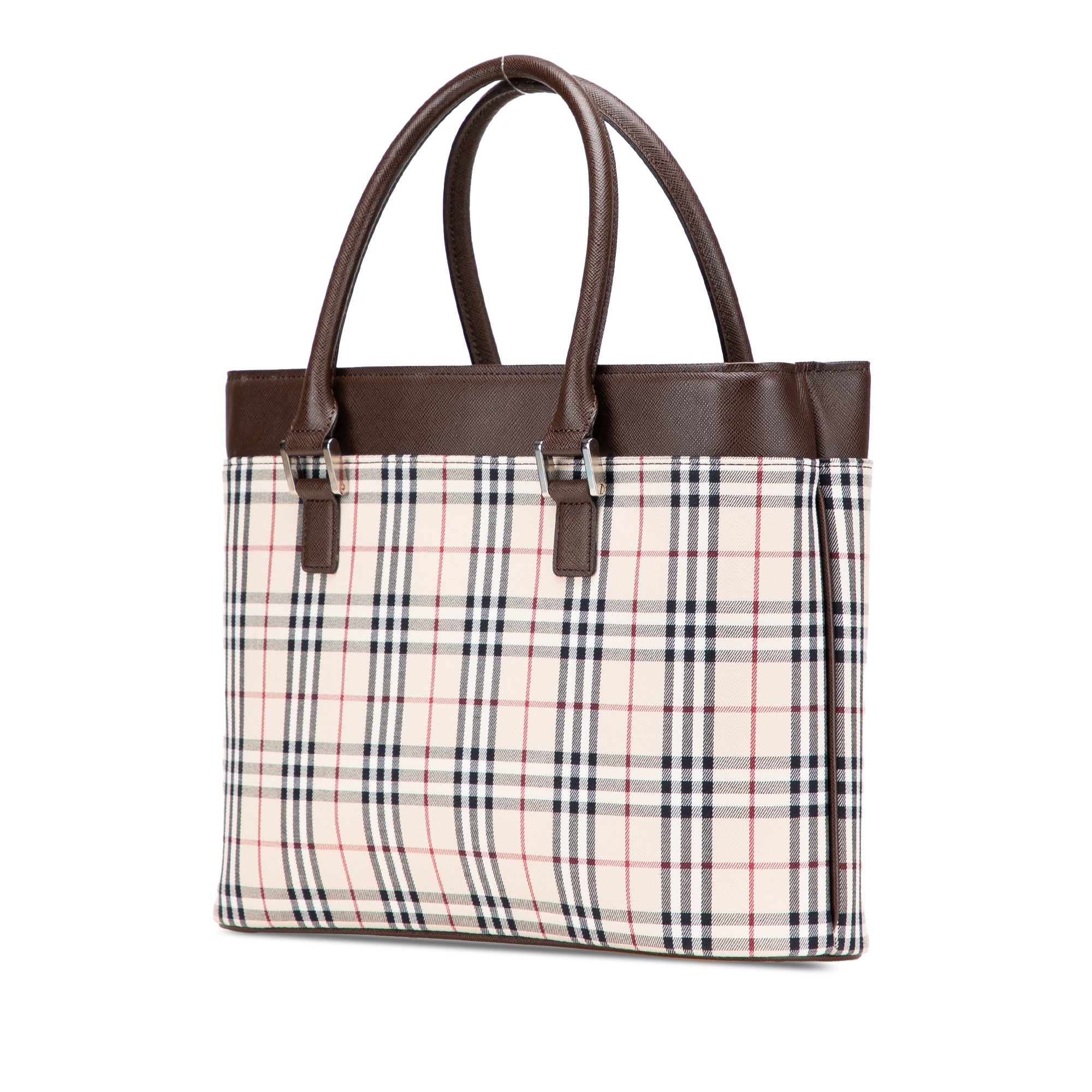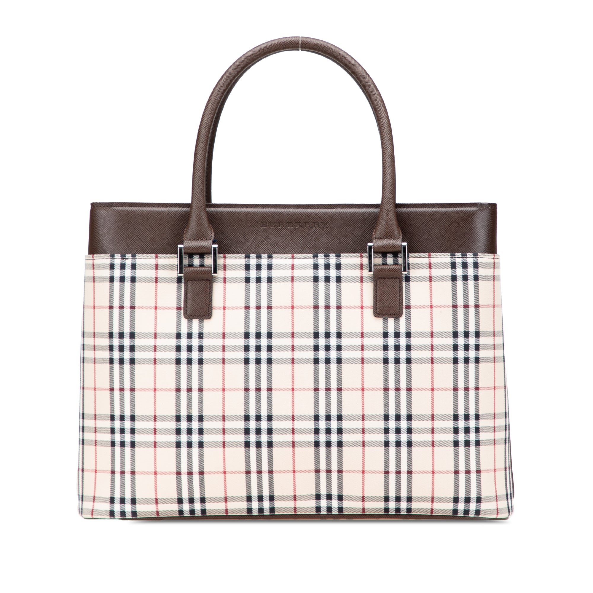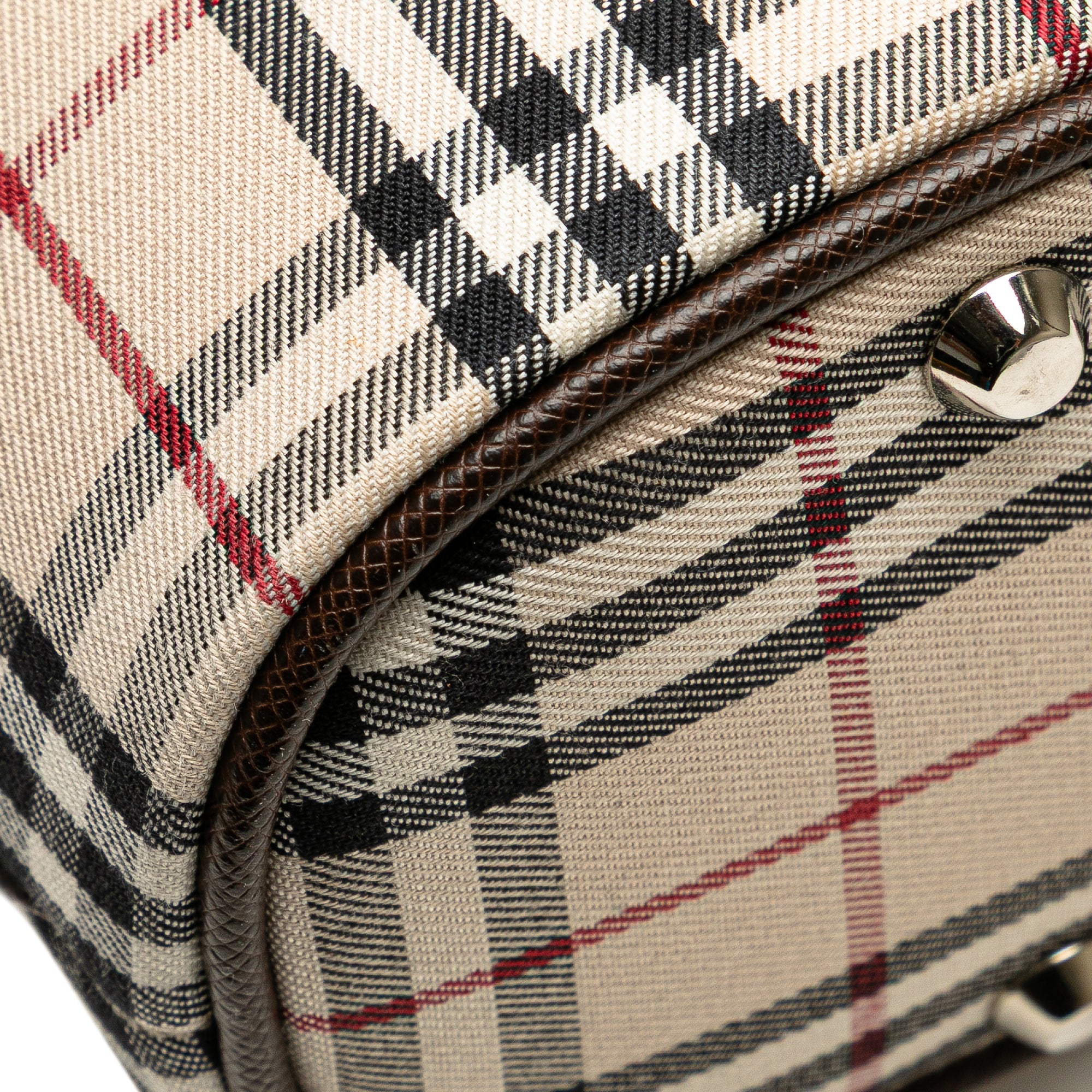 This handbag features a house check canvas body with leather trim, rolled leather handles, an open top, an interior zip compartment, and an interior zip pocket. Retail Price: 600.00