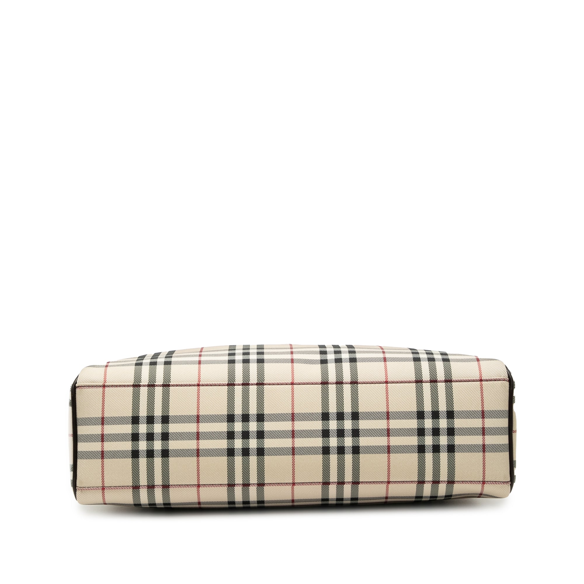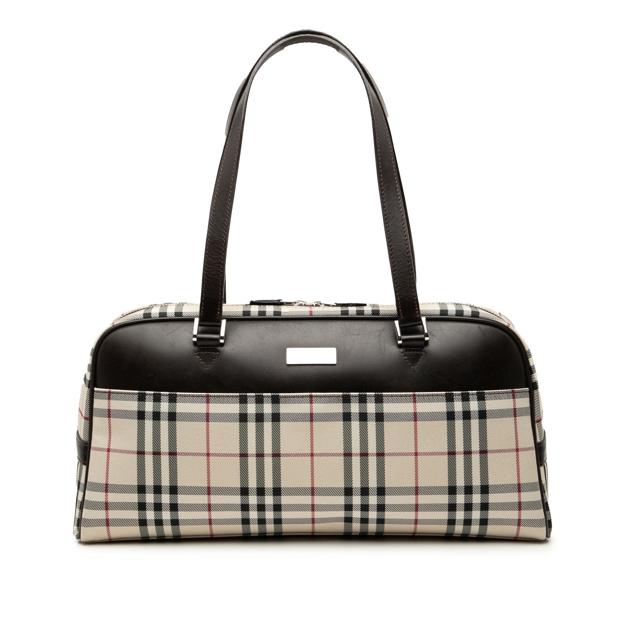 This handbag features a house check canvas body with leather trim, flat leather handles, a top zip closure, and interior zip and slip pockets. Retail Price: 880.00