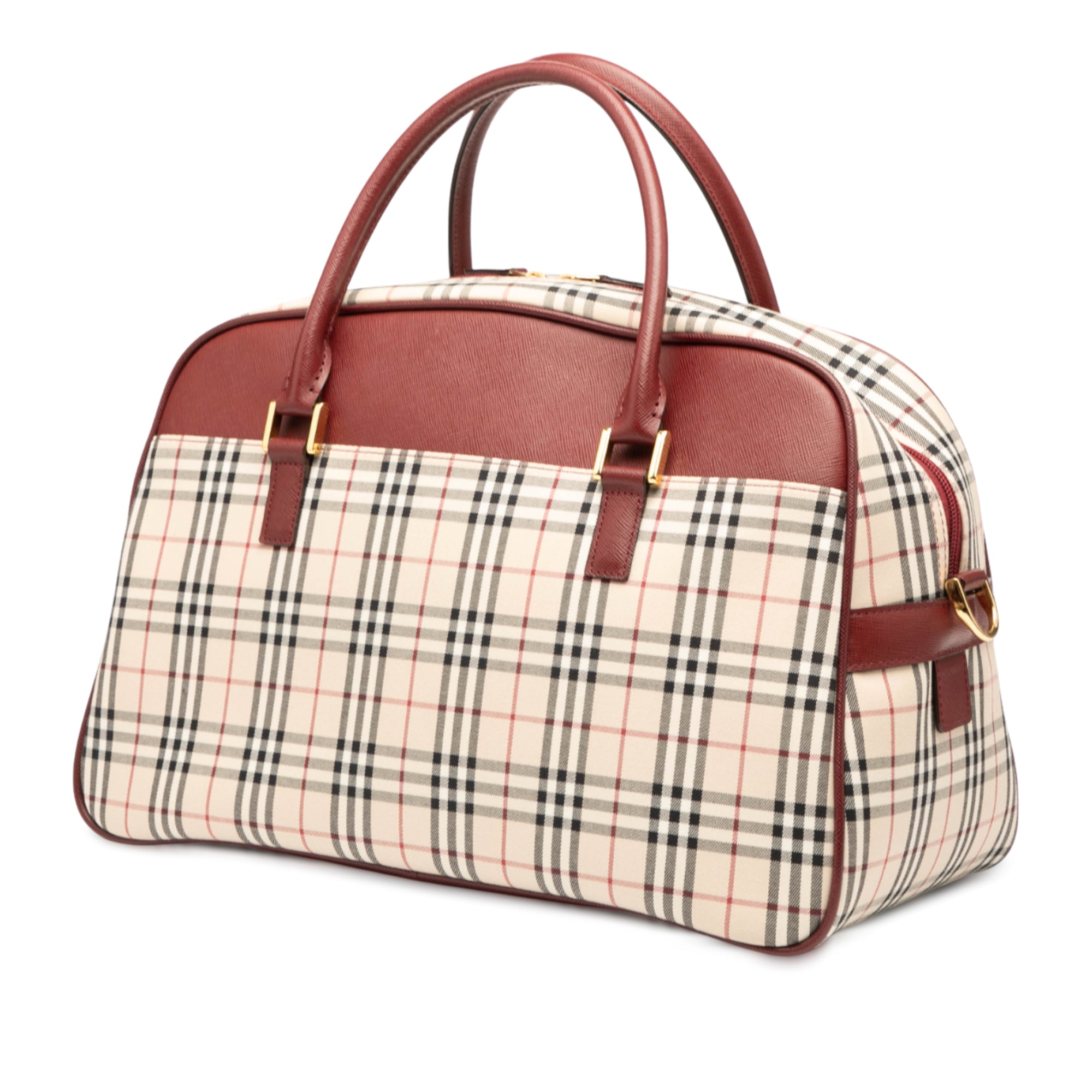 This satchel features a house check canvas body with leather trim, rolled leather top handles, a detachable and adjustable flat shoulder strap with leather guard, a top zip around closure, and exterior slip pocket, and an interior zip and slip pockets. Retail Price: 850.00