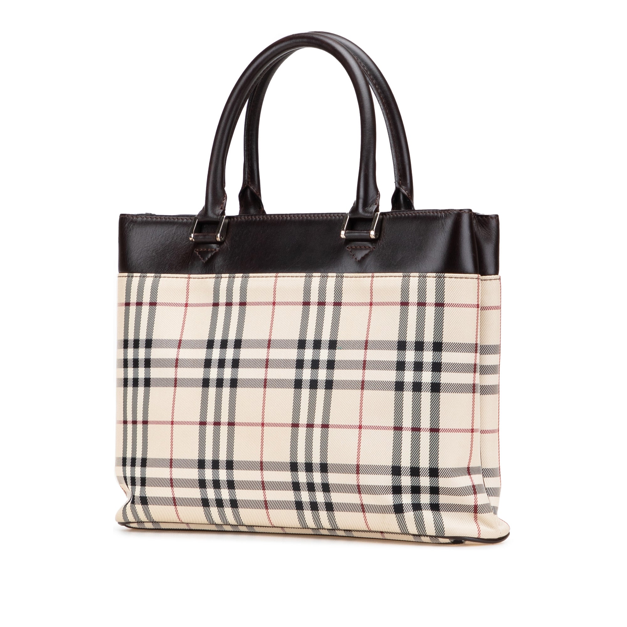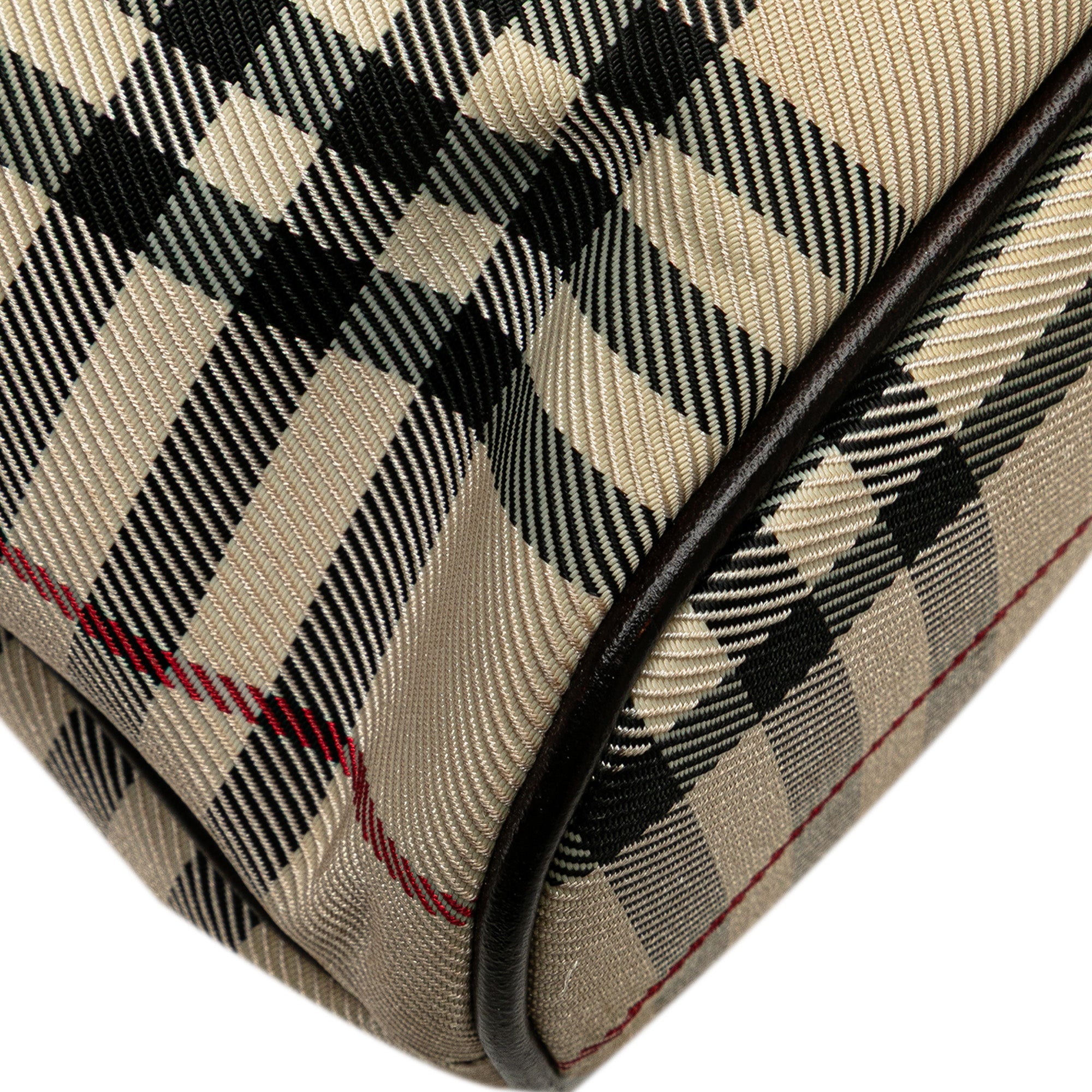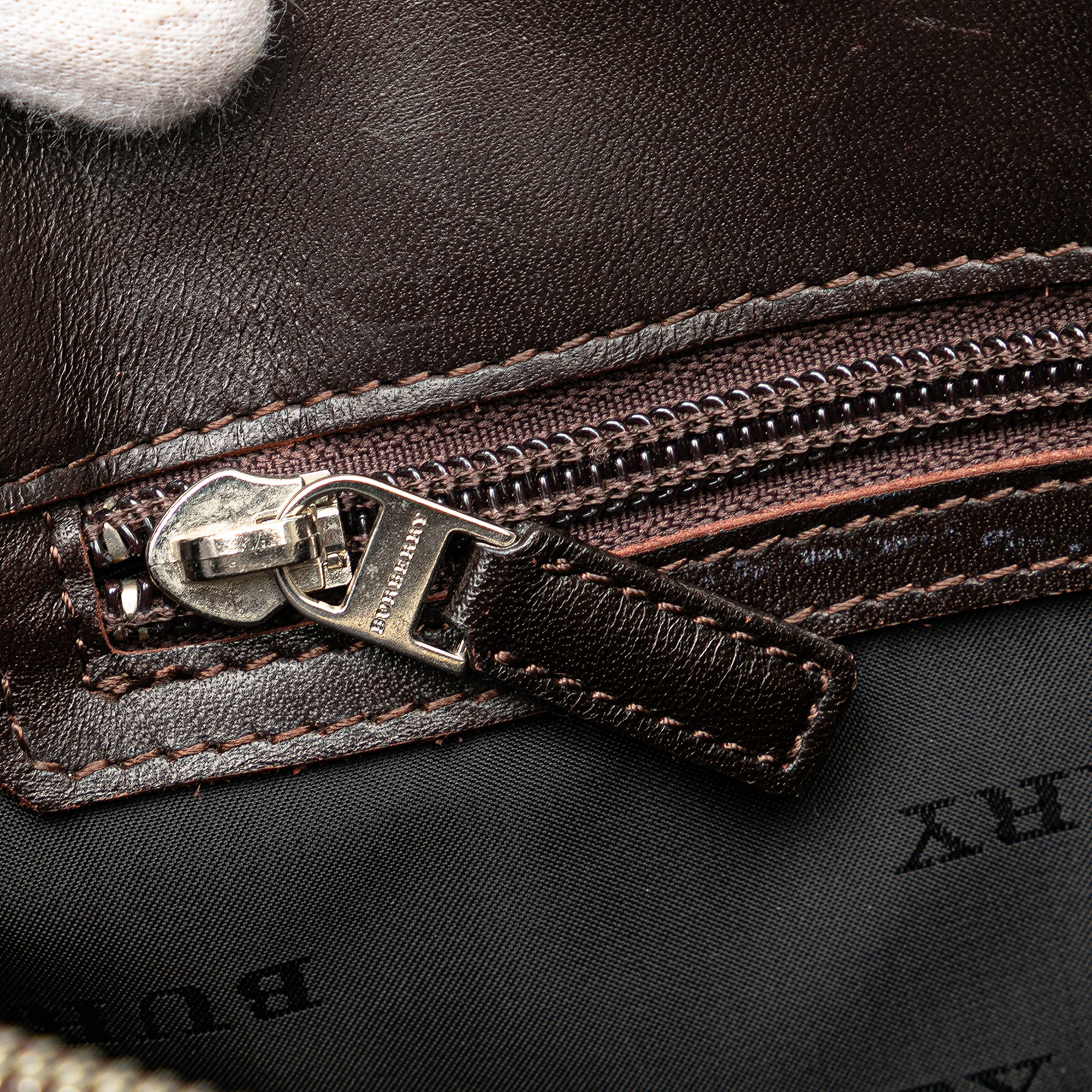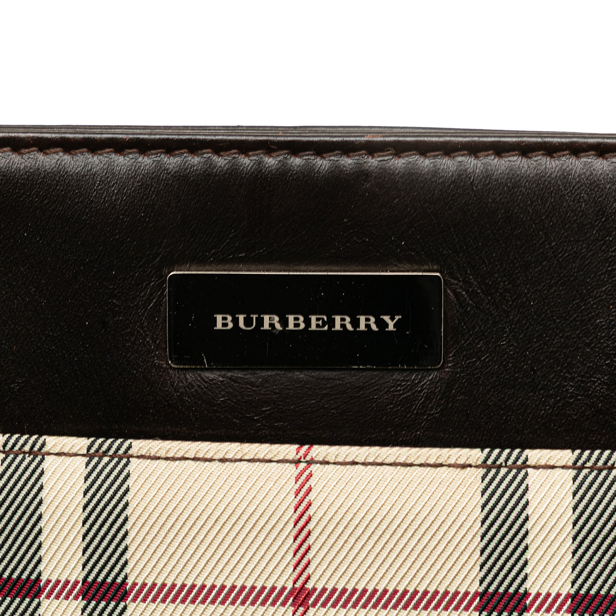 This tote features a house check canvas body with leather trim, rolled leather handles, a top zip closure, and an exterior front slip compartment. Retail Price: 800.00