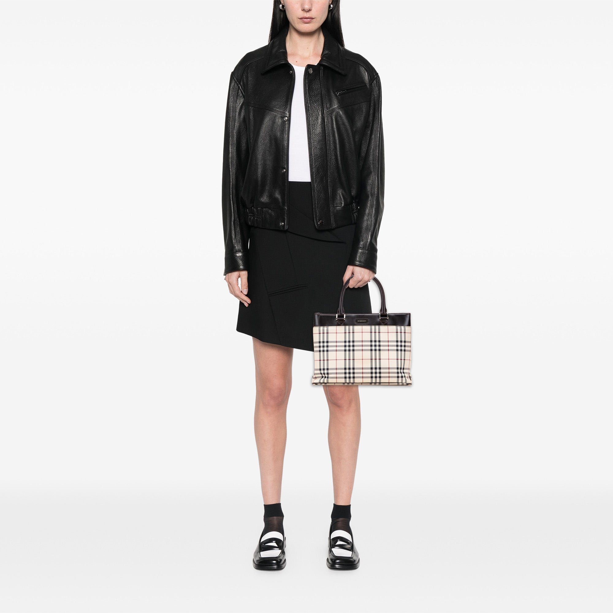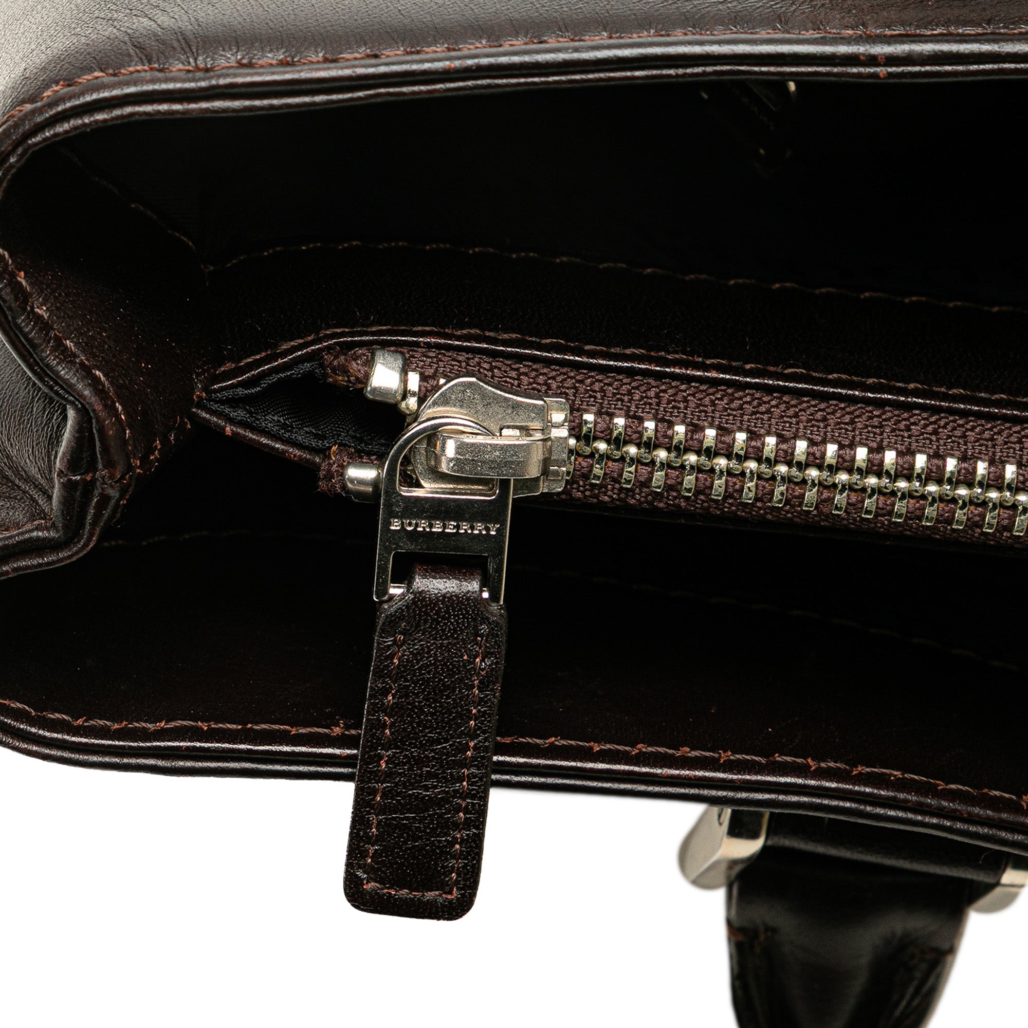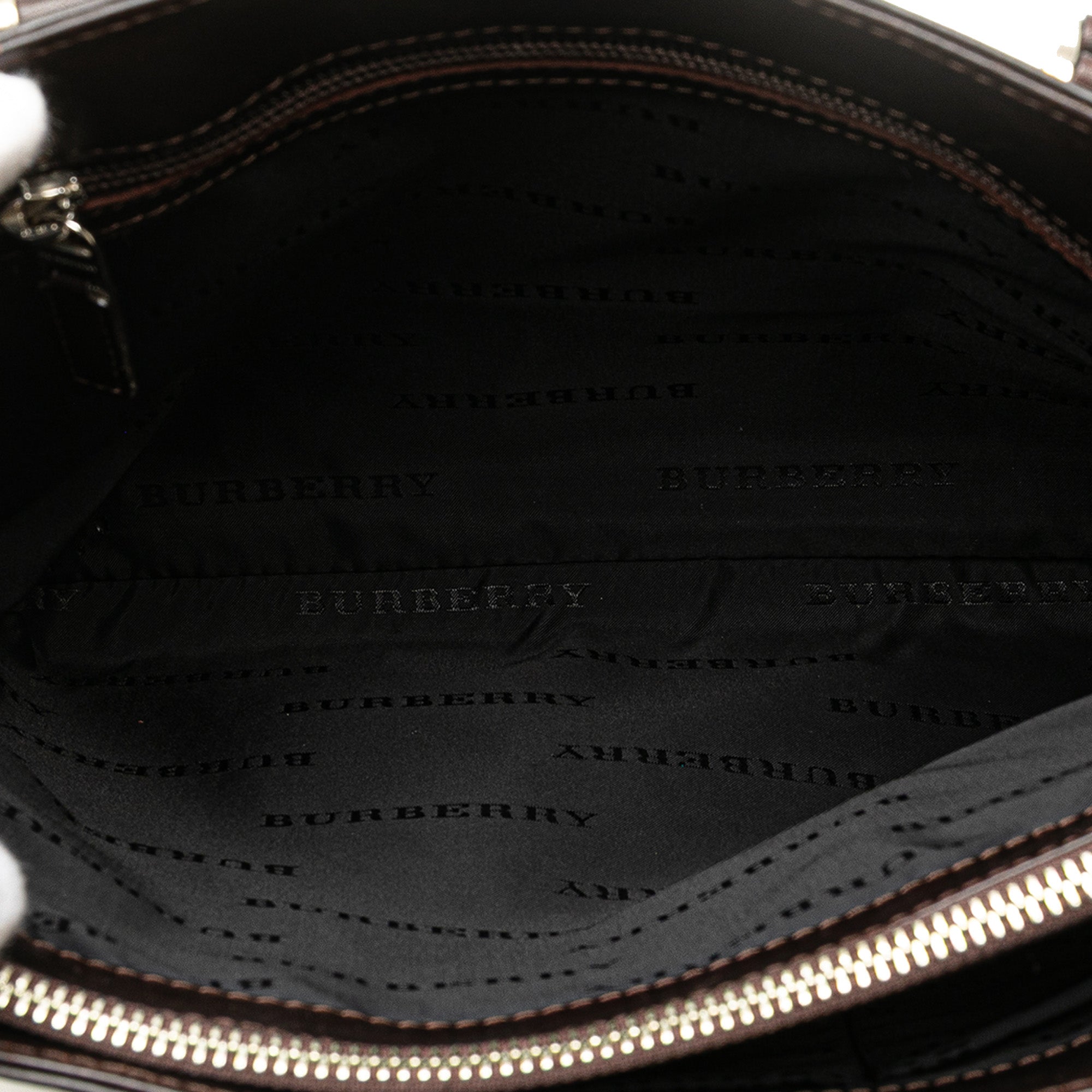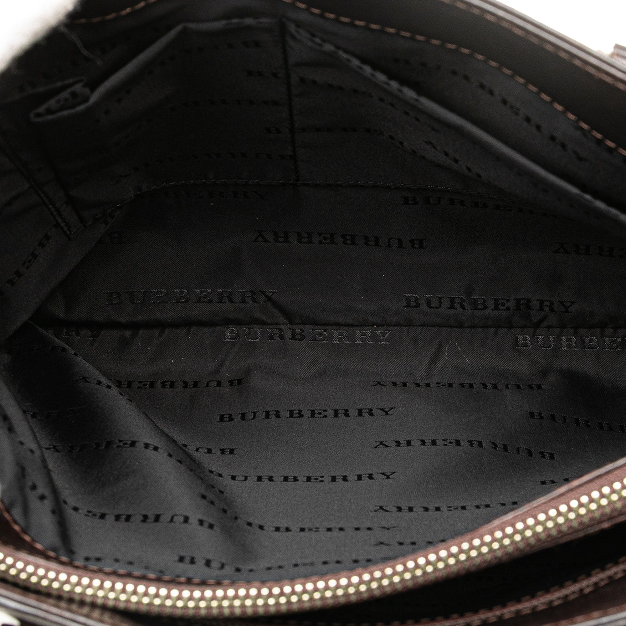 This tote features a house check canvas body with leather trim, rolled leather handles, a top zip closure, and an exterior front slip compartment. Retail Price: 800.00