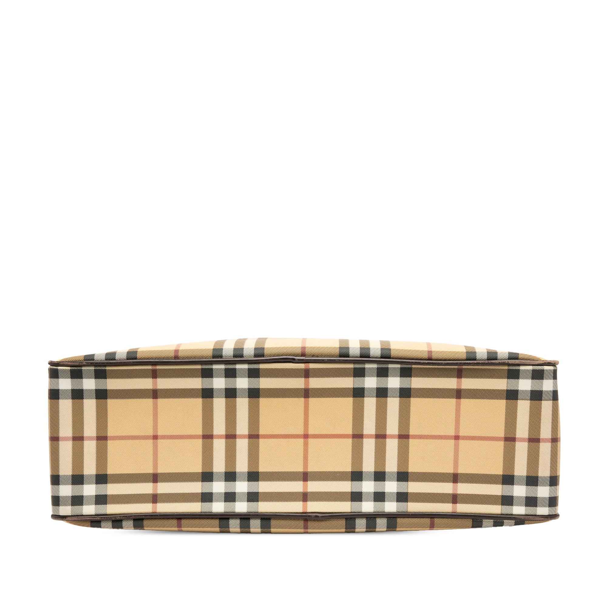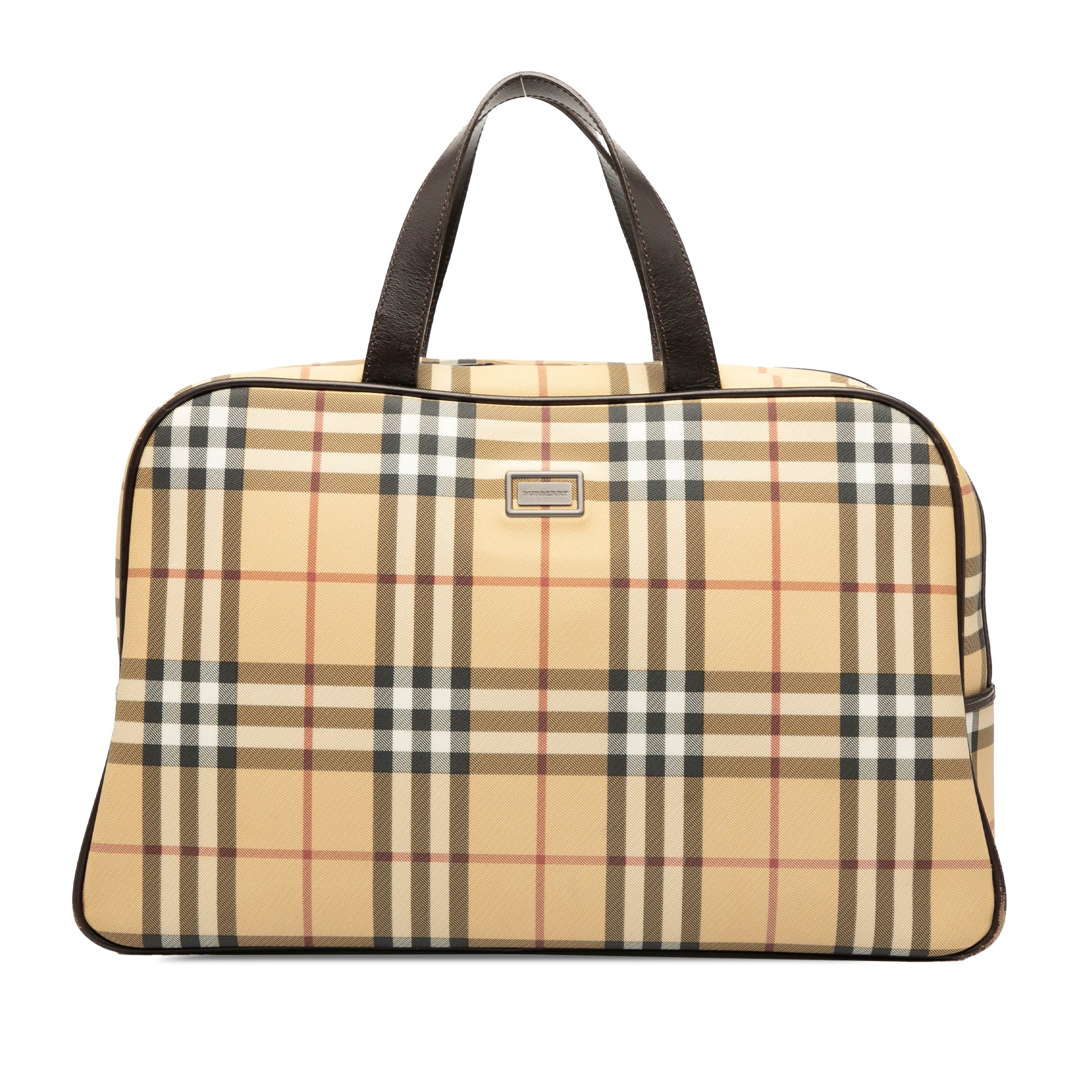 This travel bag features a house check canvas body with leather trim, flat leather handles, a top zip closure. an exterior slip pocket, and interior zip and slip pockets. Retail Price: 350.00