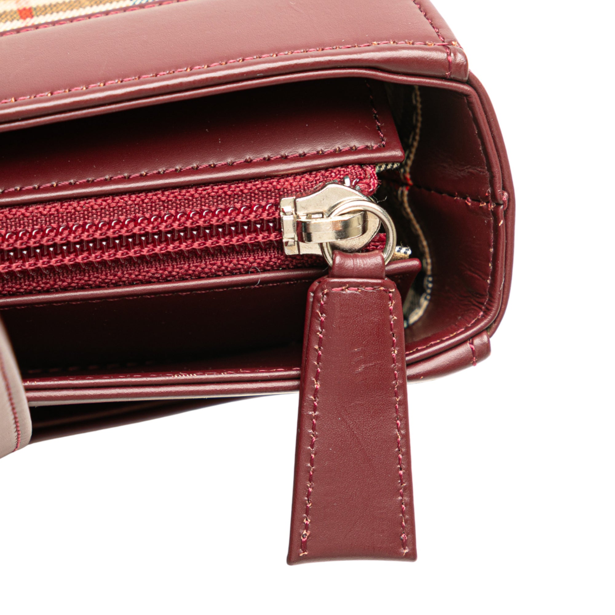 This handbag features a leather body with house check canvas trim, flat leather handles, a top zip closure, an exterior back slip pocket and interior zip and slip pockets. Retail Price: 845.00