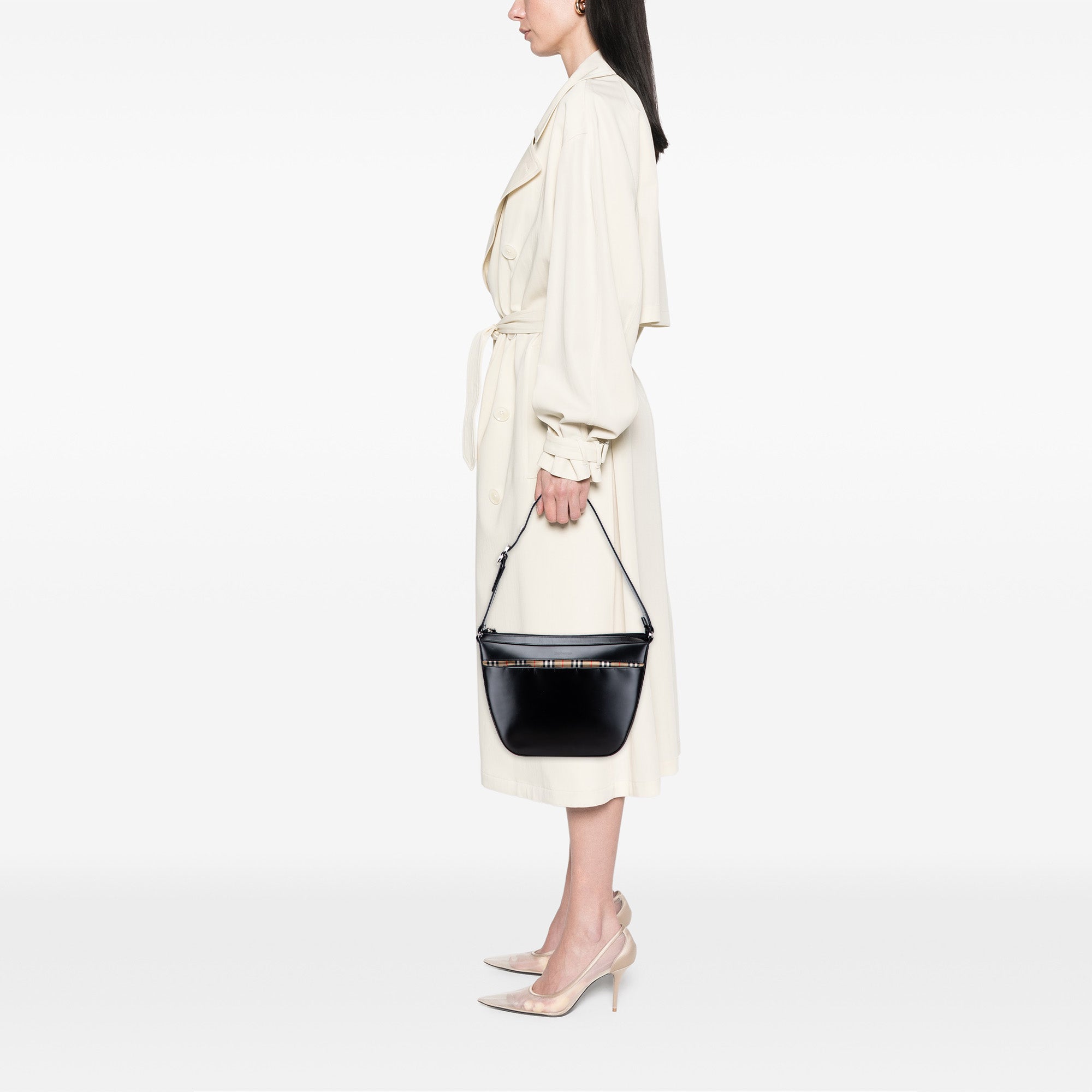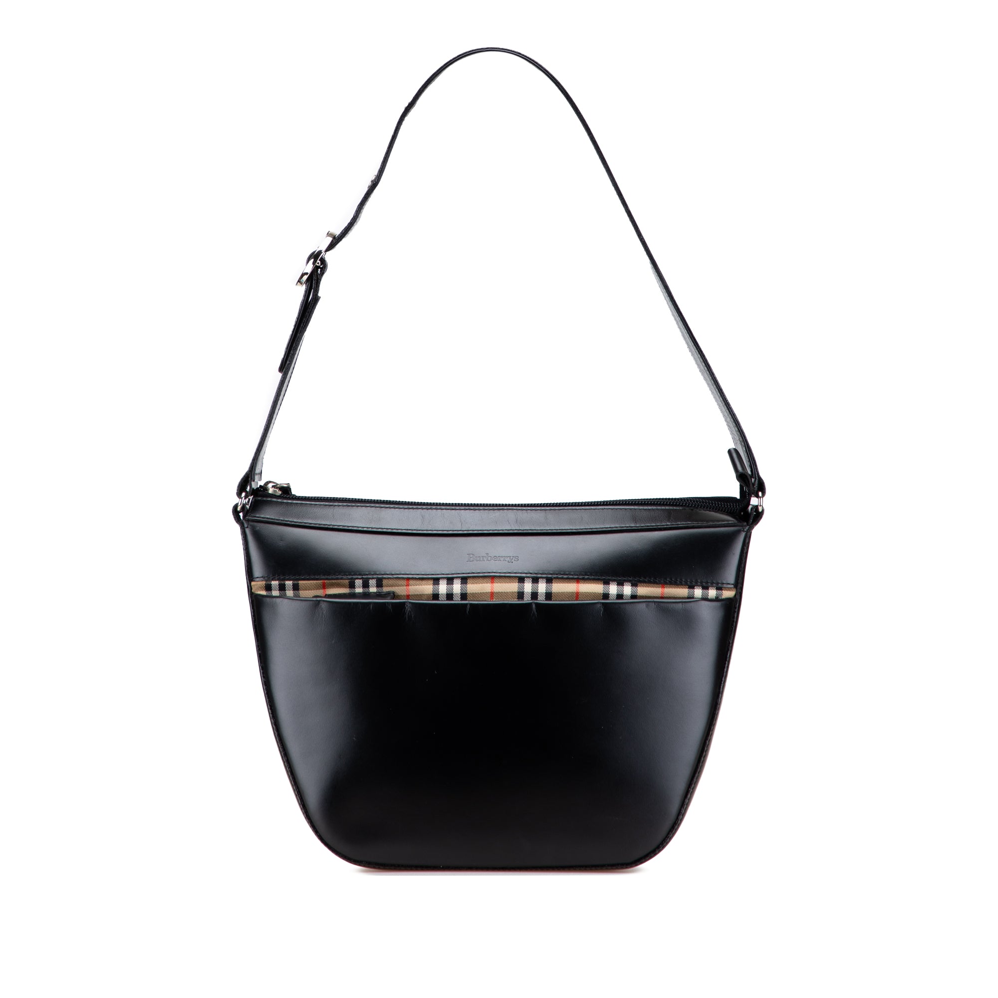 This shoulder bag features a leather body with house check canvas trim, an adjustable flat leather strap, a top zip closure, an exterior front slip pocket, and interior zip and slip pockets. Retail Price: 1125.00