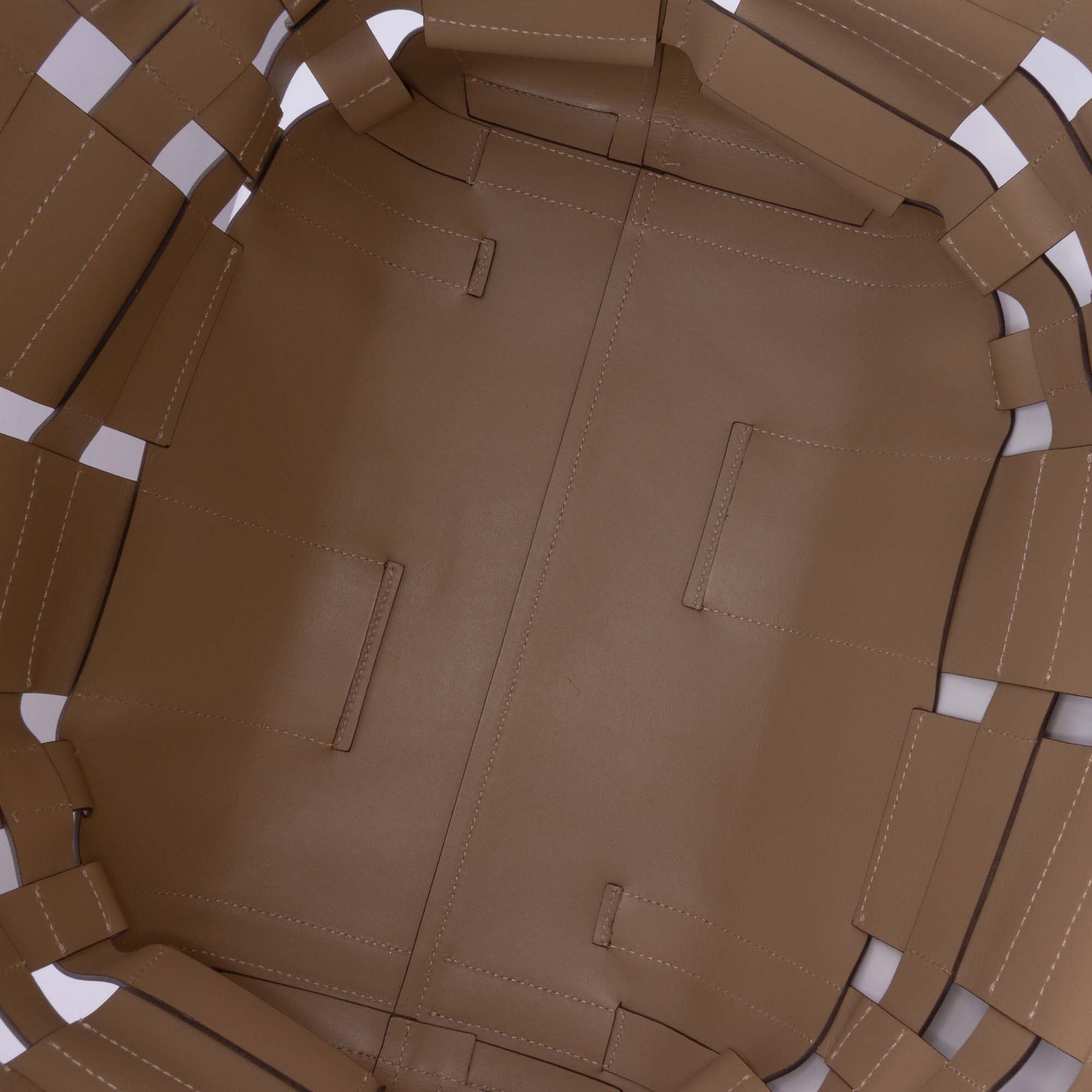 The Foster Tote features a woven leather body, flat handles, an open top, and a detachable interior pouch with drawstring closure. Retail Price: 1320.00