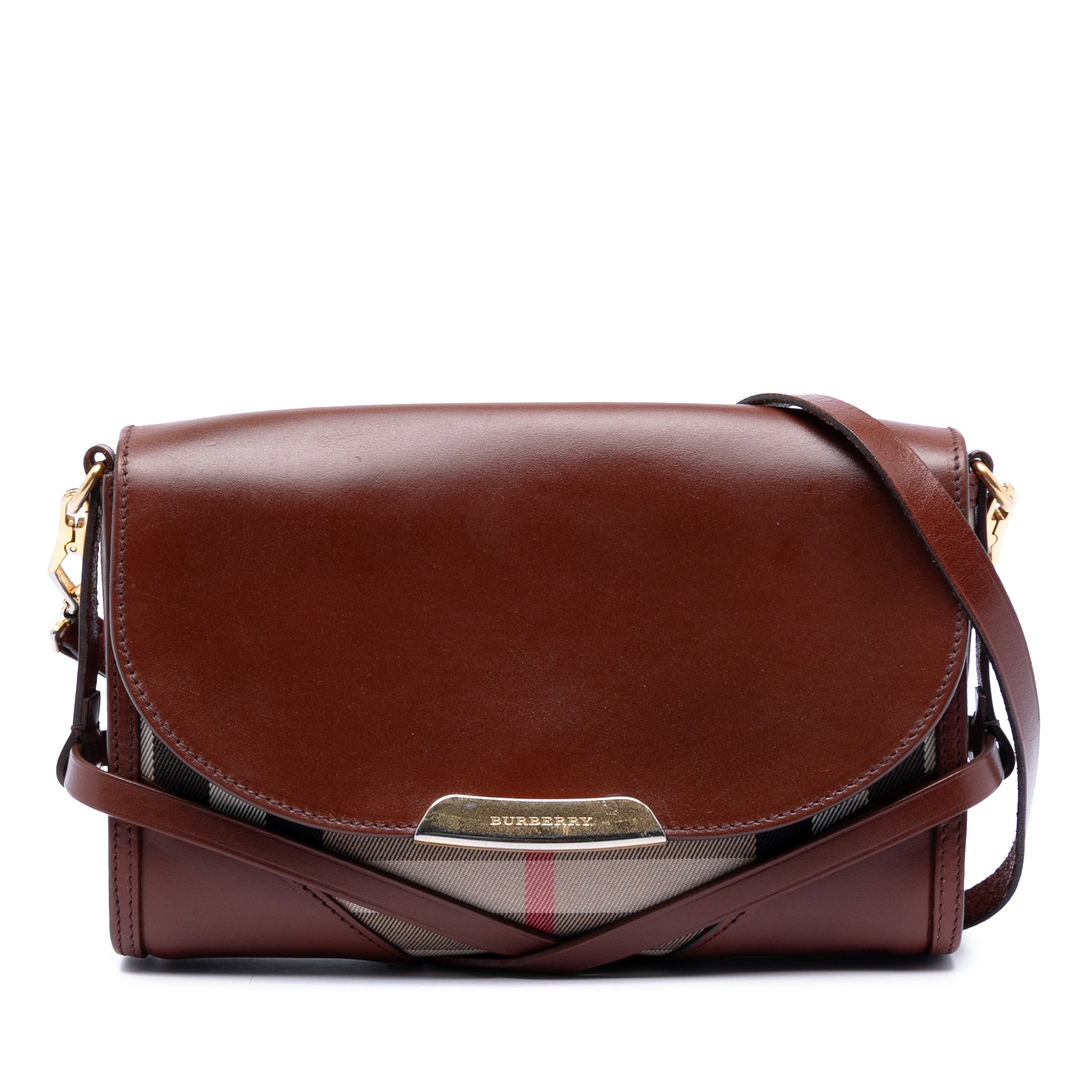 This crossbody bag features a leather and house check canvas body, an adjustable flat strap, a top leather flap with magnetic snap closure, and interior zip and slip pockets. Retail Price: 1000.00