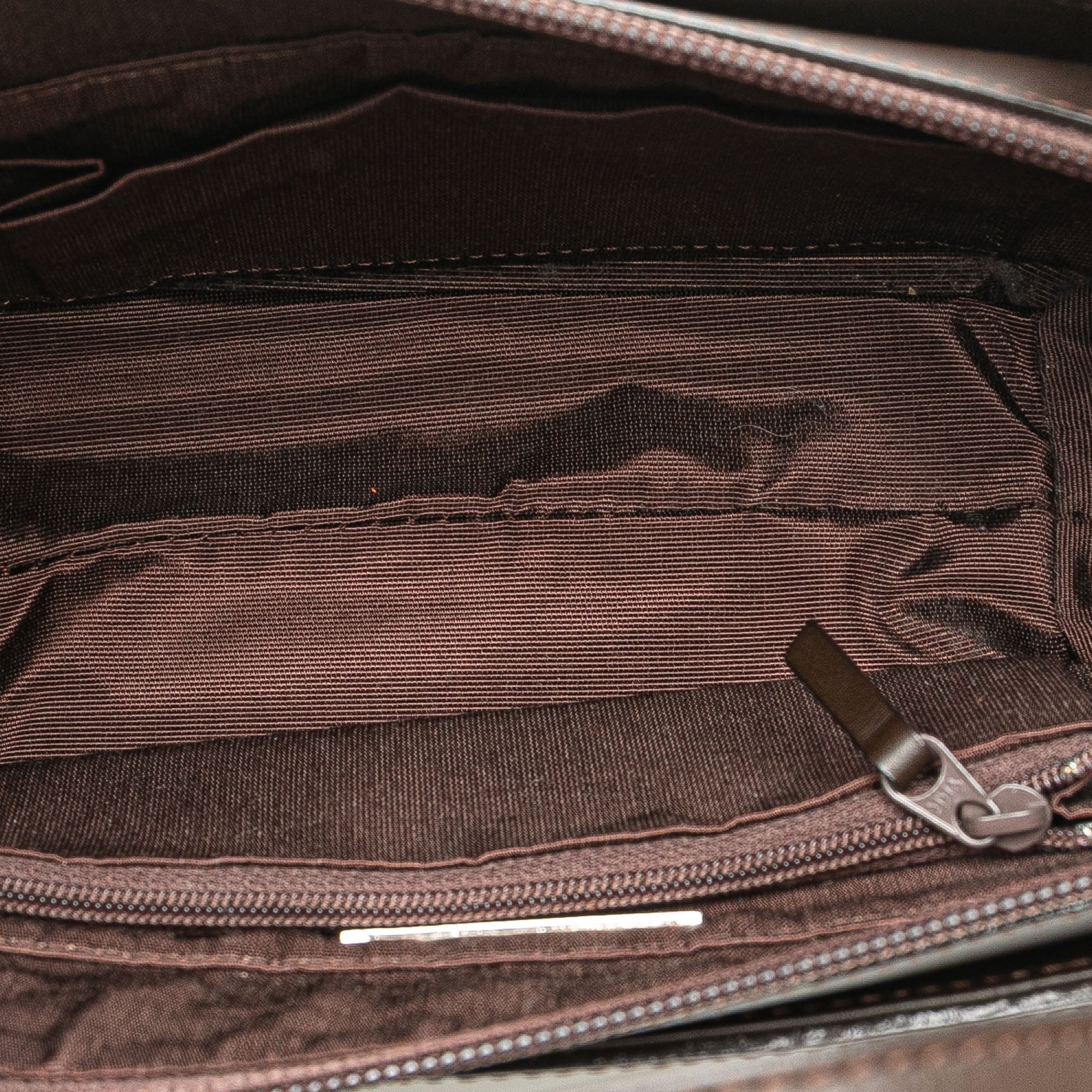 This handbag features a leather body with suede side panels, flat leather handles, a top zip closure, and interior zip and slip pockets. Retail Price: 550.00