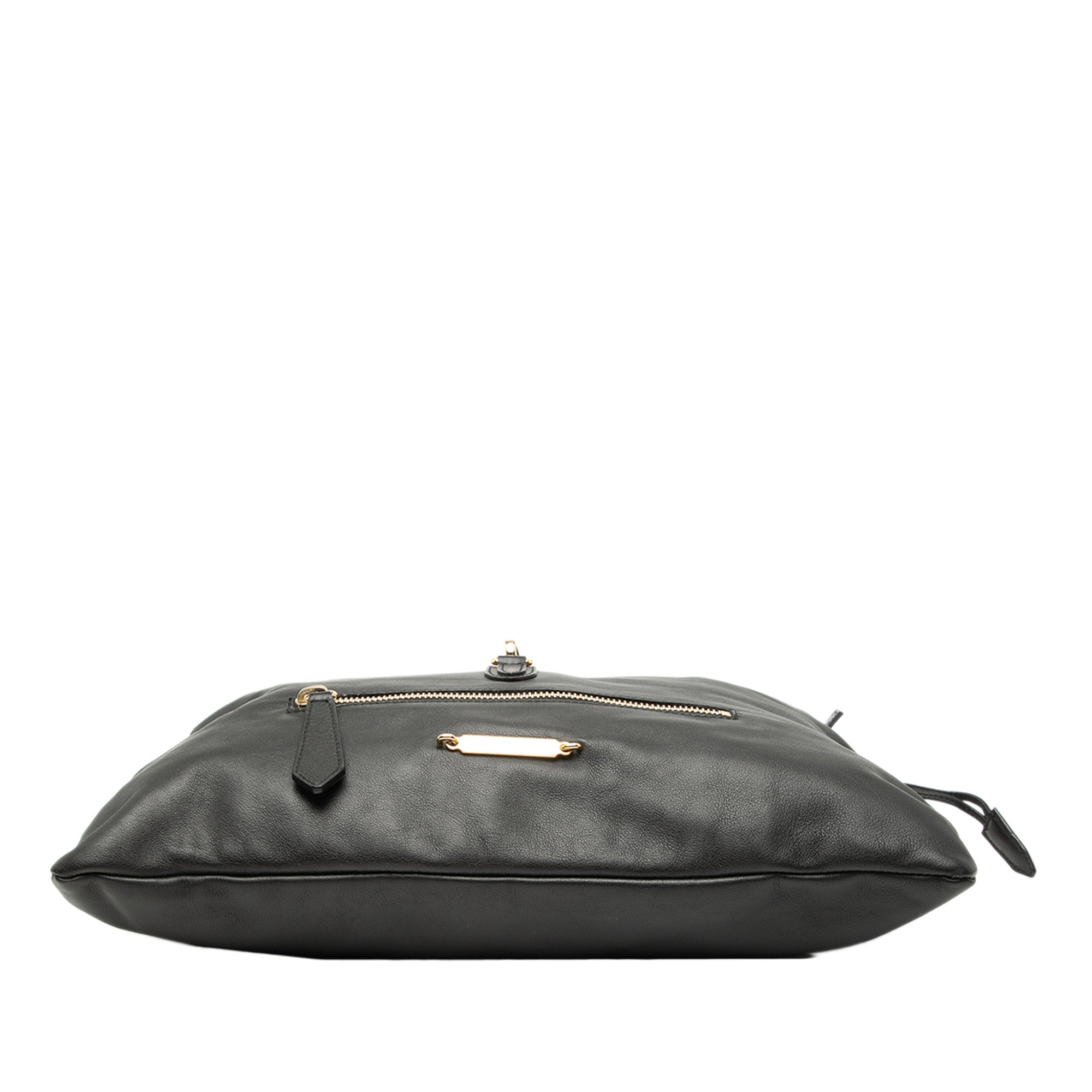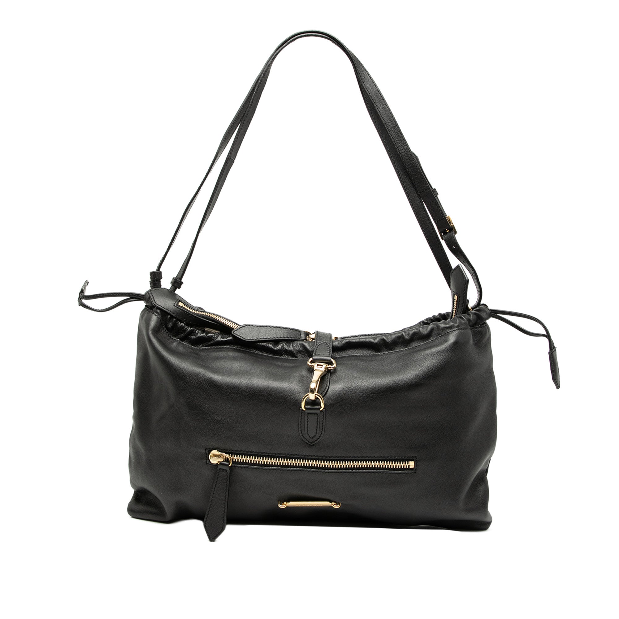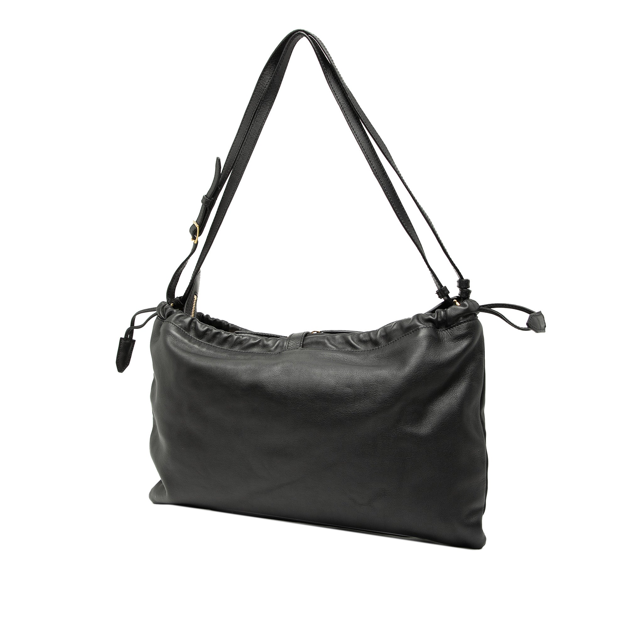 The Big Crush shoulder bag features a leather body, adjustable flat leather straps, a top zip closure, a drawstring closure, a flap tab with a clasp closure, an exterior front zip pocket, and interior zip and slip pockets. Retail Price: 590.00