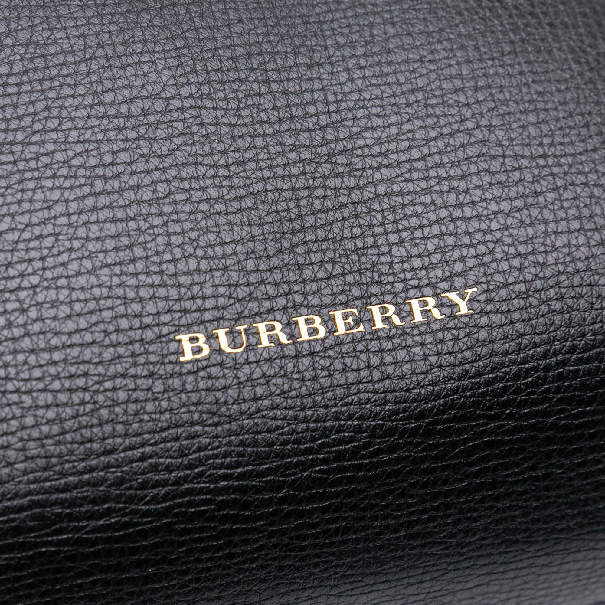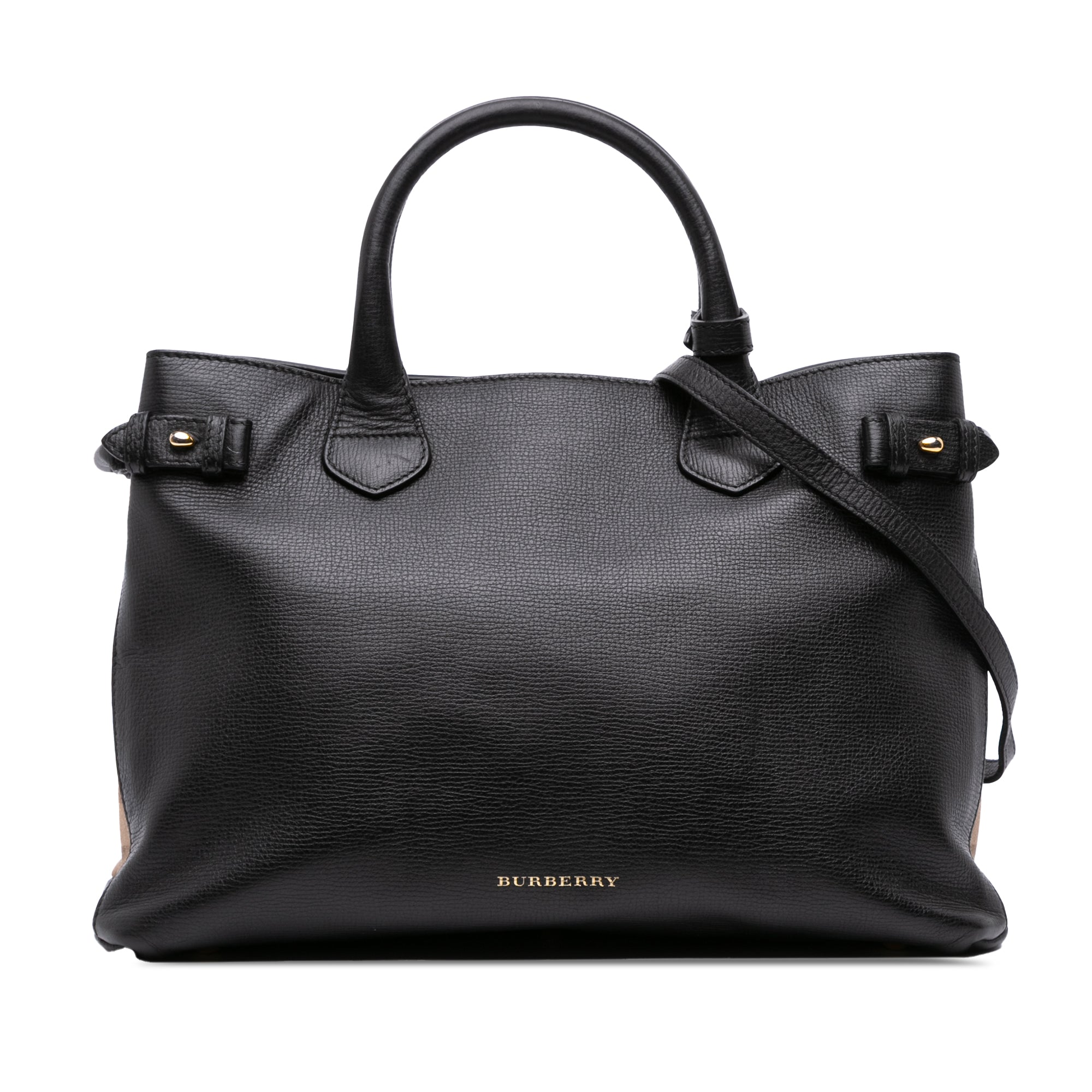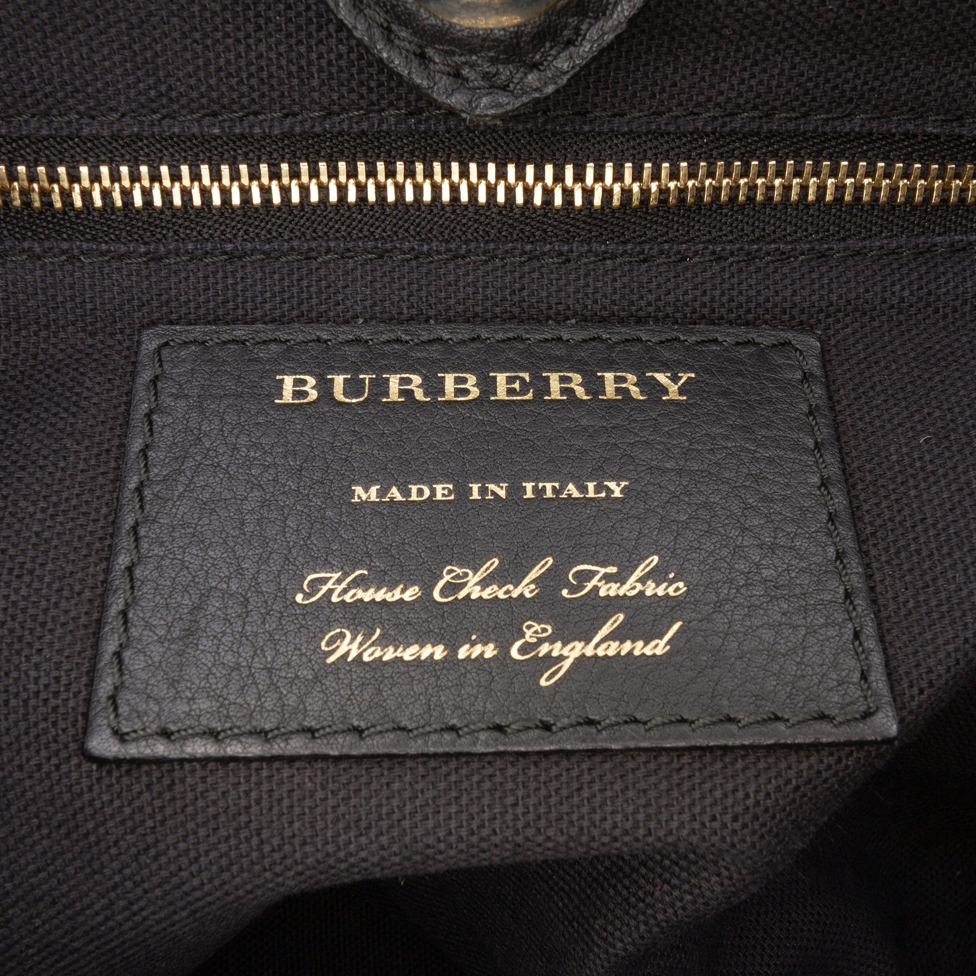 The Banner satchel features a leather body with house check canvas trim, rolled leather handles, an adjustable and detachable flat leather strap, an open top with magnetic snap closure, an interior zip compartment, and interior zip and slip pockets. Retail Price: 1650.00