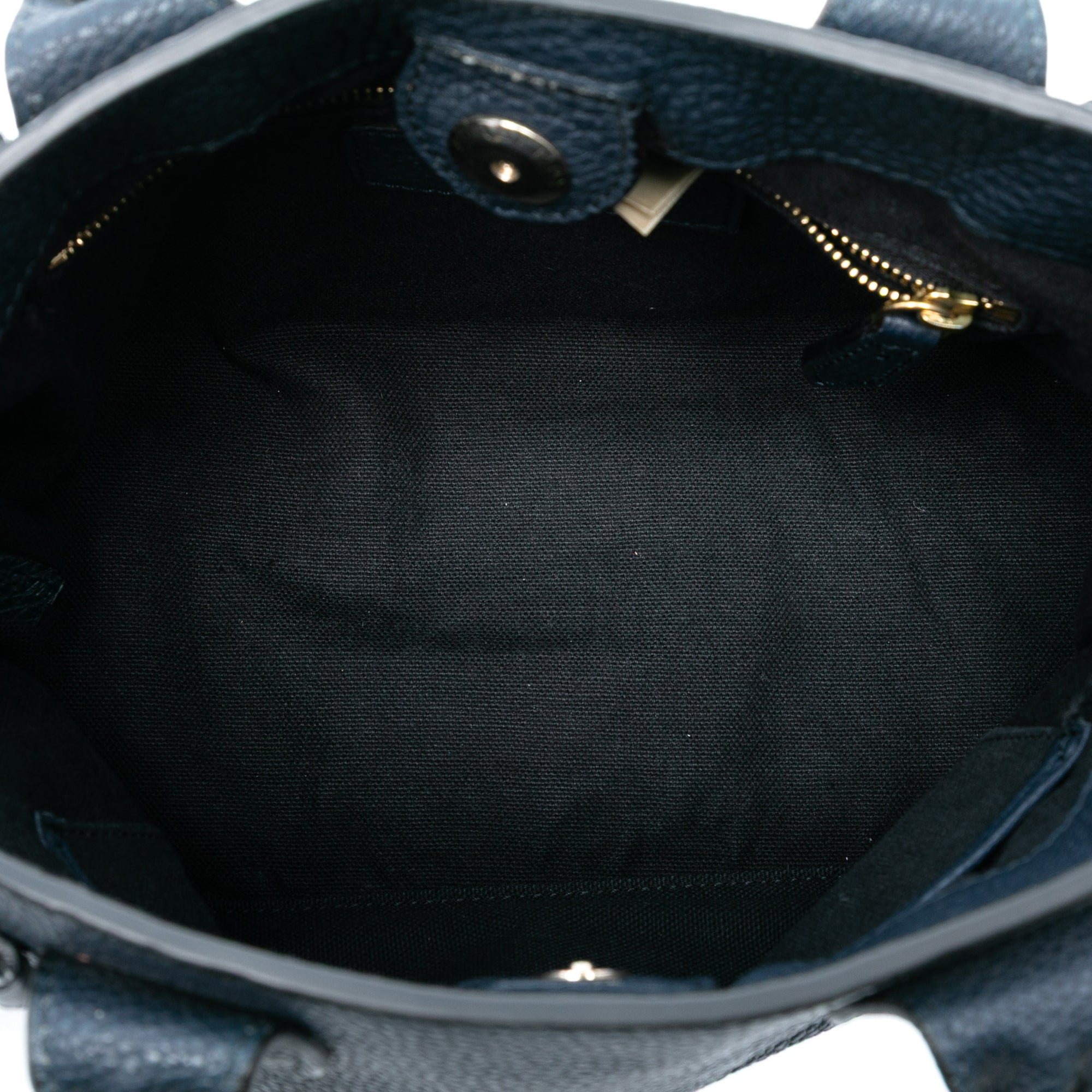 The Banner features a leather body, rolled leather top handles, a detachable flat leather shoulder strap, an open top with a magnetic snap button closure, and interior zip and slip pockets. Retail Price: 1295.00