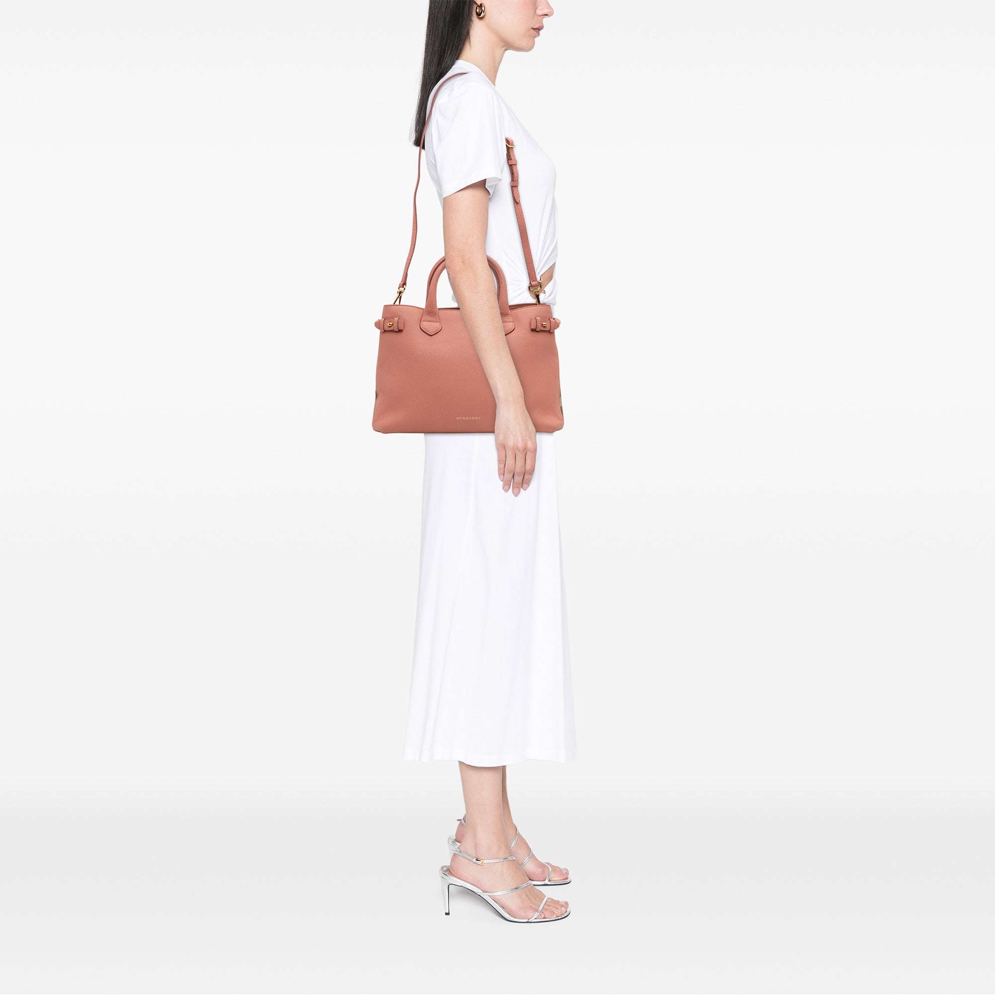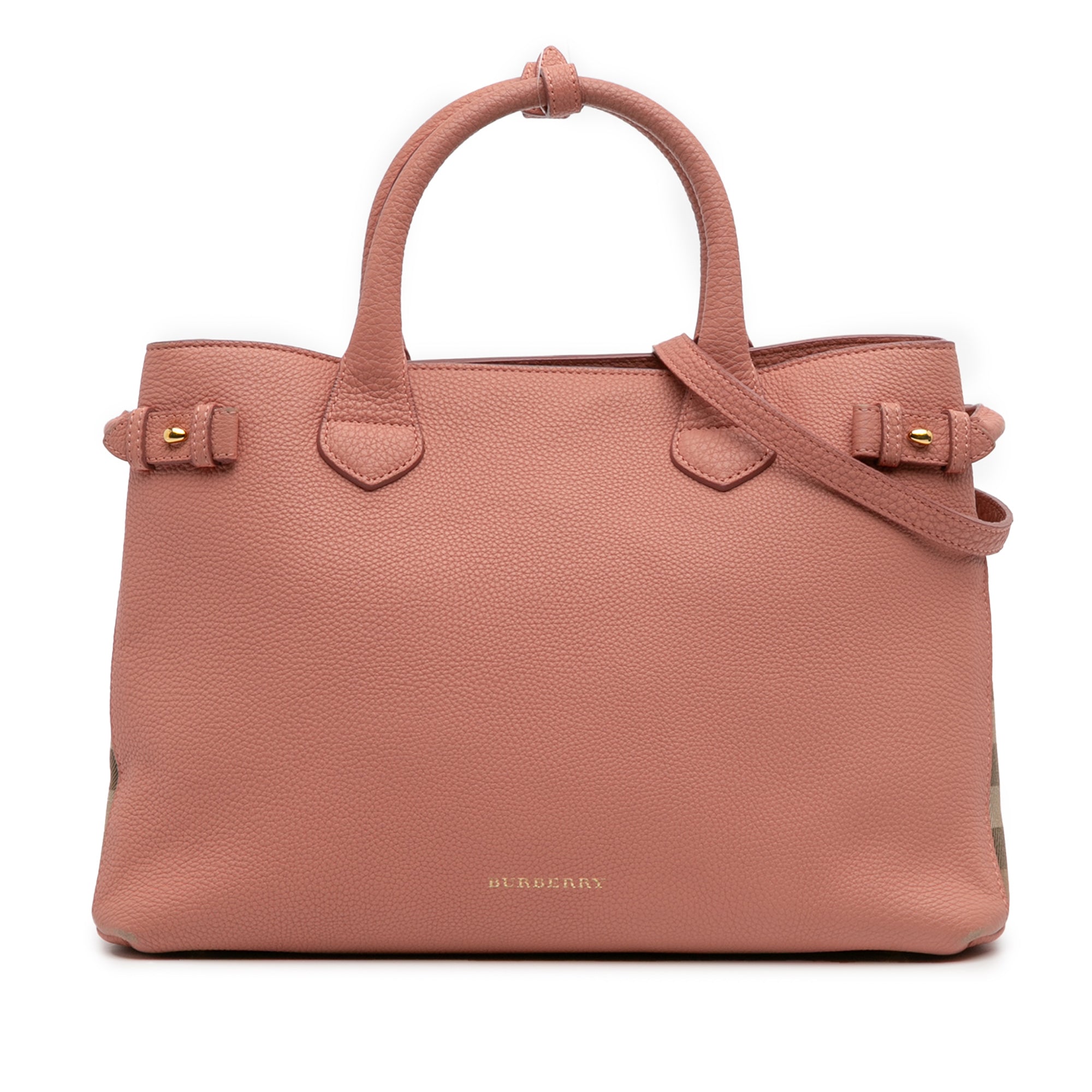 The Banner features a leather body with house check canvas trim, rolled leather handles, an adjustable and detachable flat leather strap, an open top with magnetic snap closure, an interior zip compartment, and interior zip and slip pockets. Retail Price: 1790.00