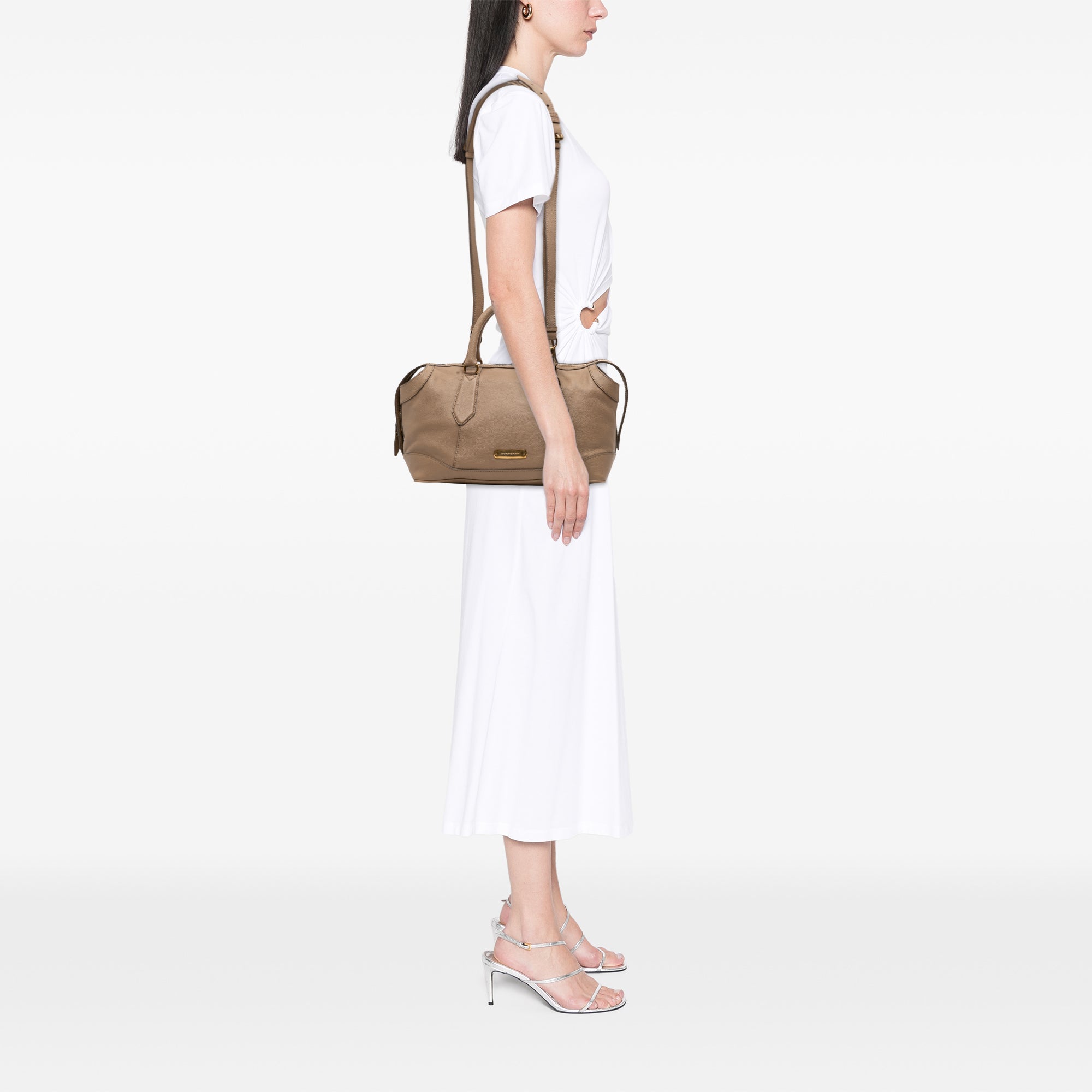 The Kirley features a leather body, rolled leather top handles, a detachable and adjustable flat leather strap, a top zip closure, and interior zip and slip pockets. Retail Price: 1280.00