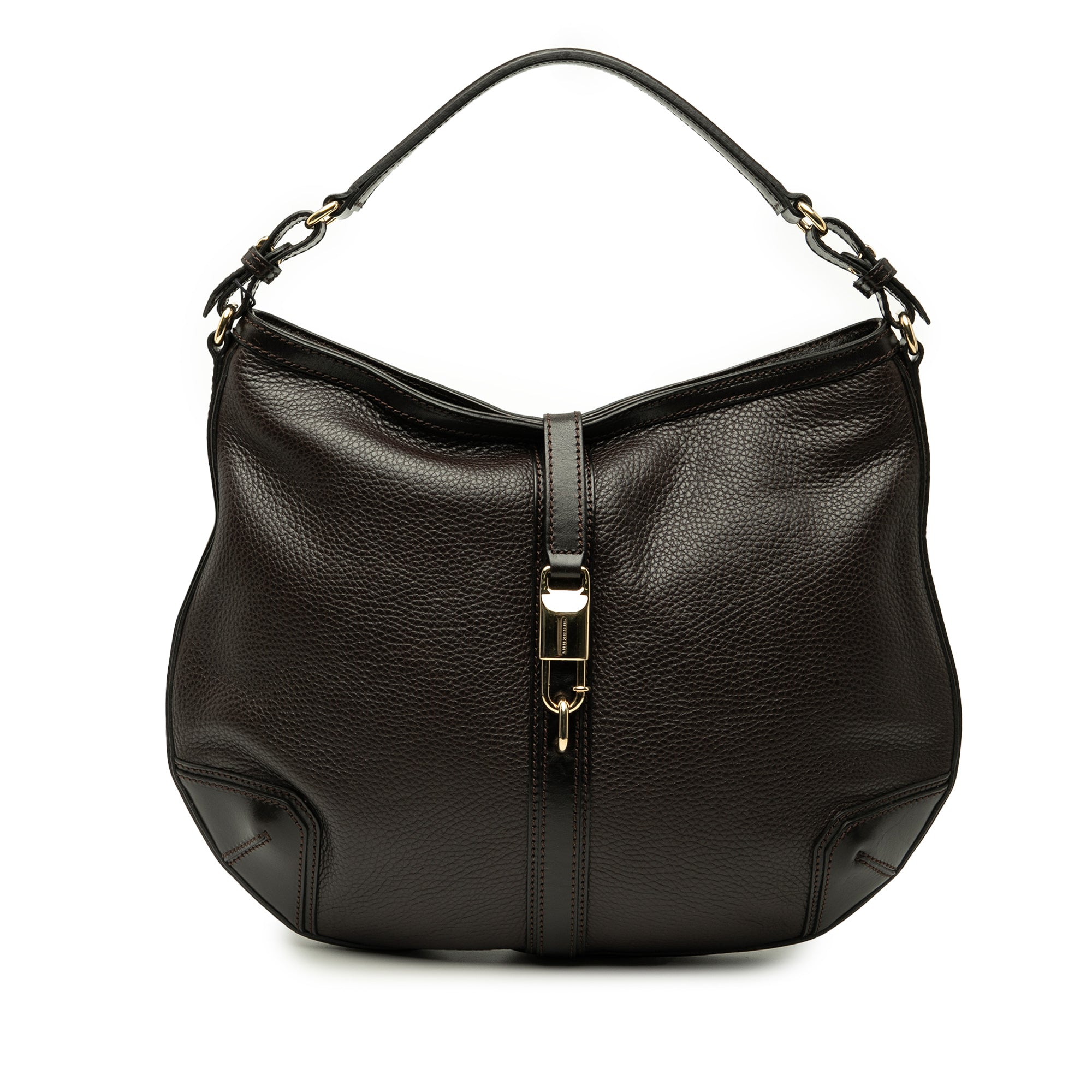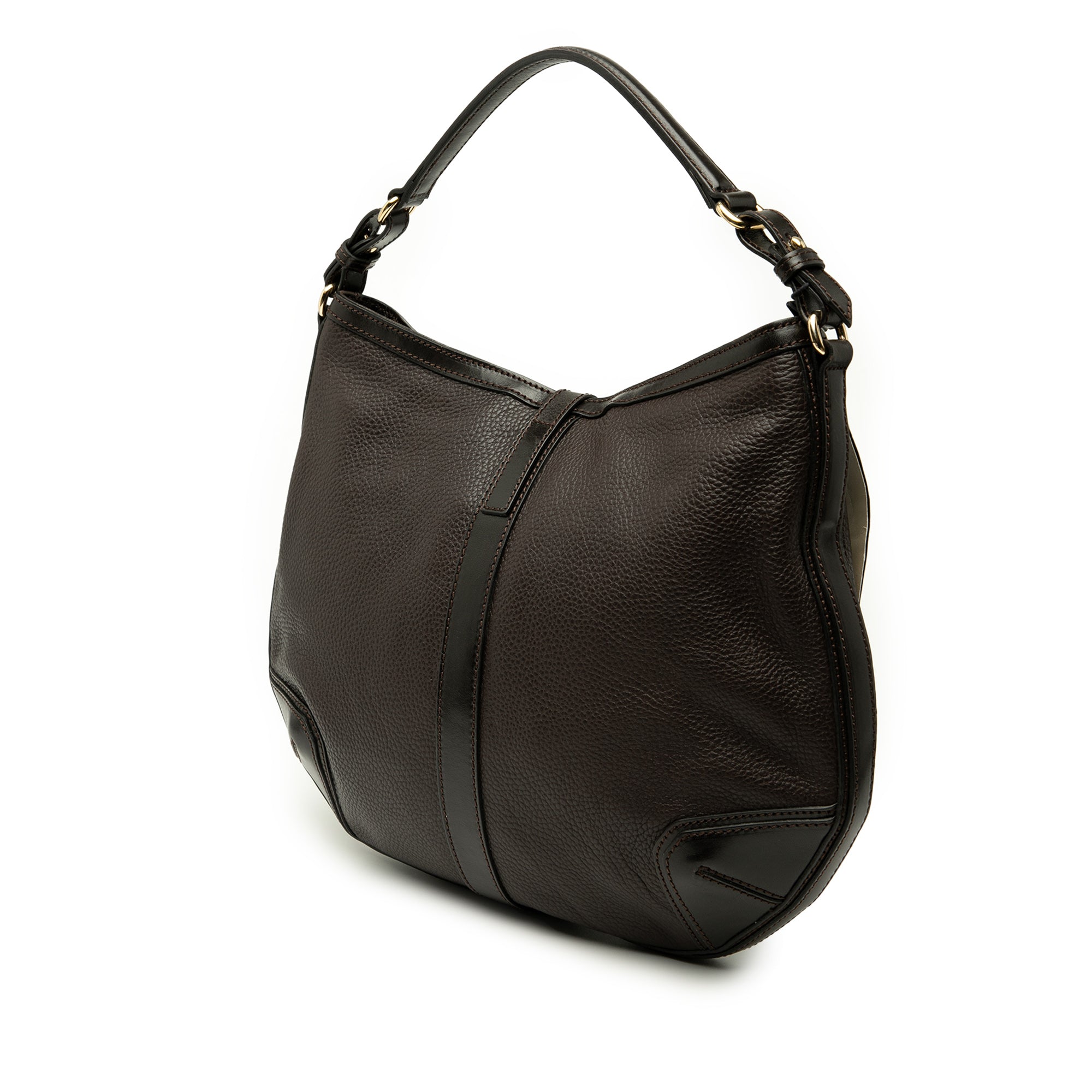 This hobo bag features a leather body, a flat leather strap, a top zip closure, and interior zip and slip pockets. Retail Price: 1195.00