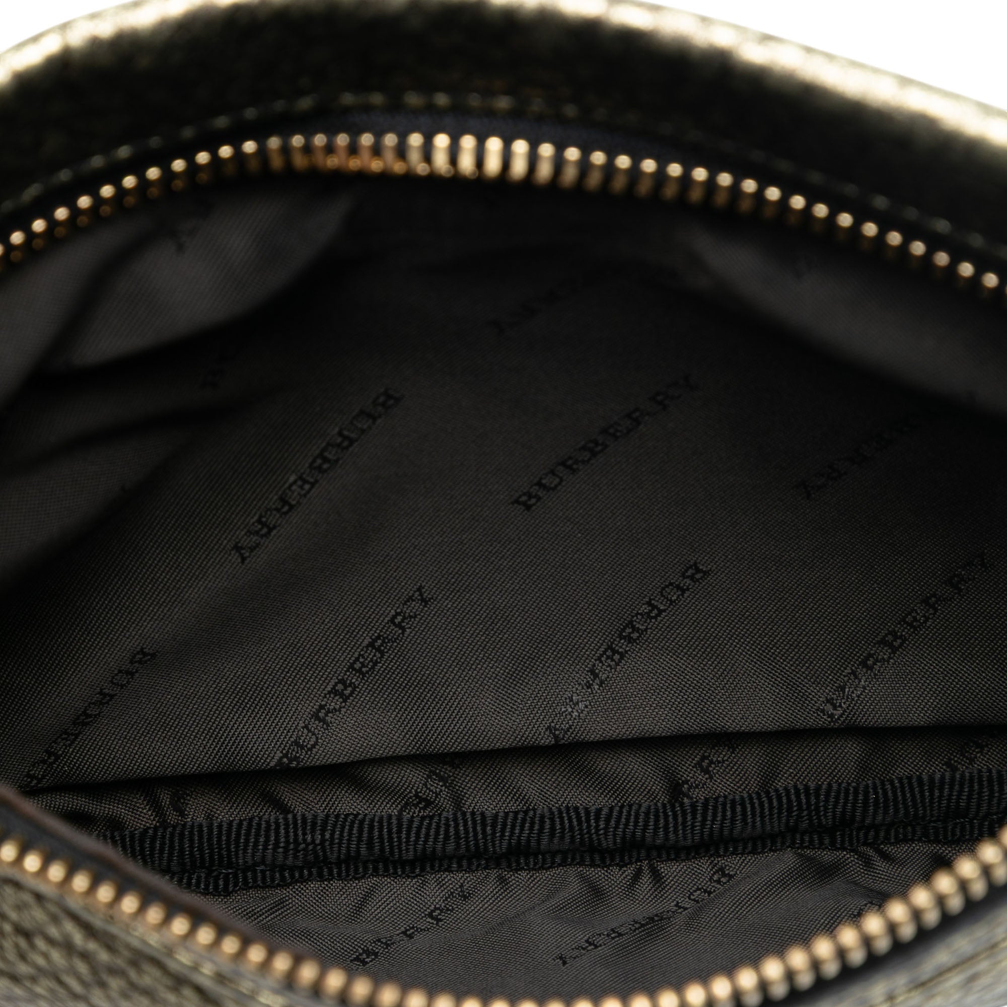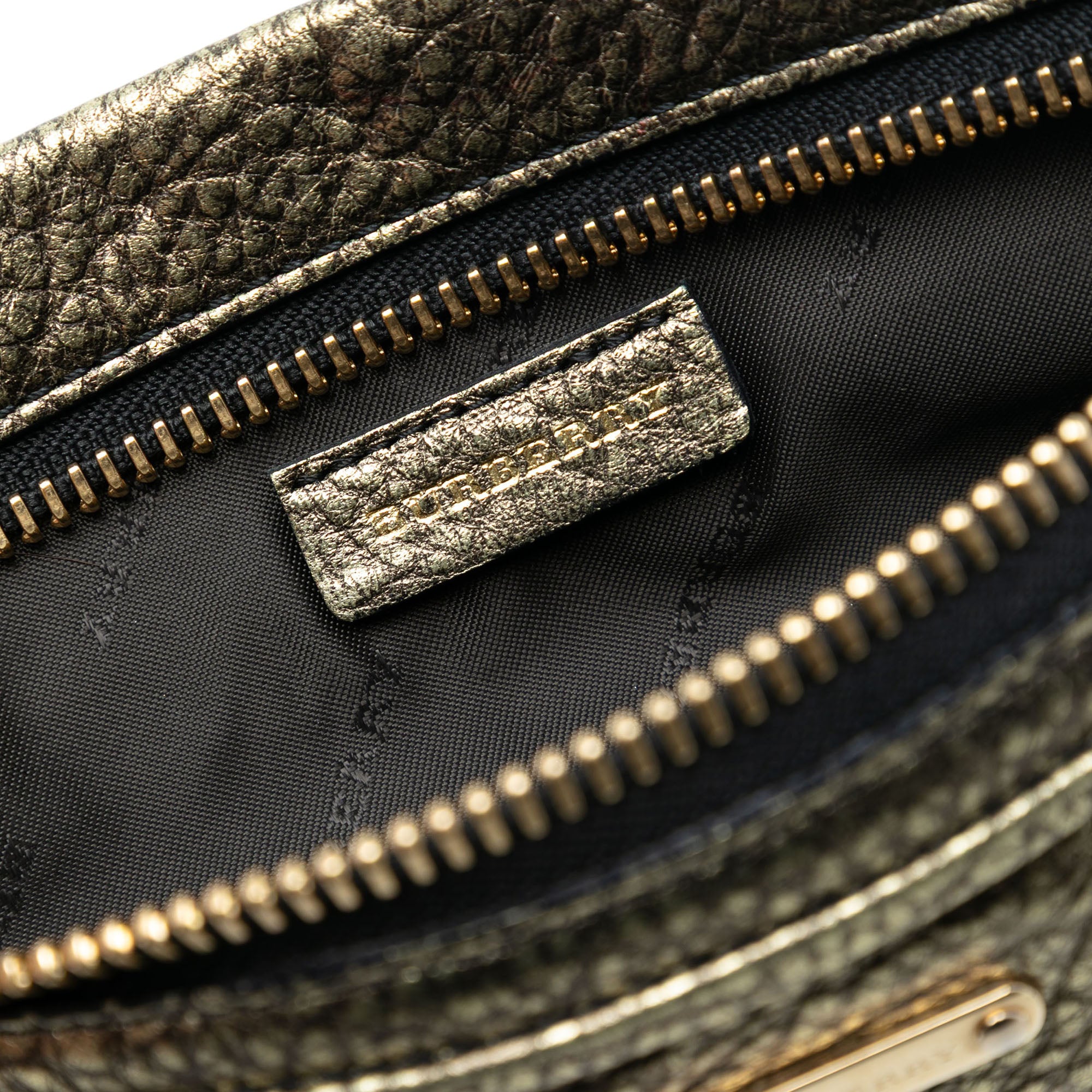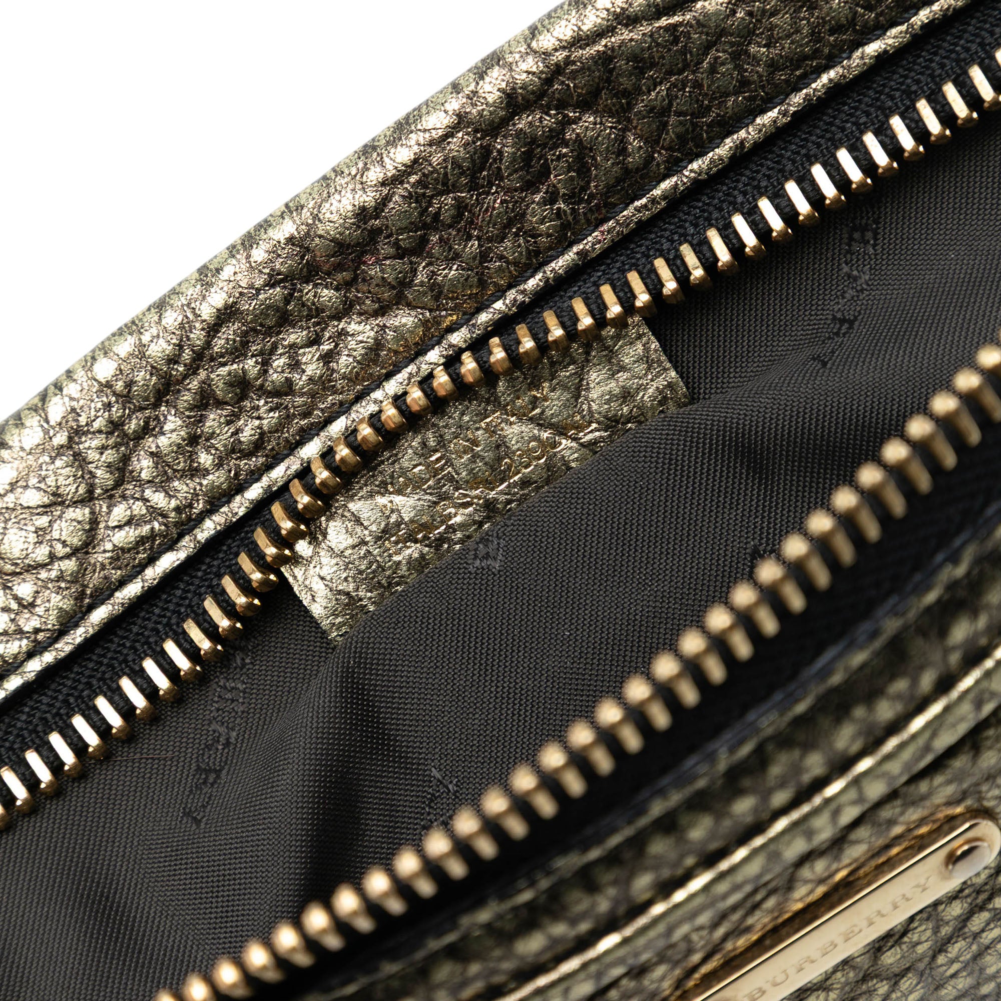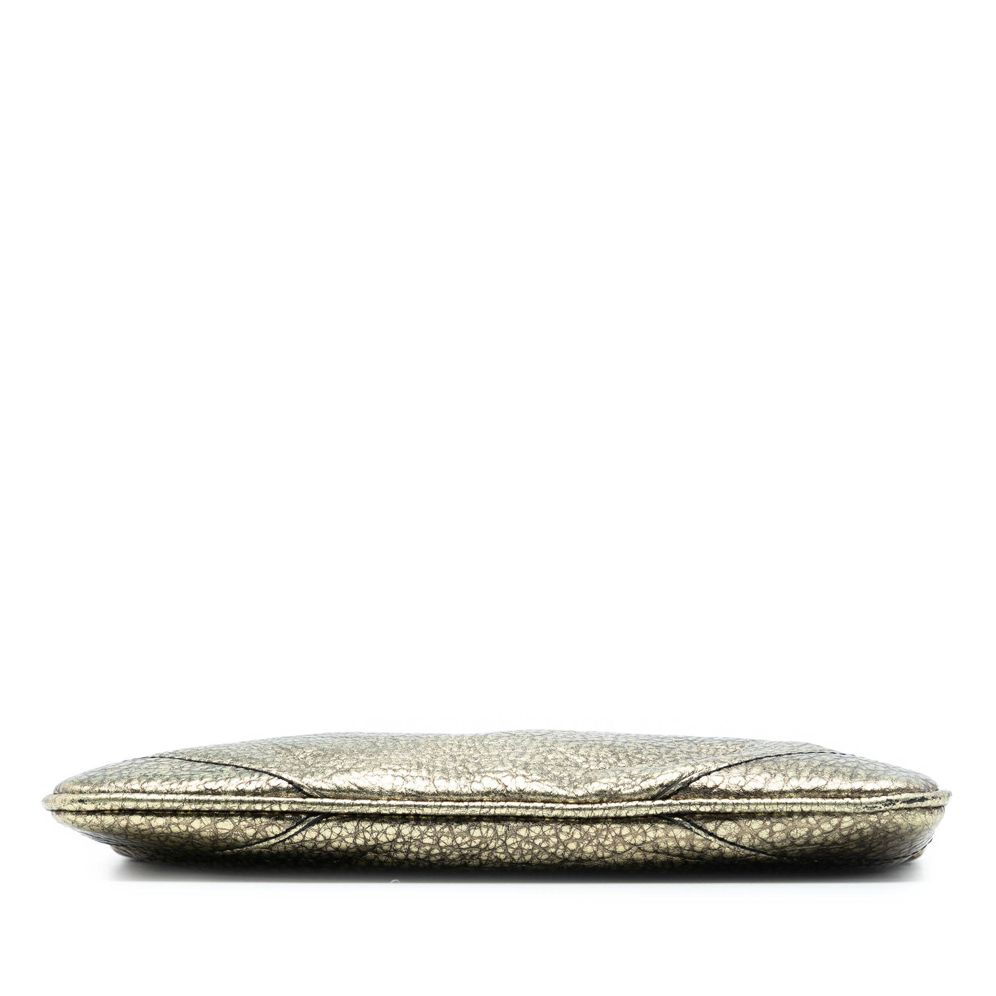 This clutch features a metallic leather body, a flat leather wrist strap, a top zip closure, and an exterior zip pocket. Retail Price: 480.00