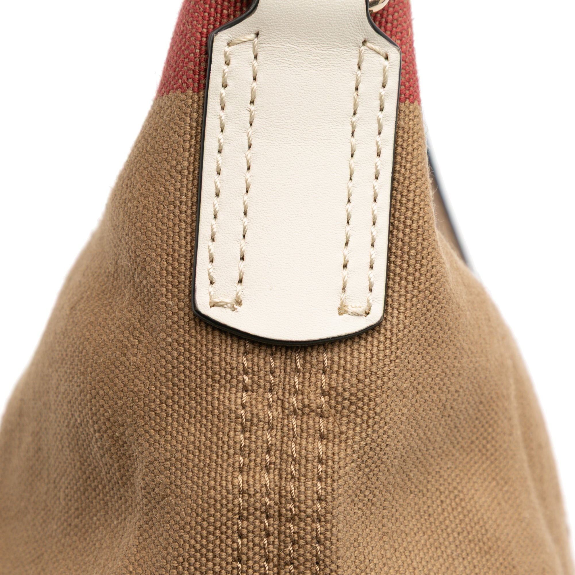 The Mini Ashby features a mega check canvas body with leather trim and tassel details, an adjustable flat leather shoulder strap, an open top with magnetic snap closure, and and a pouch inclusion. Retail Price: 695.00