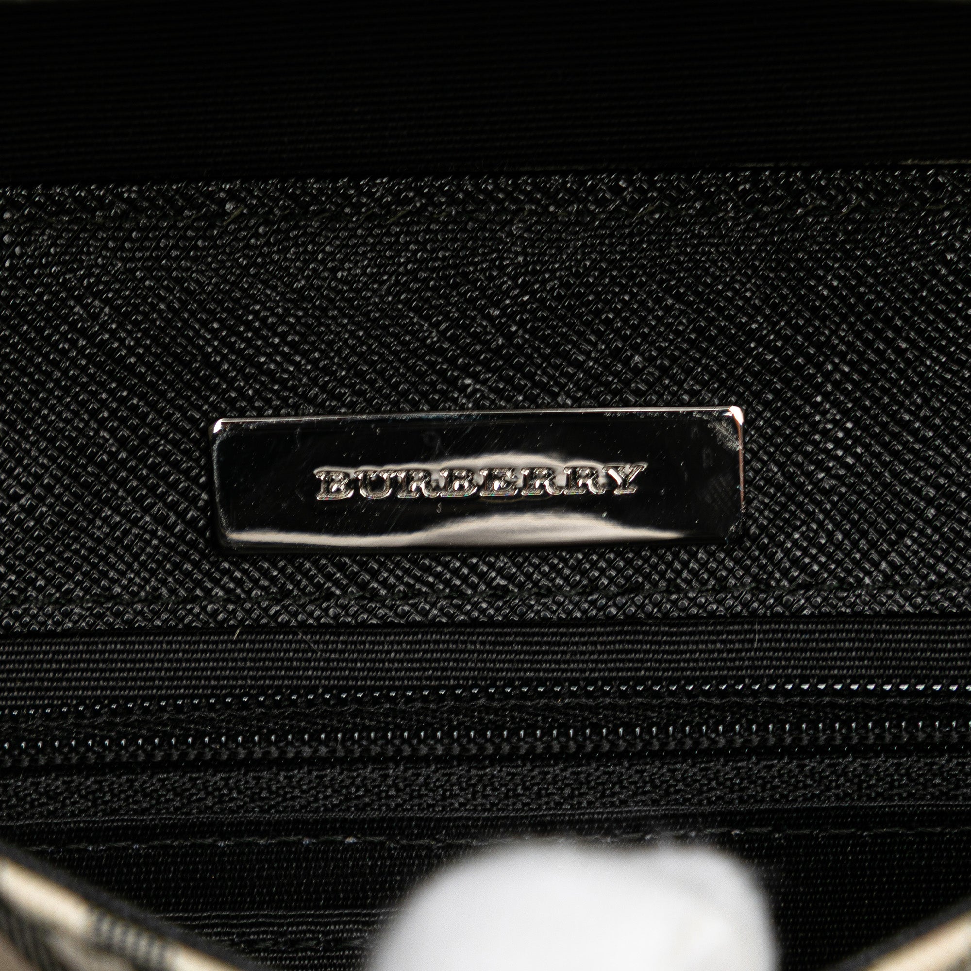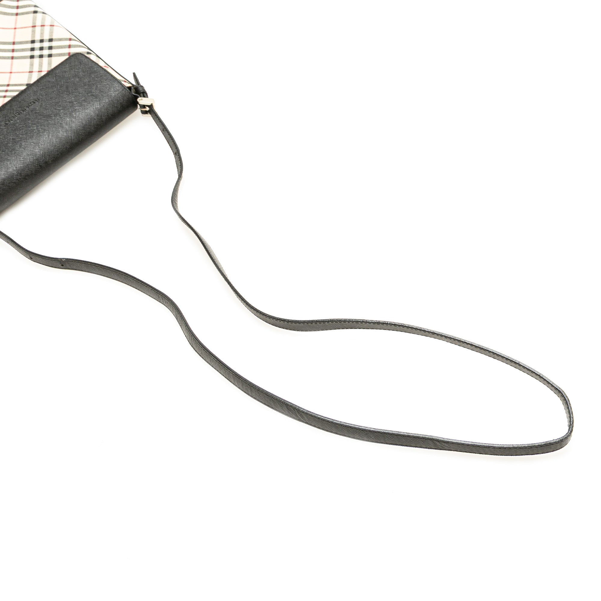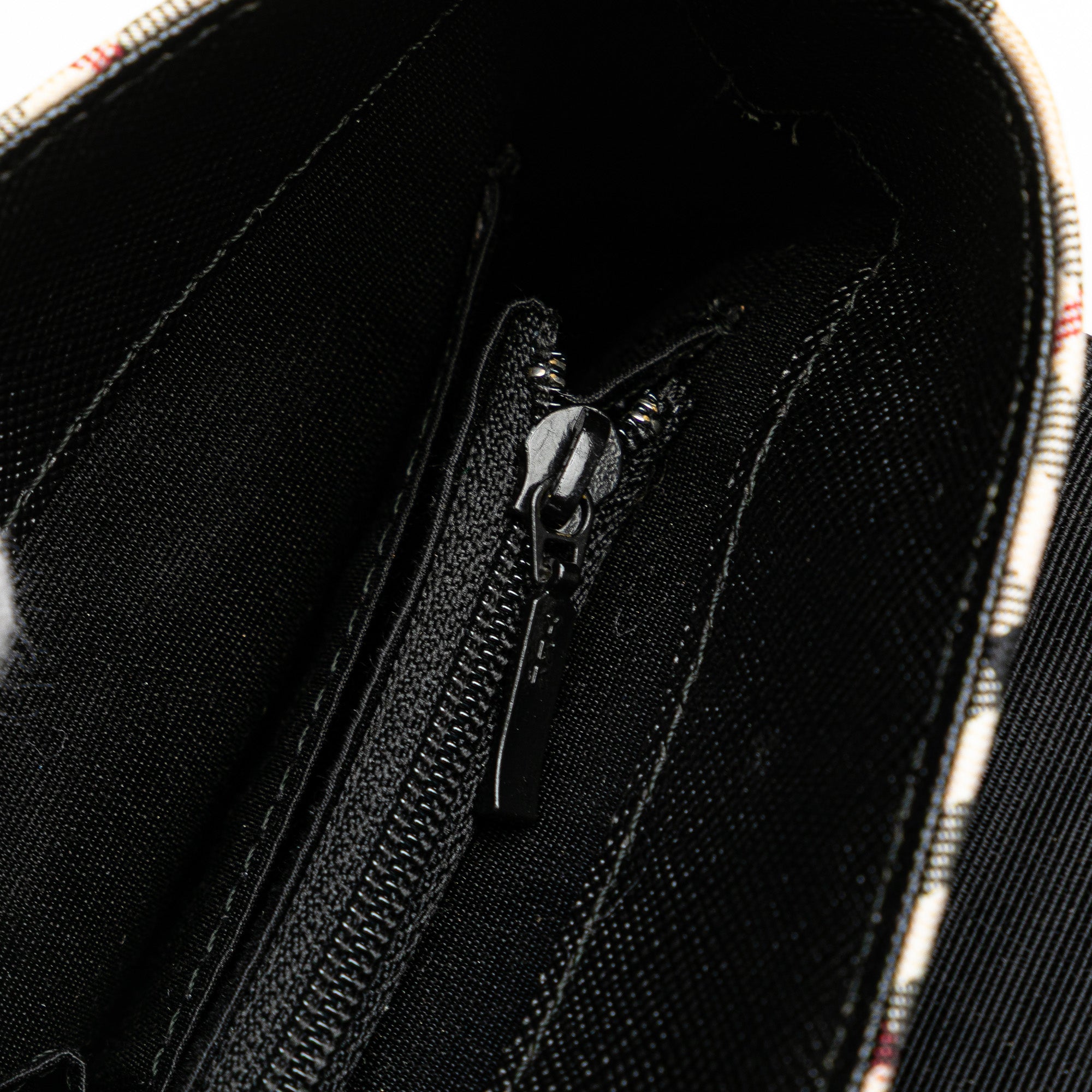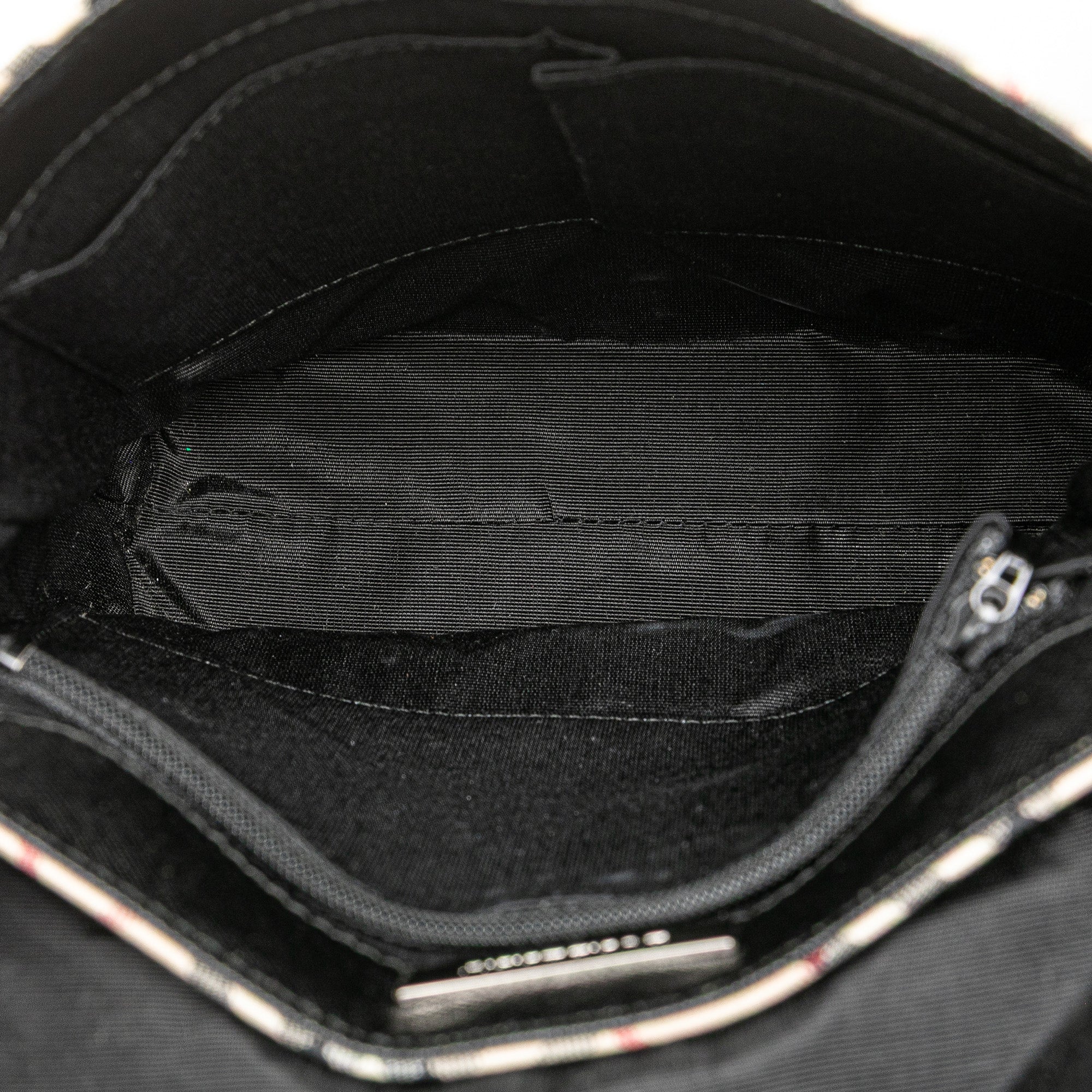 This crossbody bag features a nova check canvas body with leather trim, an adjustable flat shoulder strap, a front flap with magnetic snap closure, and interior zip and slip pockets. Retail Price: 600.00