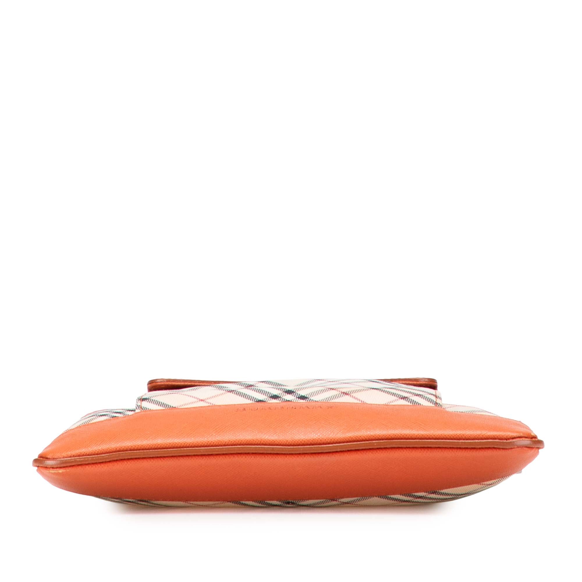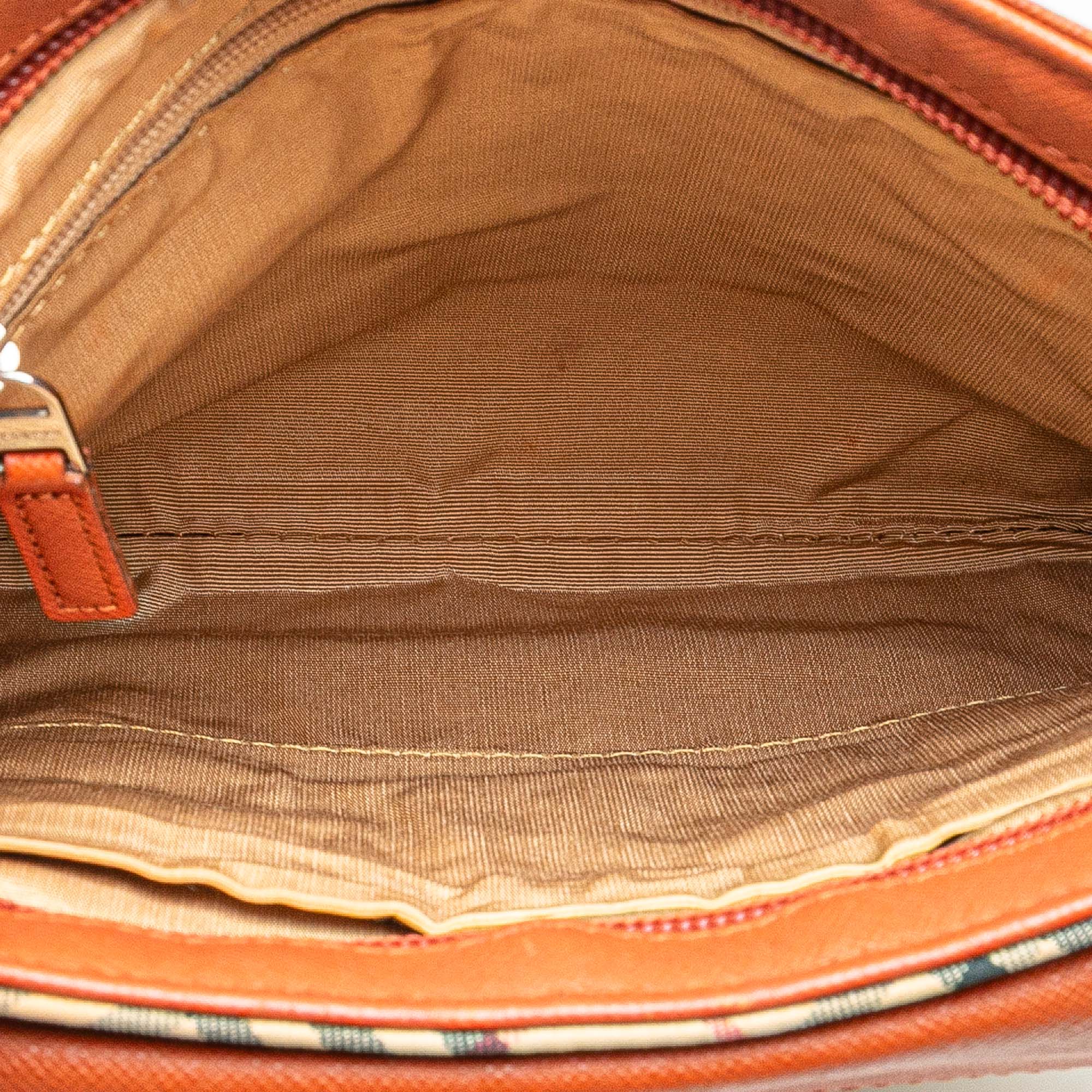 This crossbody bag features a nova check canvas body with leather trim, a flat leather shoulder strap, a top zip closure, an exterior flap pocket with a snap button closure, and an interior zip pocket. Retail Price: 665.00