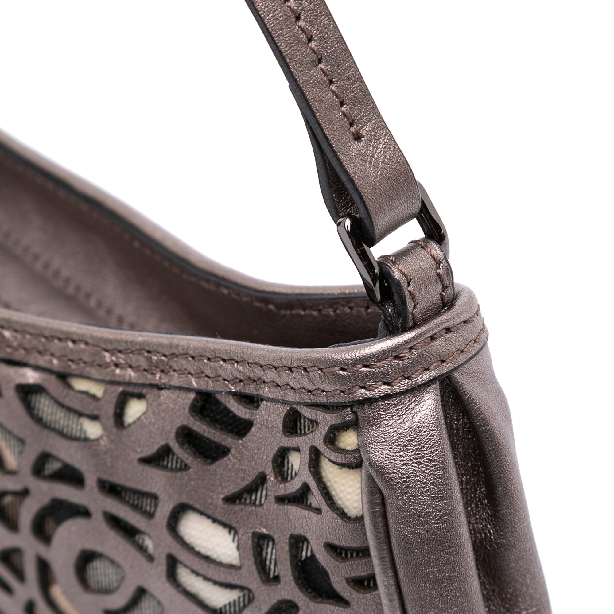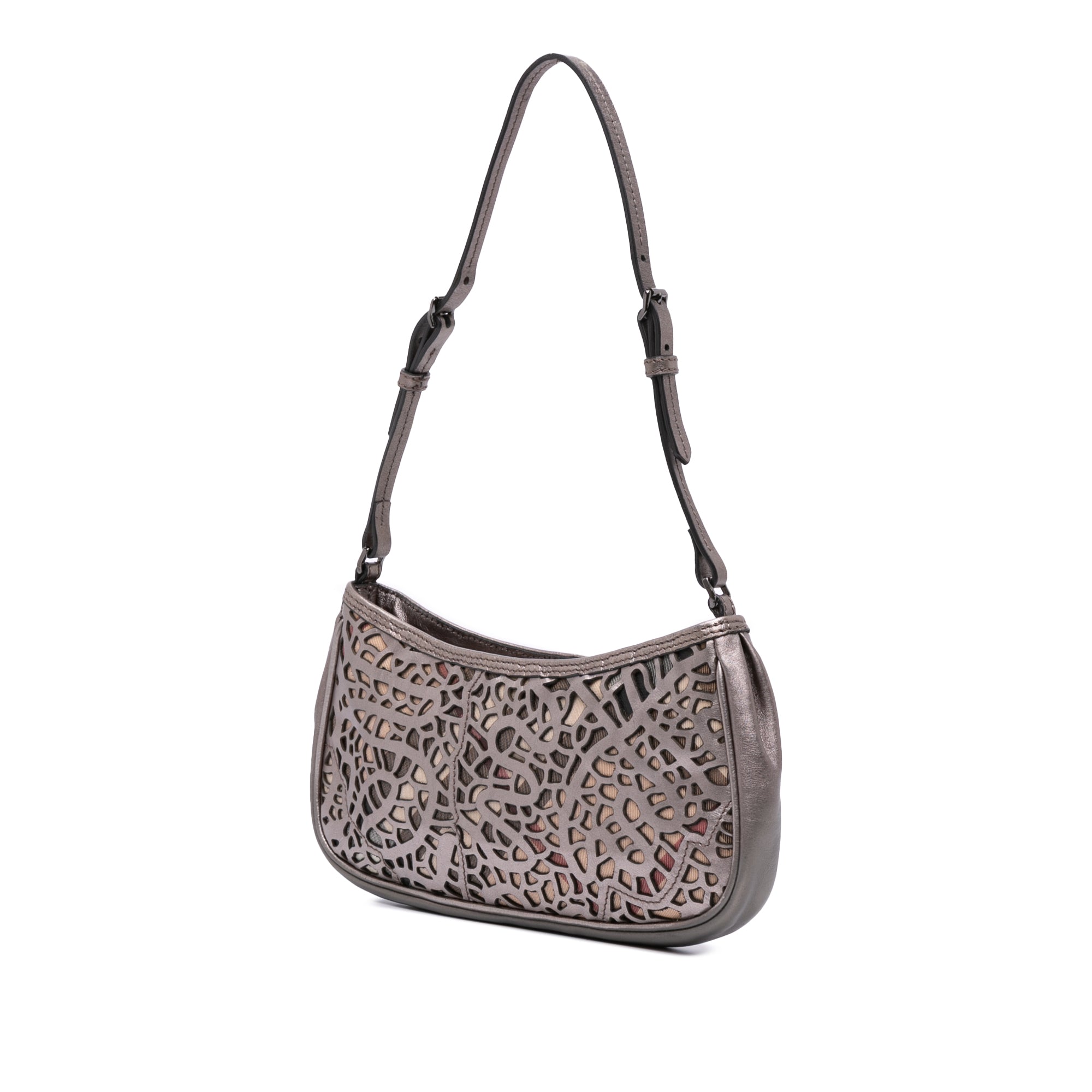 This shoulder bag features a cutout leather body with nova check canvas details, an adjustable flat leather strap, a top zip closure, and an interior slip pocket. Inclusion: Dust bag. Retail Price: 490.00