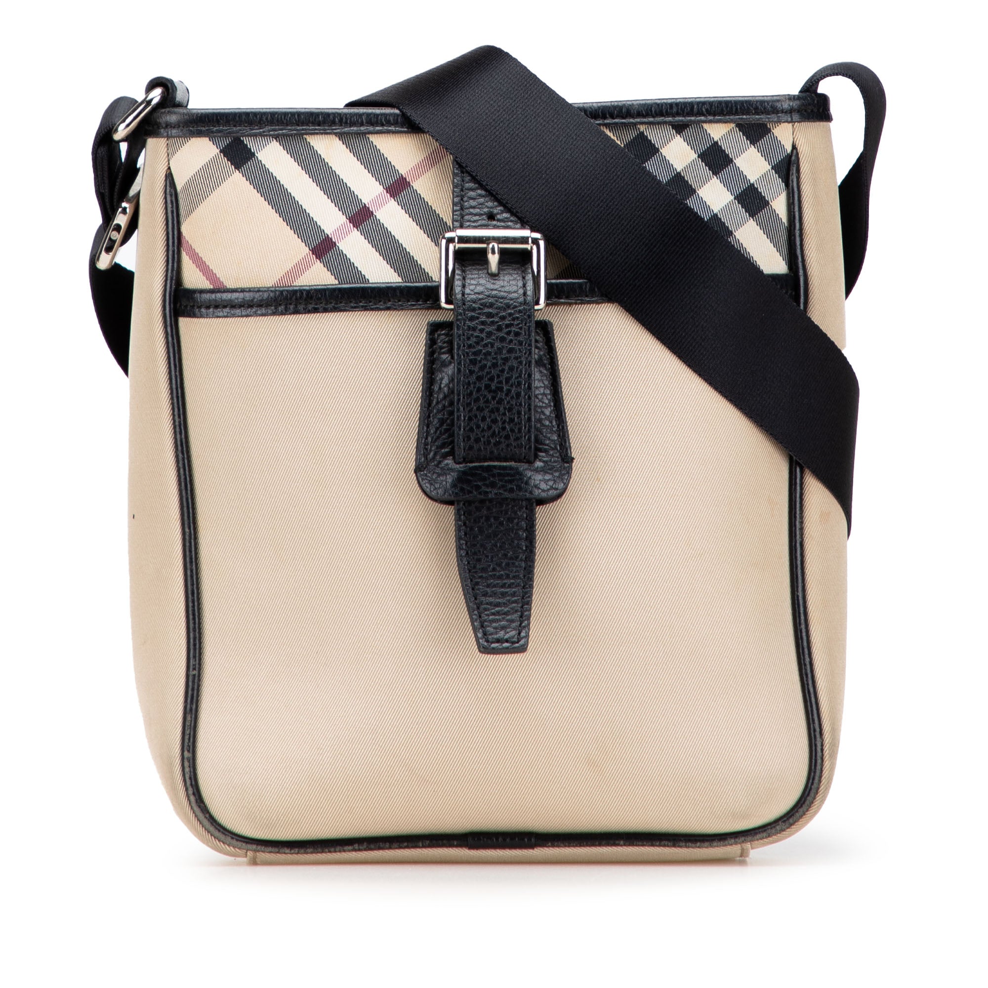 This crossbody bag features a canvas body with leather trim, an adjustable flat strap, an open top with flat strap and magnetic snap closure, exterior front and back slip pockets, and interior zip and slip pockets. Retail Price: 870.00