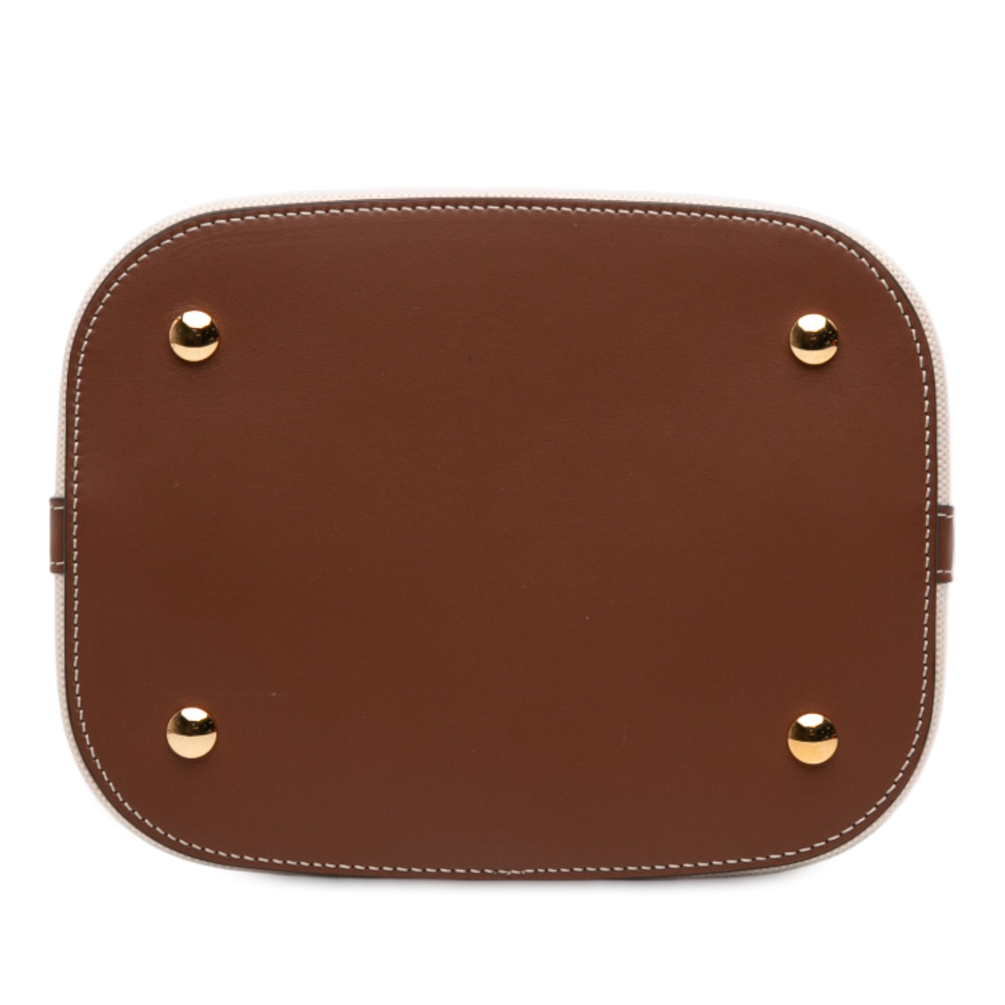 The Peggy bucket bag features a canvas body with leather trim, a flat leather top handle, a detachable flat leather strap, and an open top. Retail Price: 1450.00