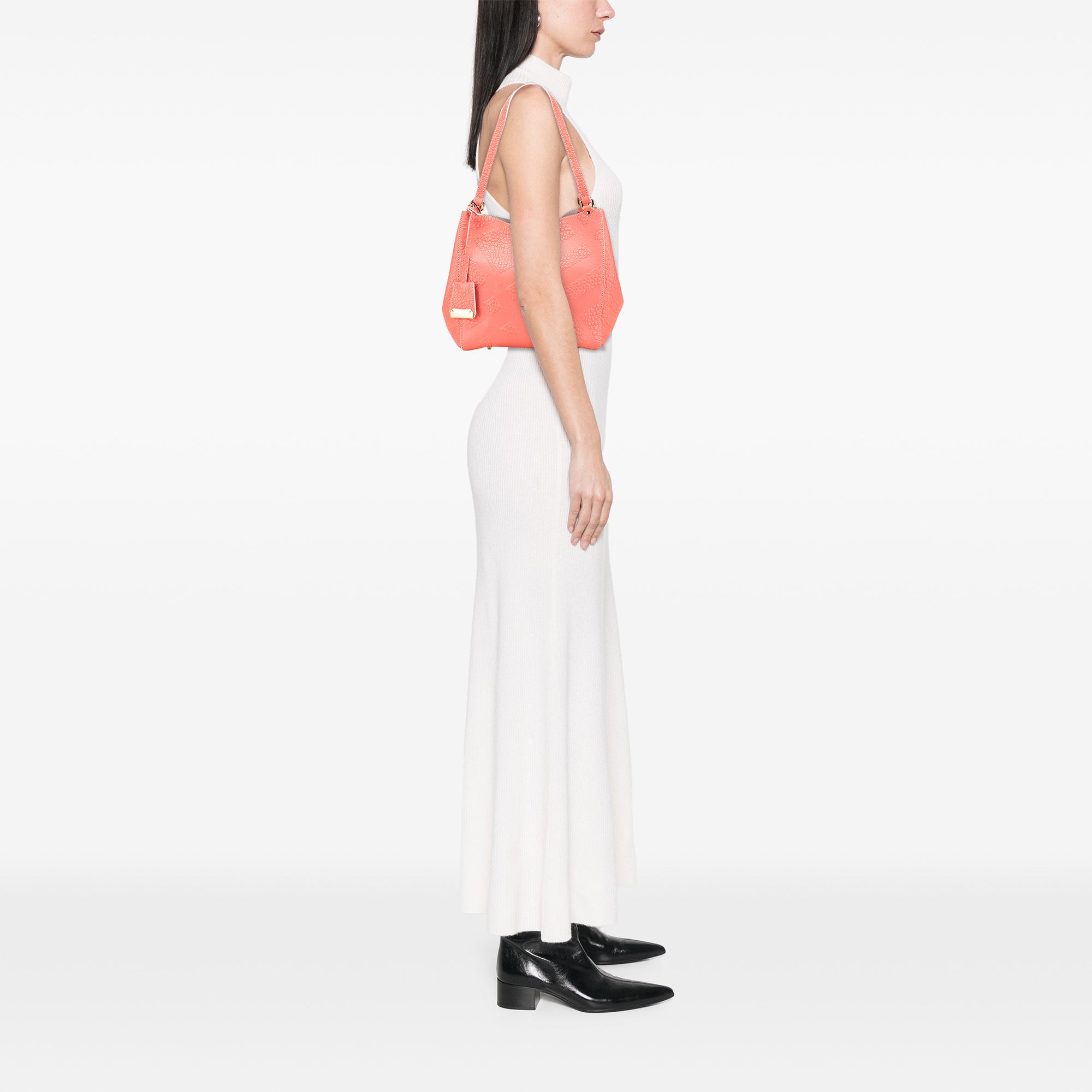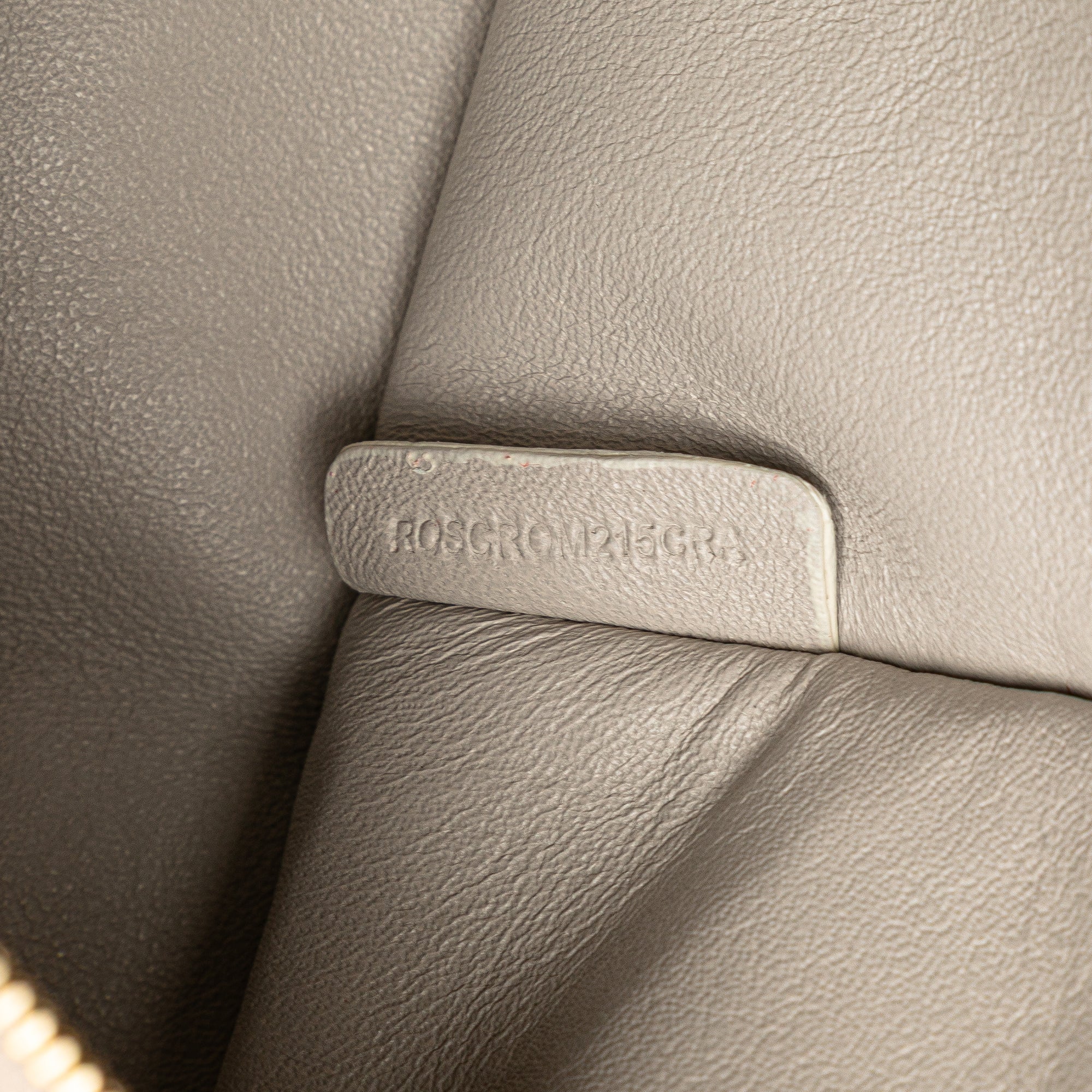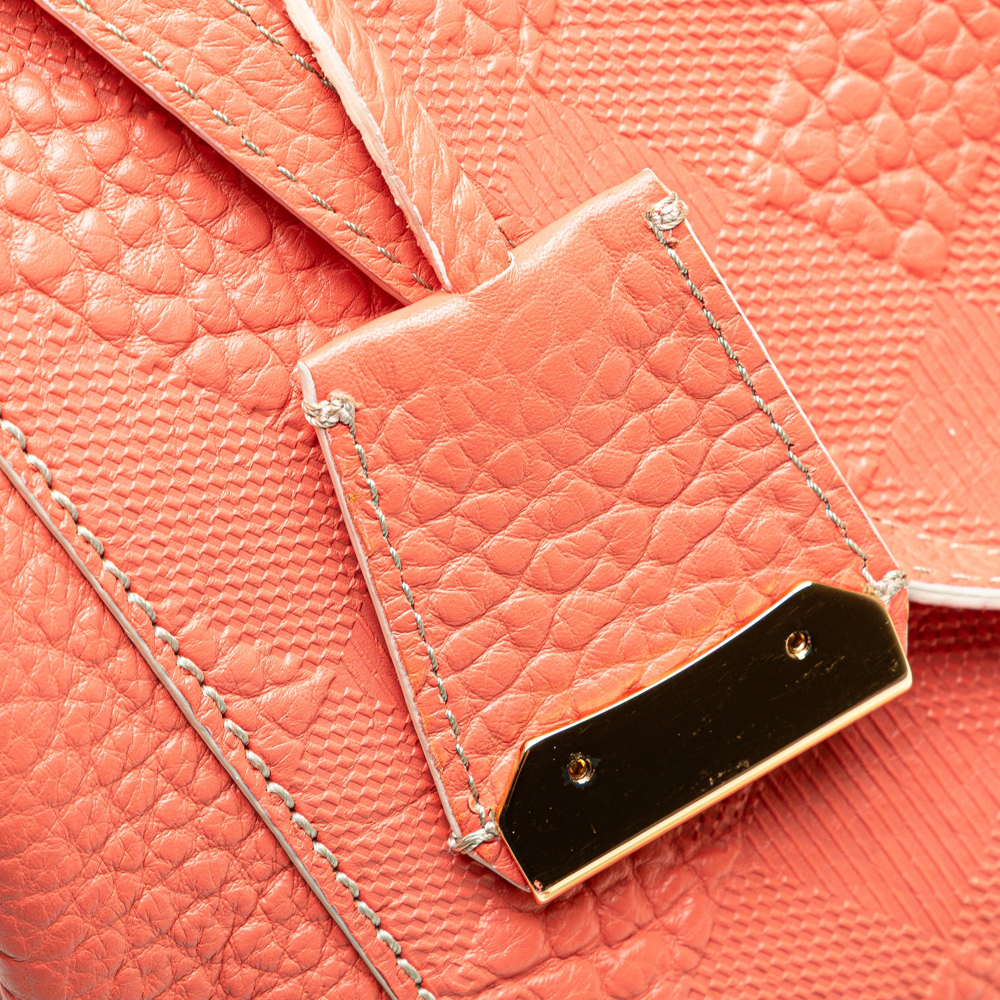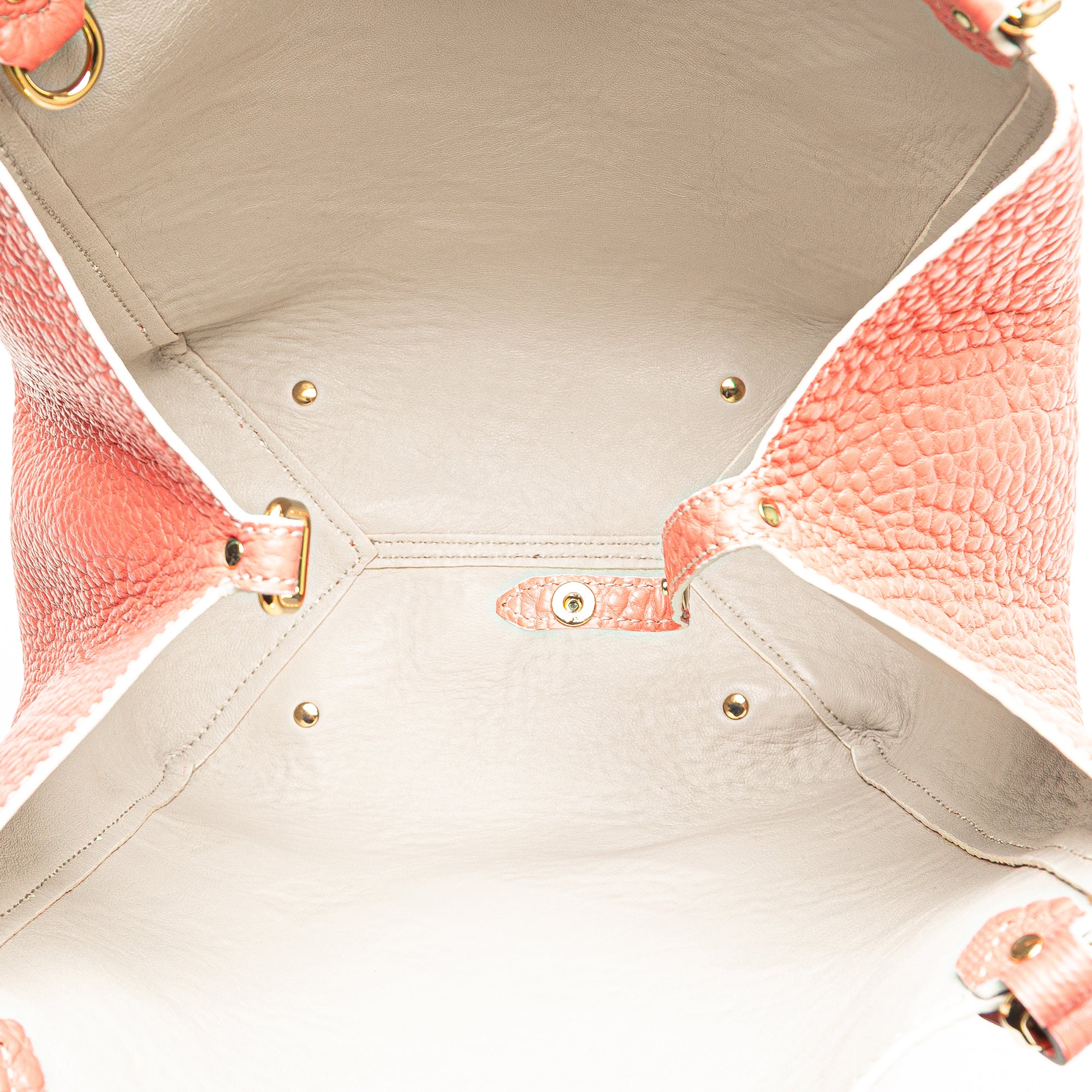The Canterbury tote bag features an embossed leather body, flat leather straps, an open top with a magnetic snap button closure, and an interior zip pouch. Retail Price: 1395.00