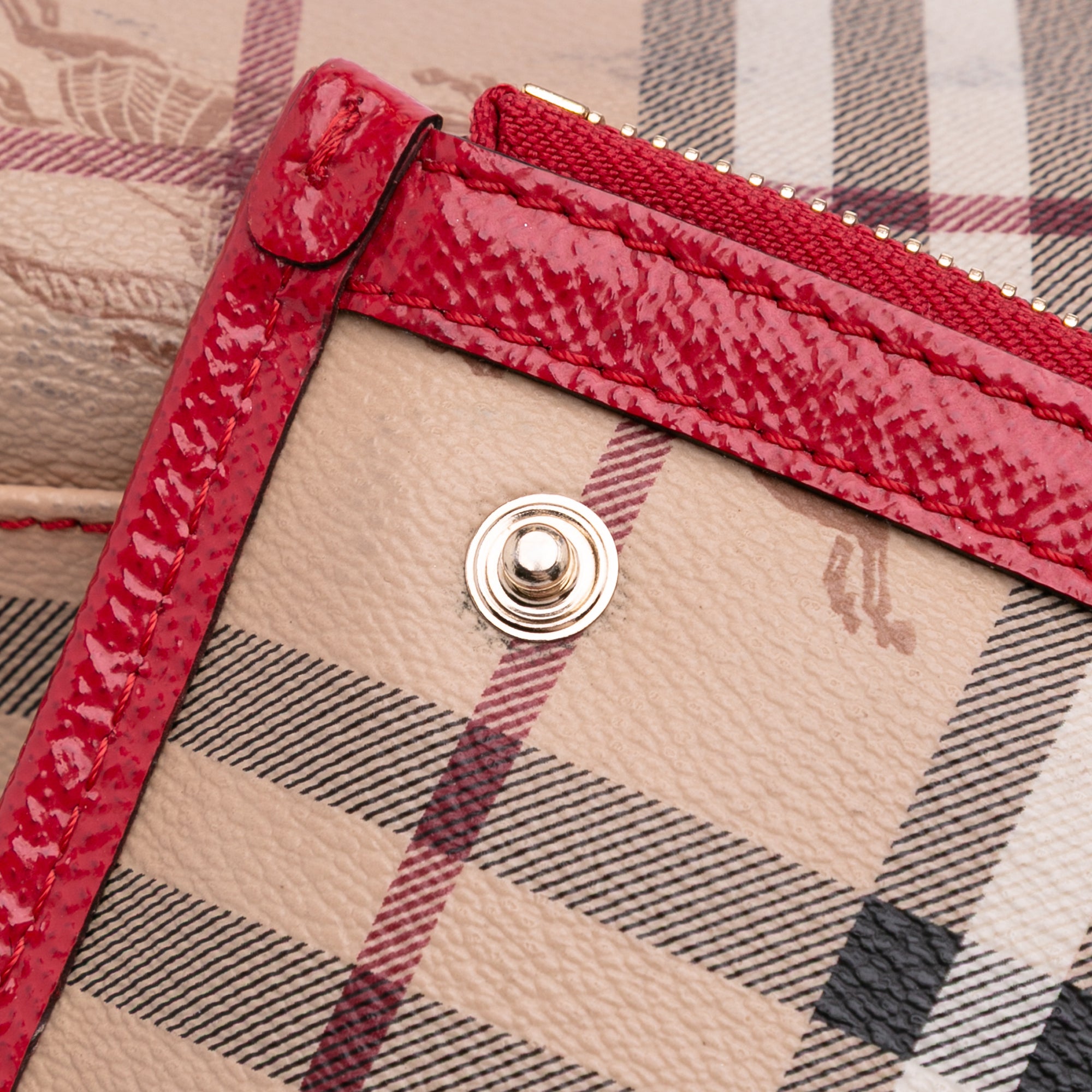 The Canterbury tote bag features a haymarket check coated canvas body with leather trim, flat leather straps, an open top with magnetic snap closure, interior zip and slip pockets, and a zip pouch. Retail Price: 700.00