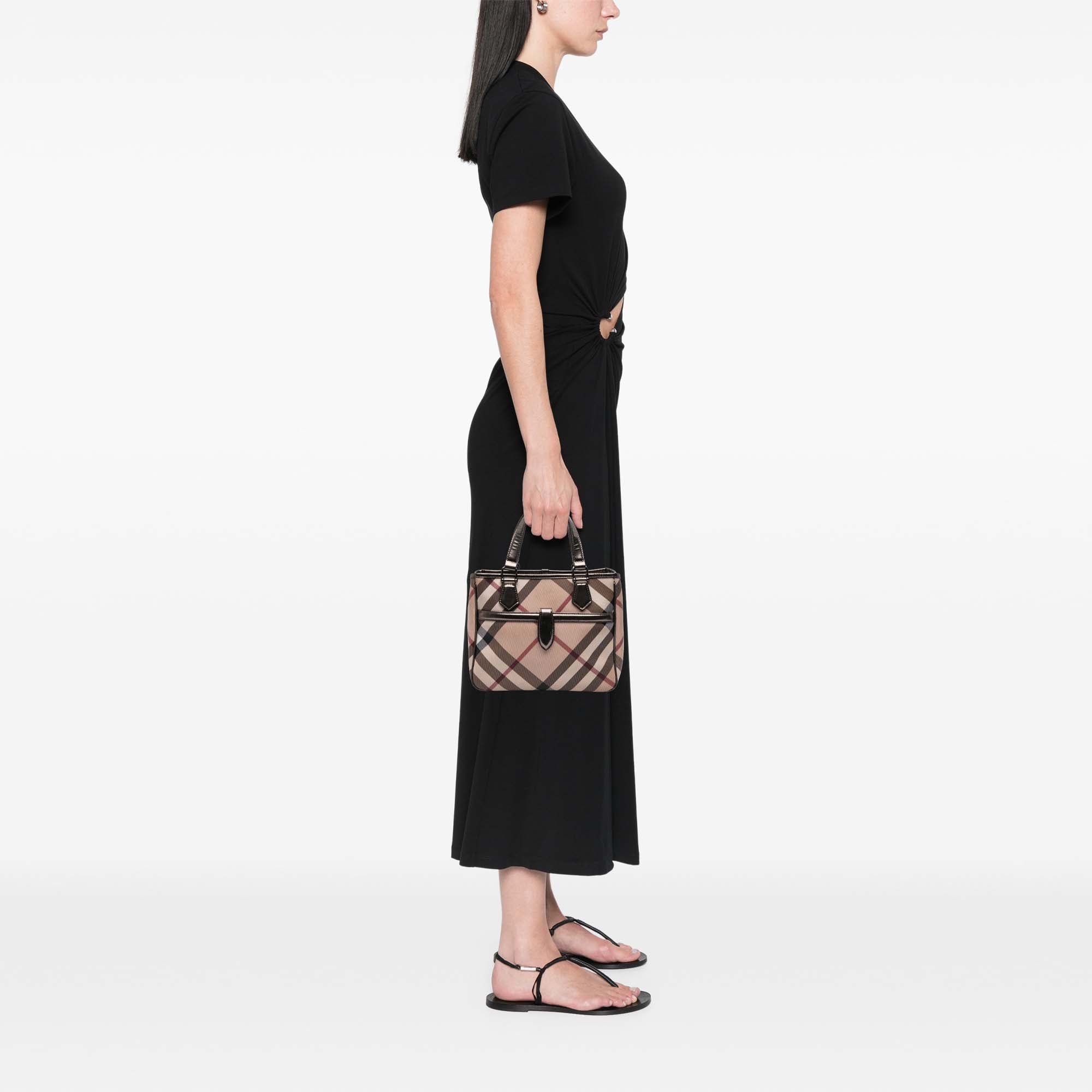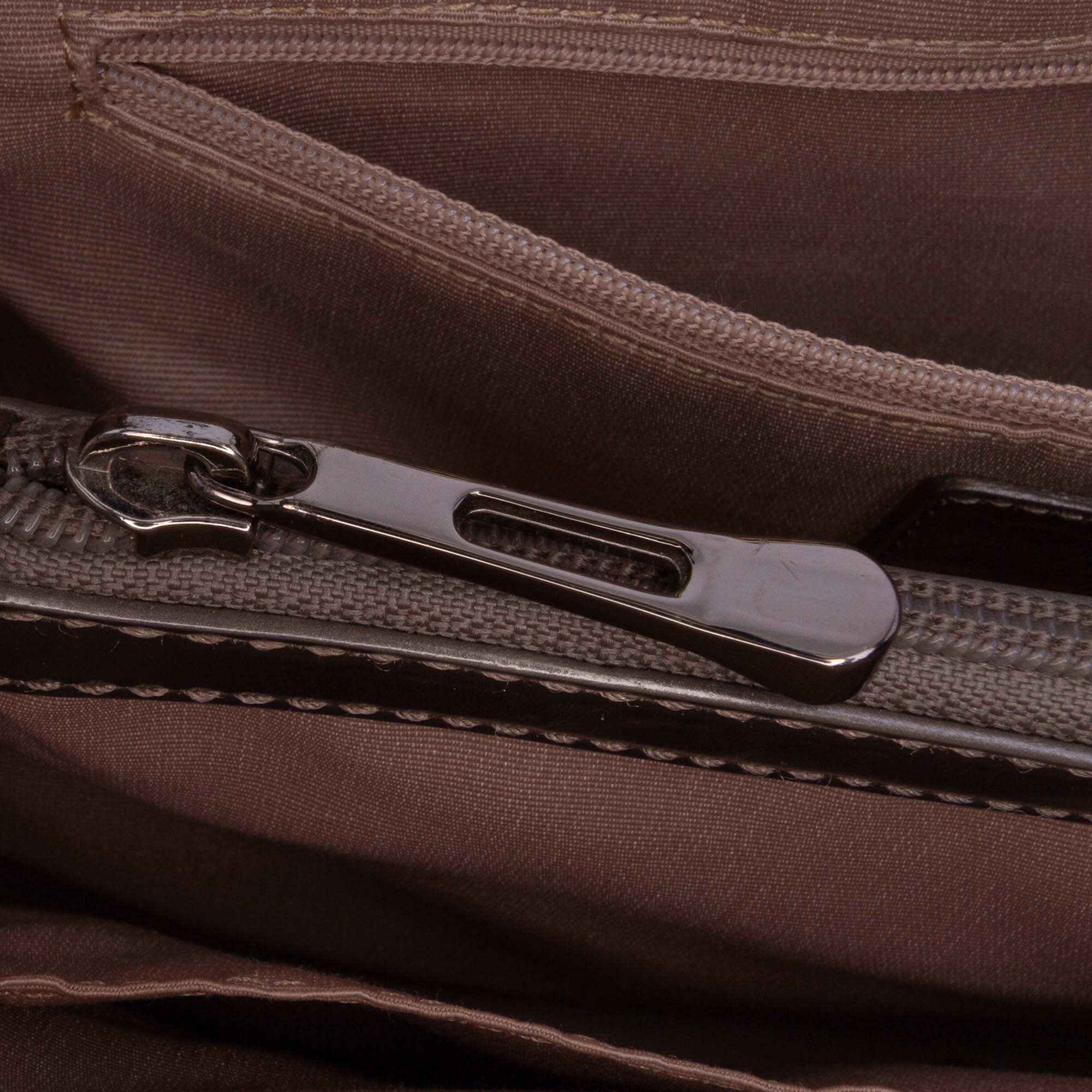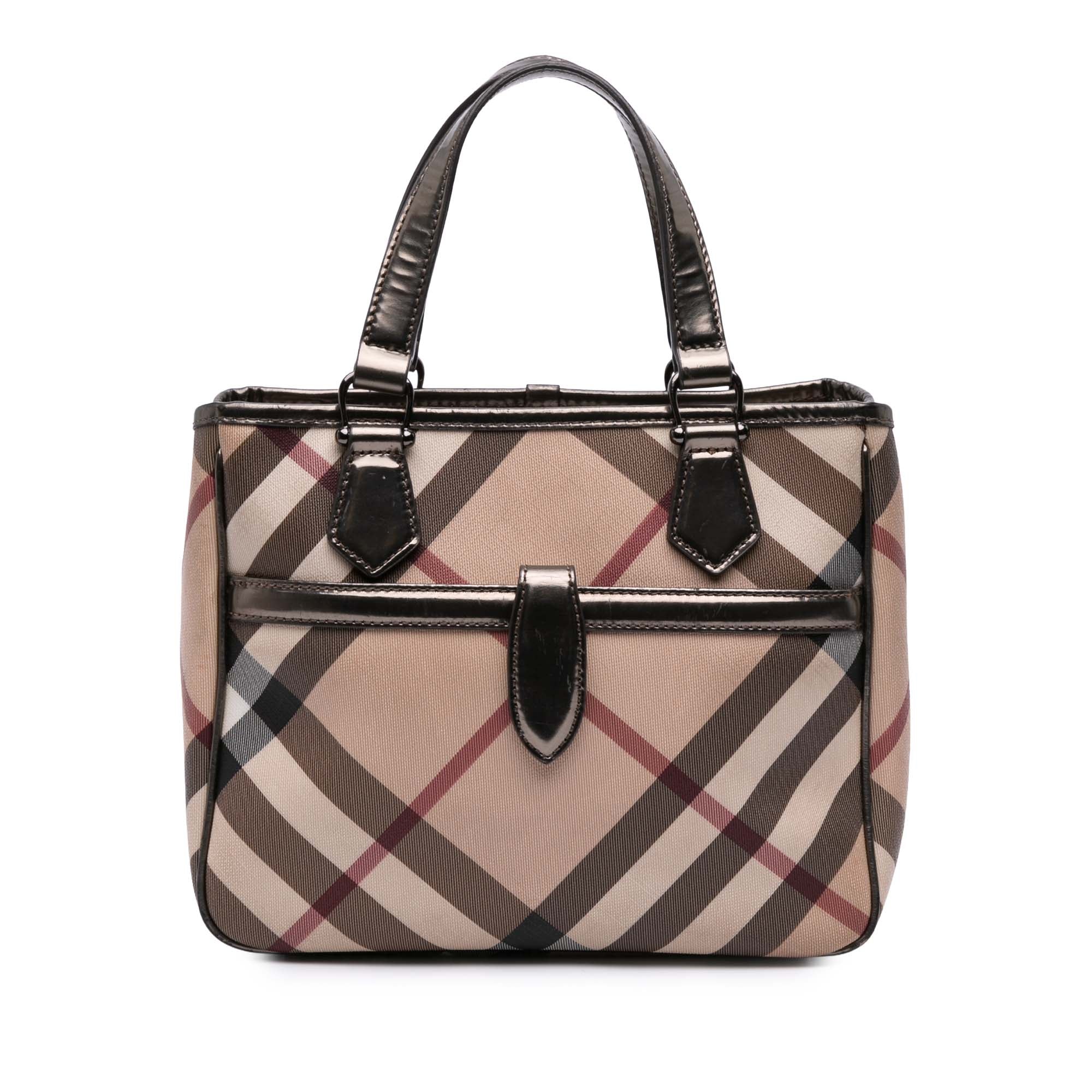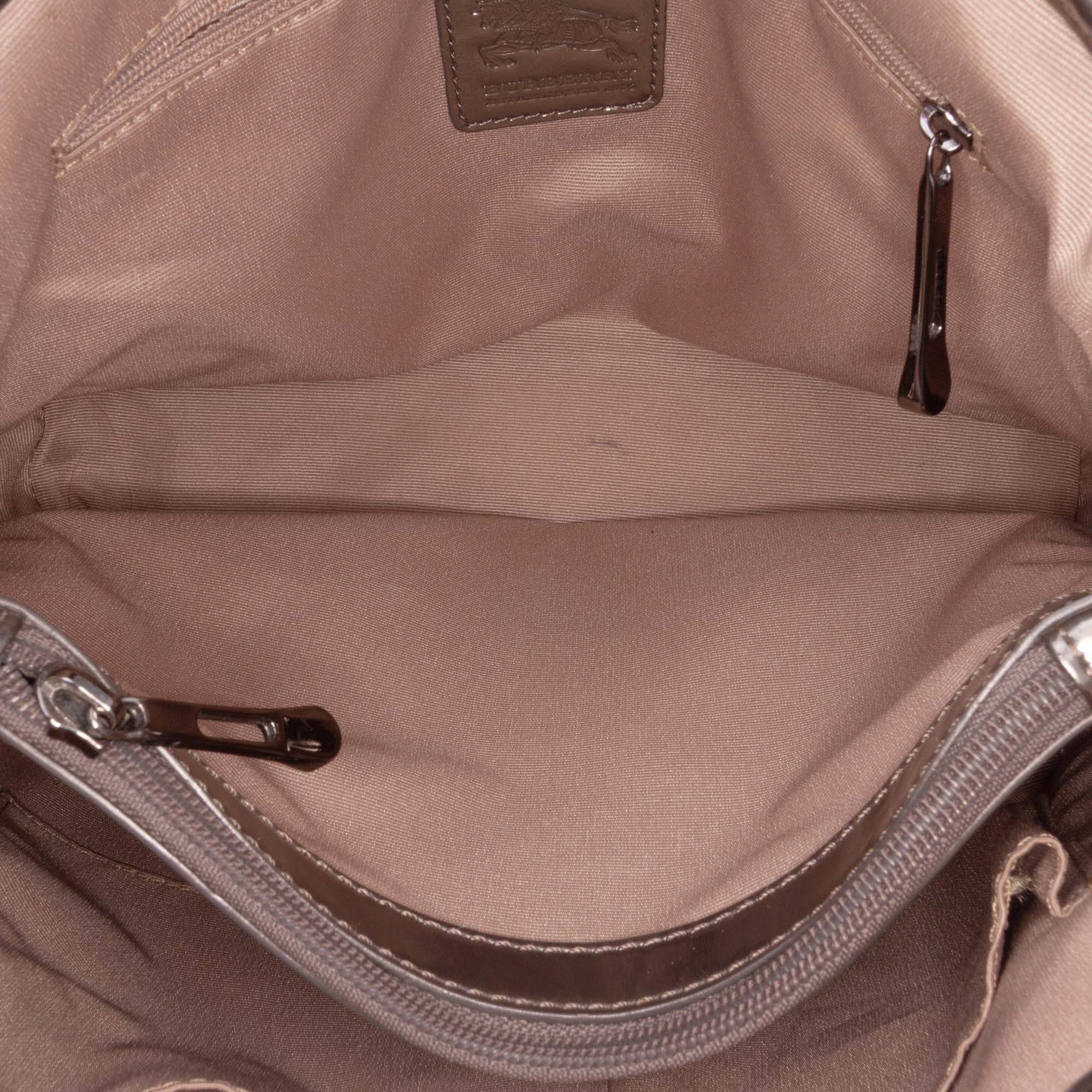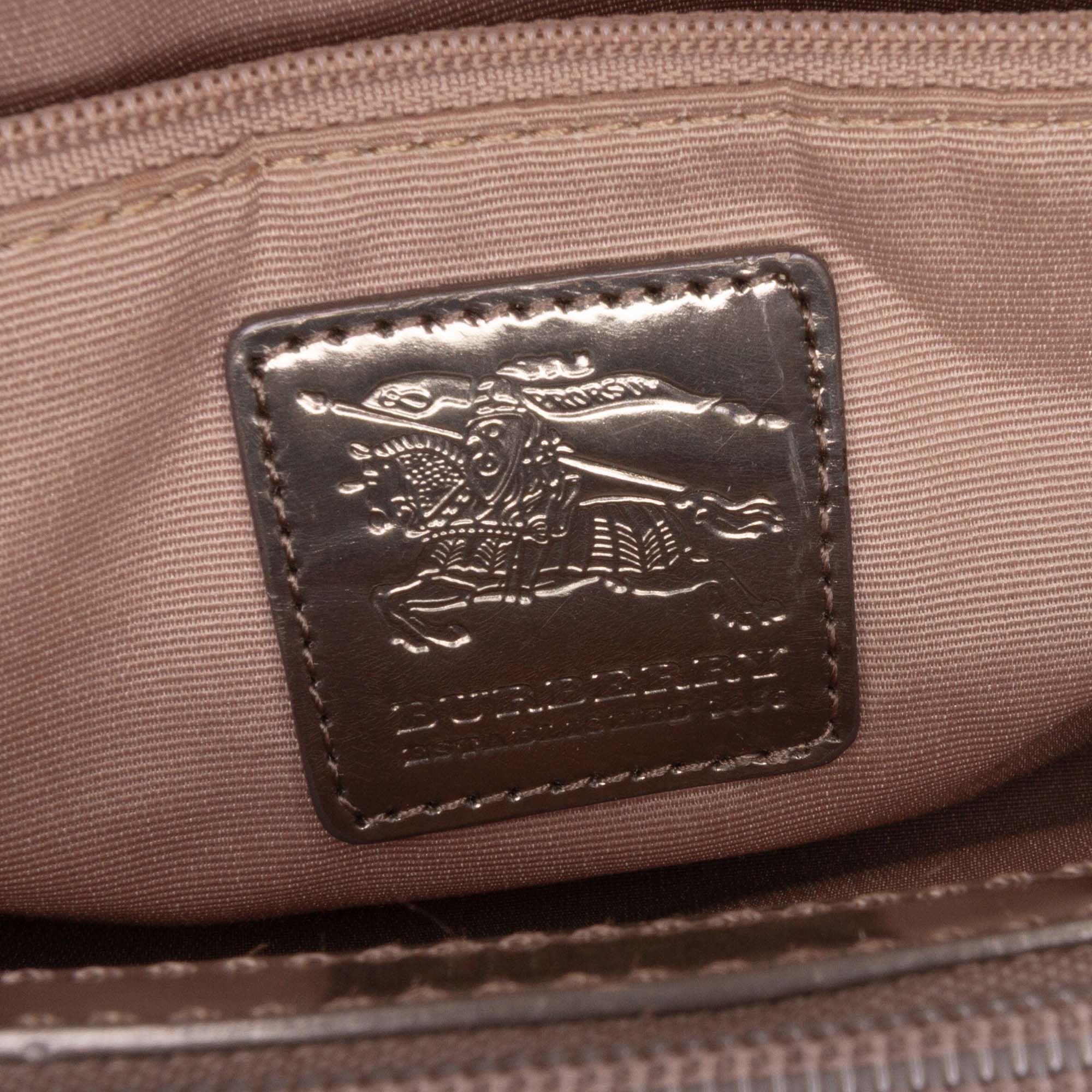 This tote bag features a coated canvas body with patent leather trim, an exterior slip pocket, flat leather straps, an open top, and interior pockets. Retail Price: 1395.00