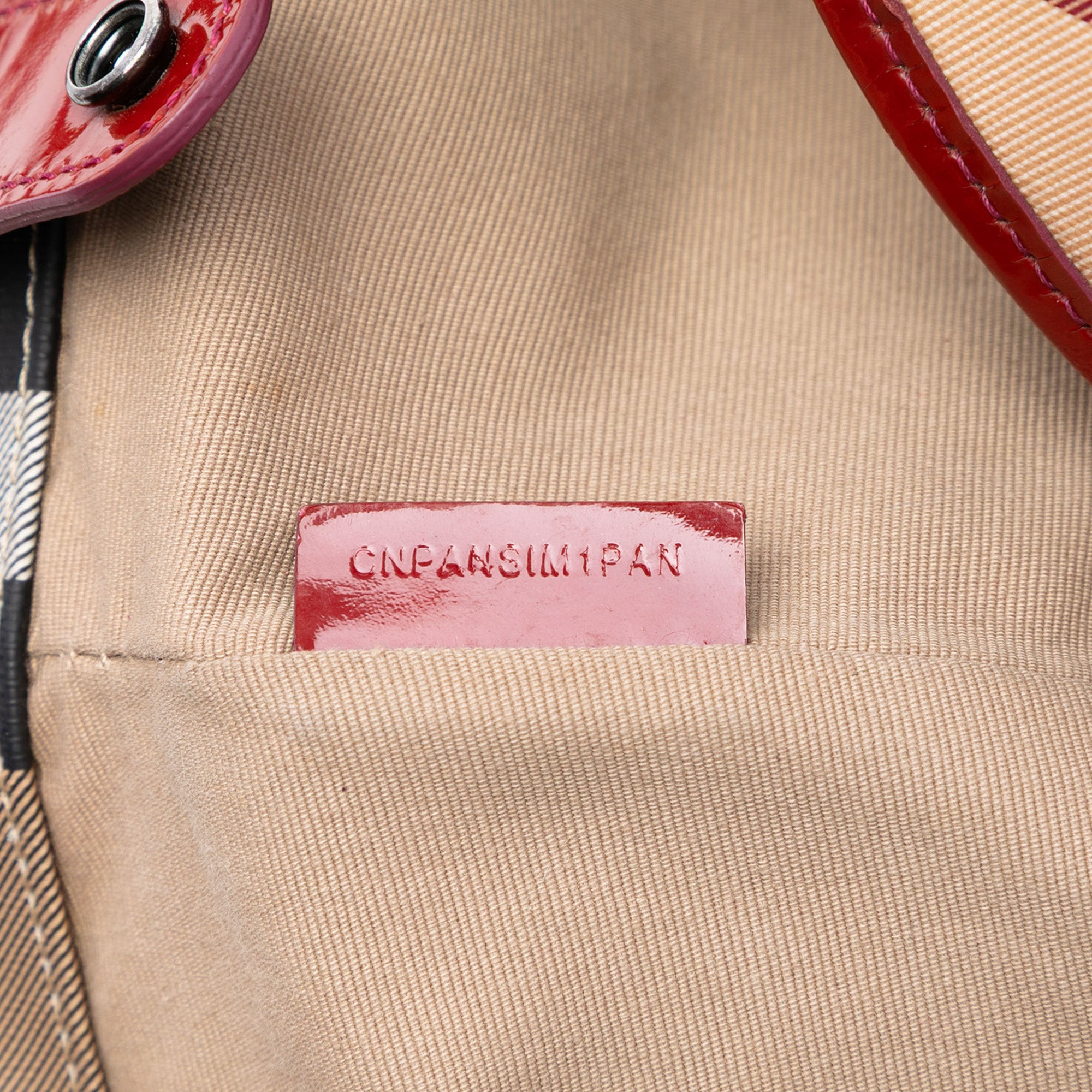 This tote bag features a supernova check coated canvas body with leather trim, flat leather straps, an open top with a magnetic snap closure, and a zip pouch inclusion. Retail Price: 605.00