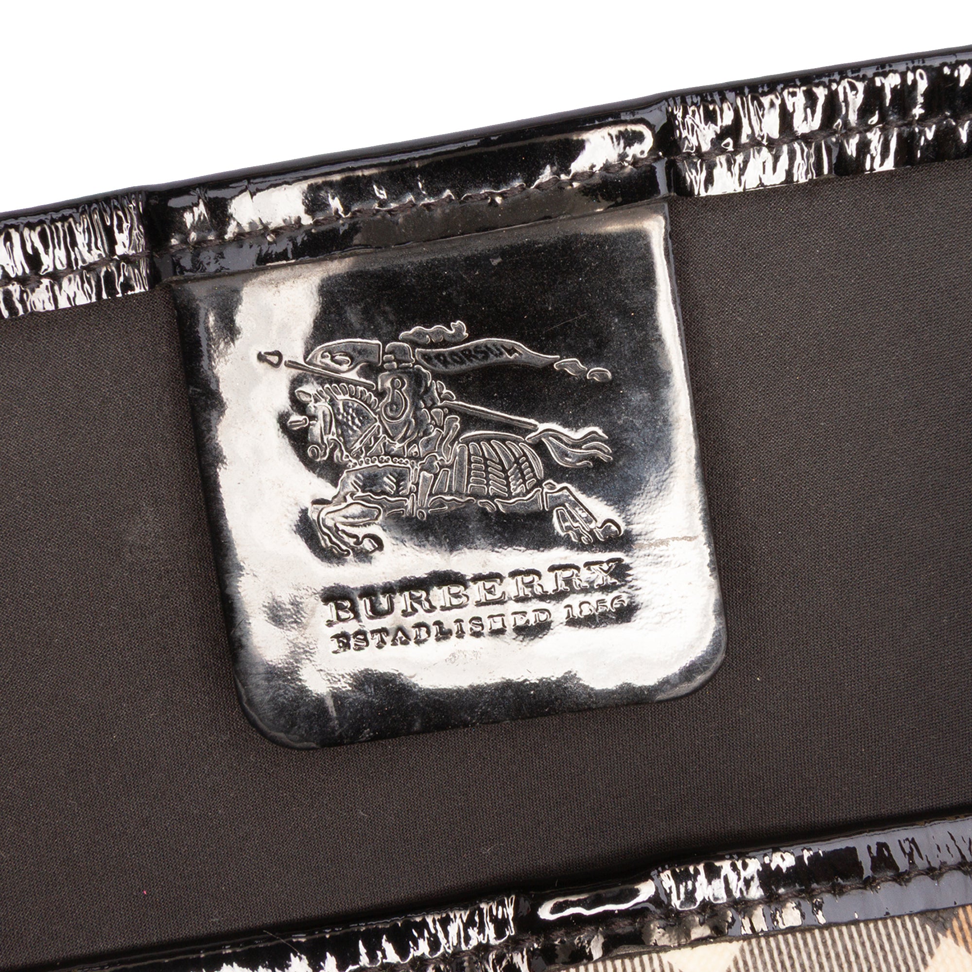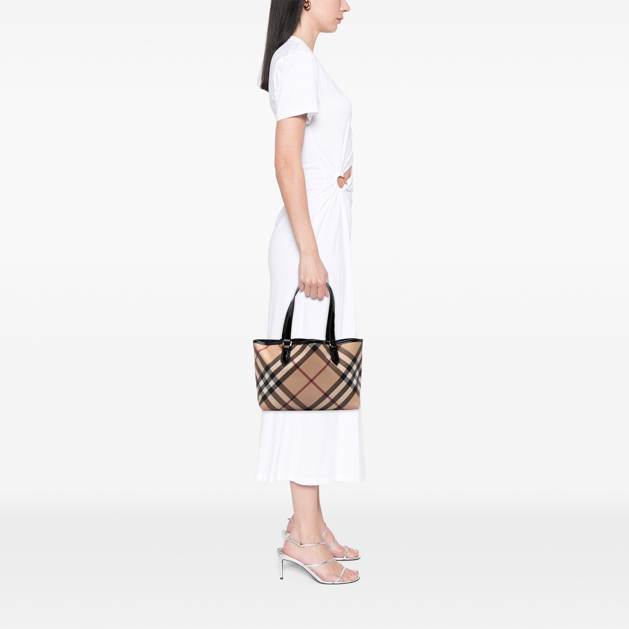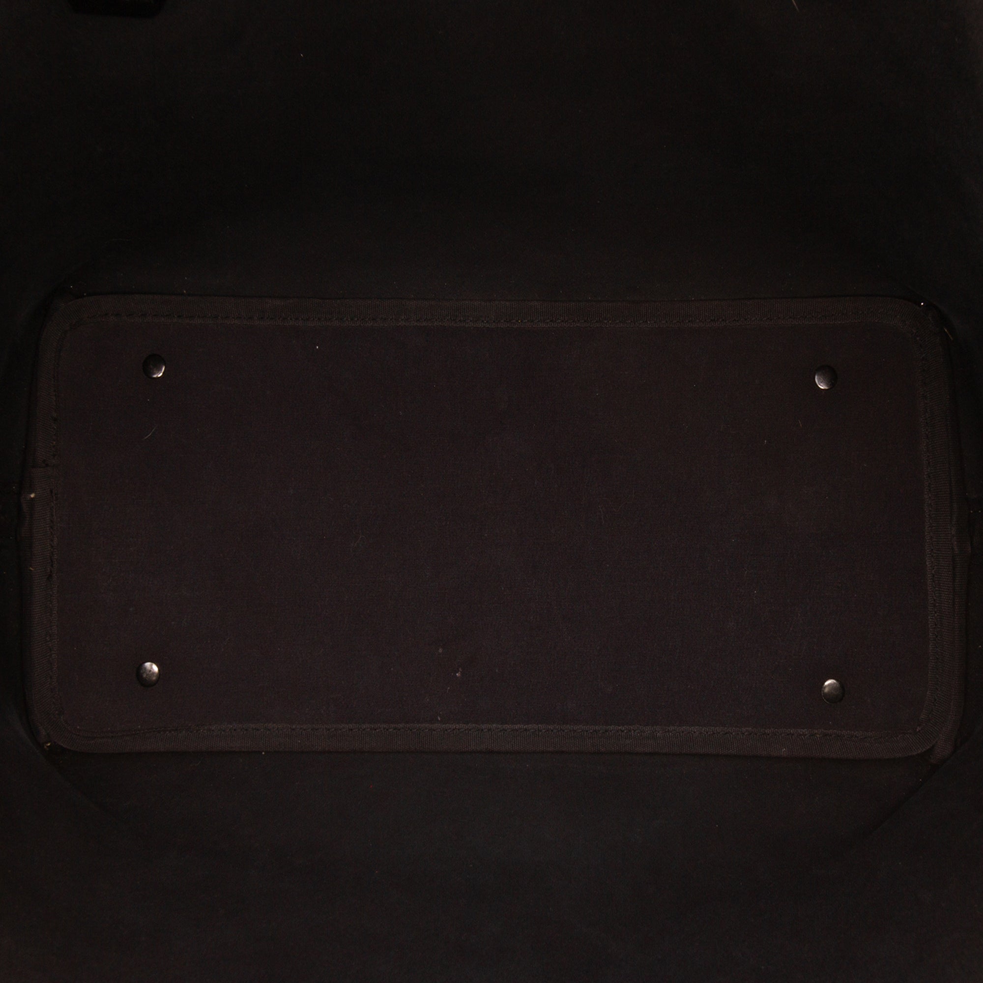 This tote bag features a coated canvas body with patent leather trim, flat patent leather straps, and an open top. Retail Price: 1395.00