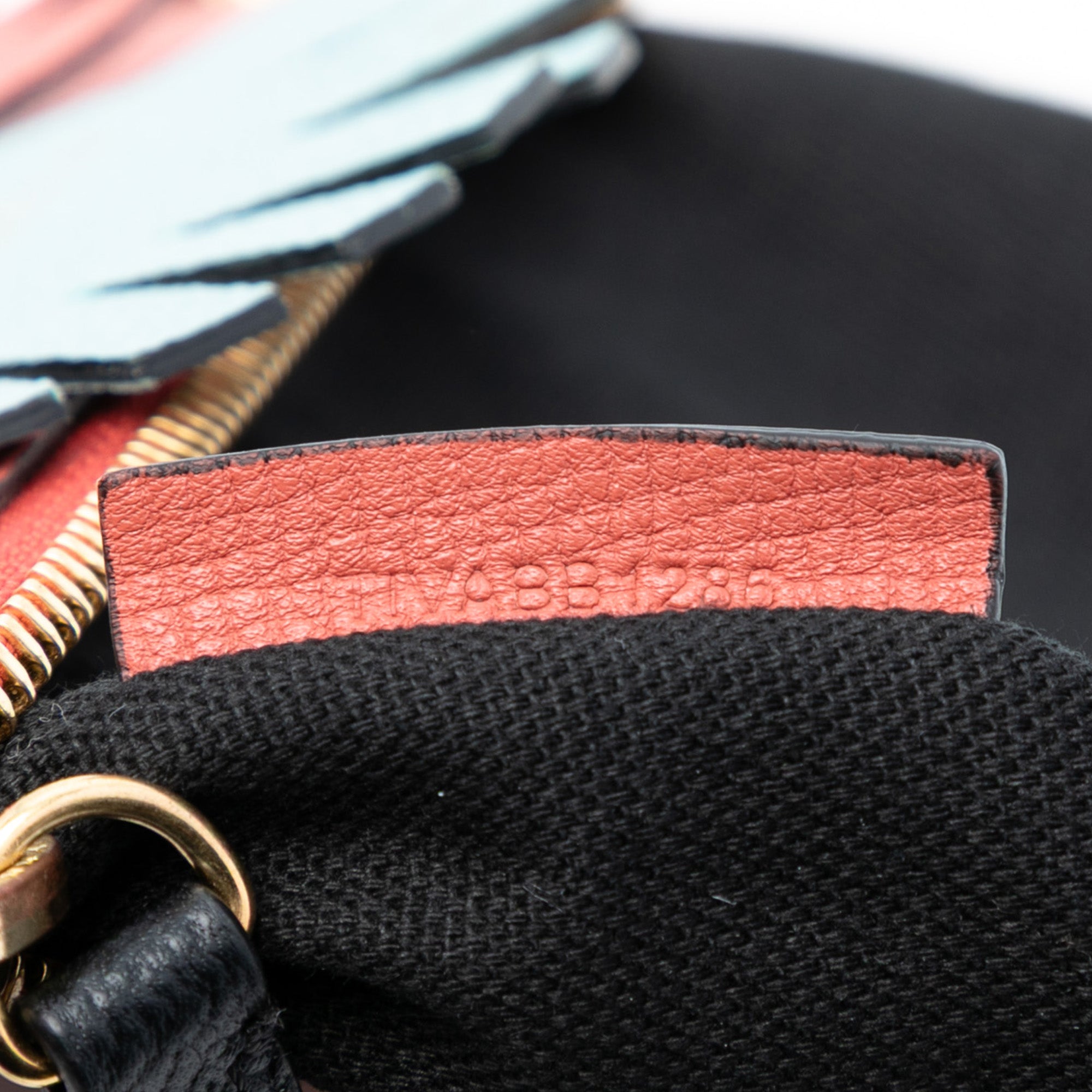 This shoulder bag features a canvas body with leather trim and motif, a flat canvas strap, a top zip closure, and an interior pocket. Retail Price: 595.00