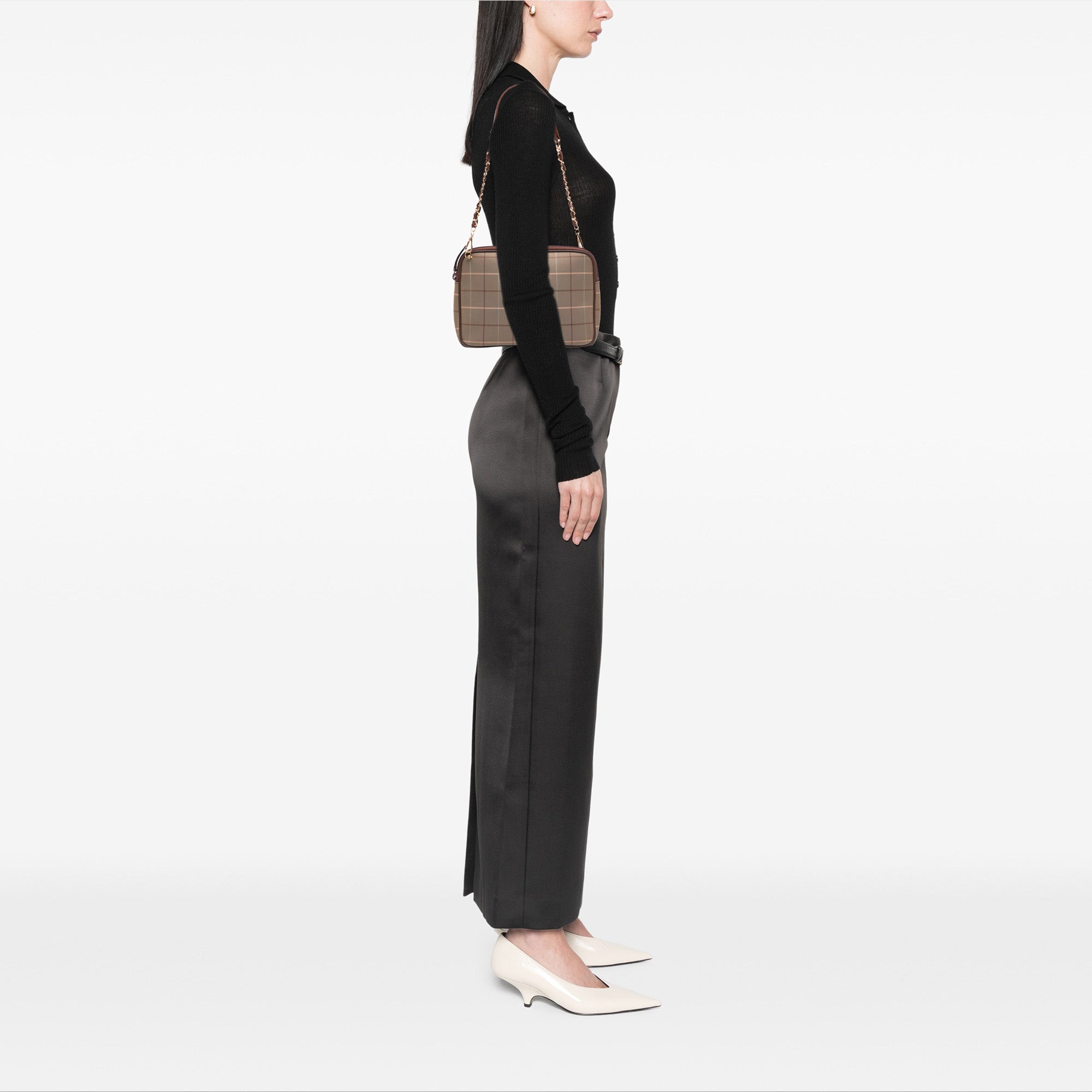 This crossbody bag features a canvas body with leather trim, a detachable chain link strap with leather shoulder guard, and a top zip closure. Retail Price: 875.00