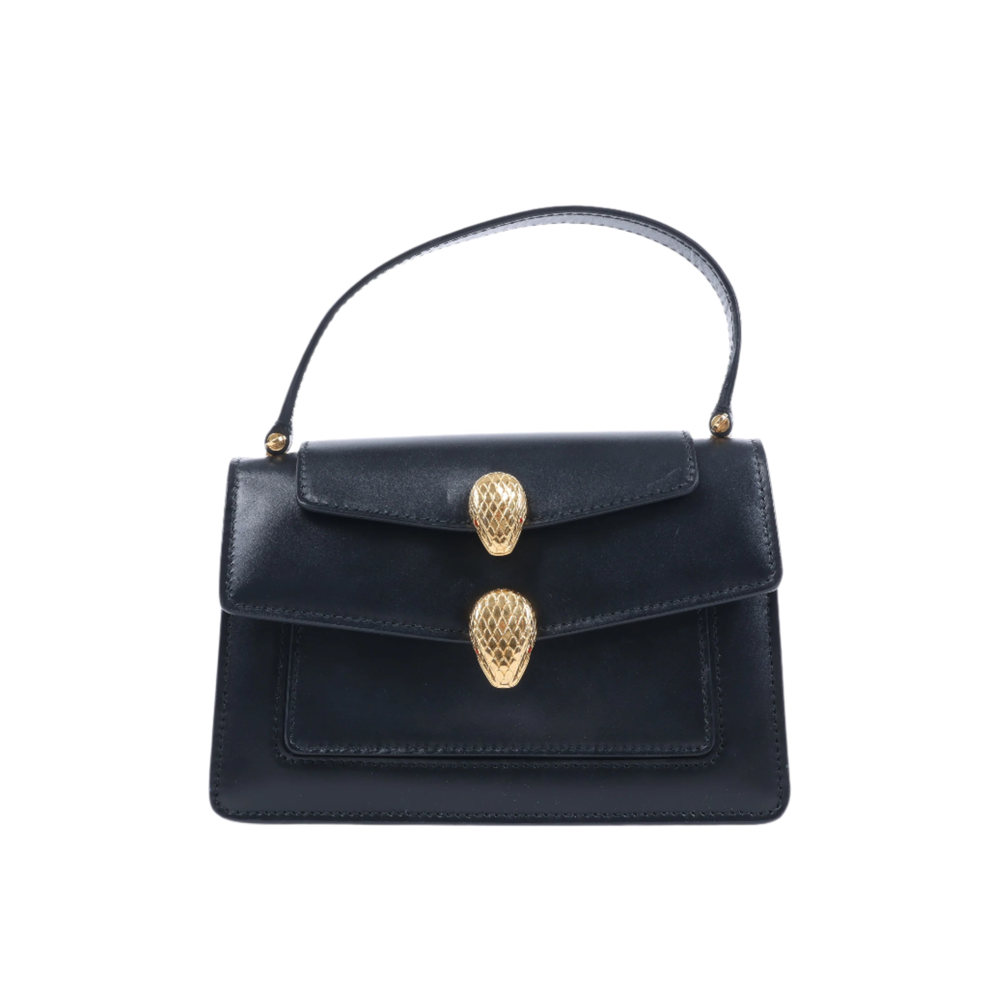 Bvlgari × Alexander Wang Serpenti Handbag in black leather, featuring bold dual serpenthead clasps in gold-tone hardware. A striking fusion of high fashion and iconic luxury.