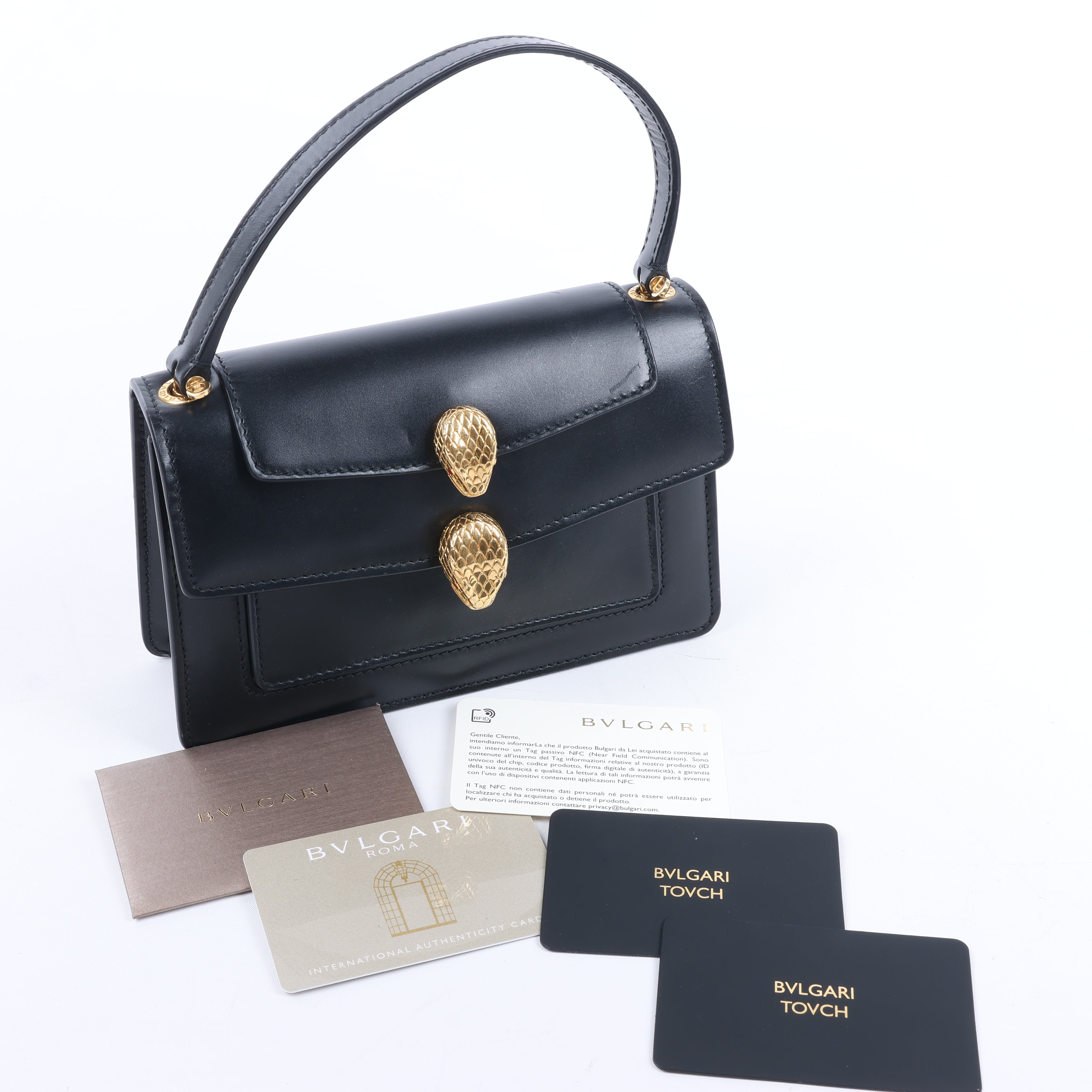 Brand: Bvlgari × Alexander WangModel: SerpentiSize: -Width: 18 cmHeight: 12 cmExterior Condition: ExcellentInterior Condition: ExcellentCondition Details: The exterior is in excellent condition with minor scratches. The hanle is firm and in great condition. Note: There is no shoulder strap. The hardware has surface scratches but remains bright. The interior is clean and in excellent condition, except usage scratches.Colour: BlackInterior Colour: BlackHardware Colour: GoldMaterial: LeatherComes With: Paper, certificate