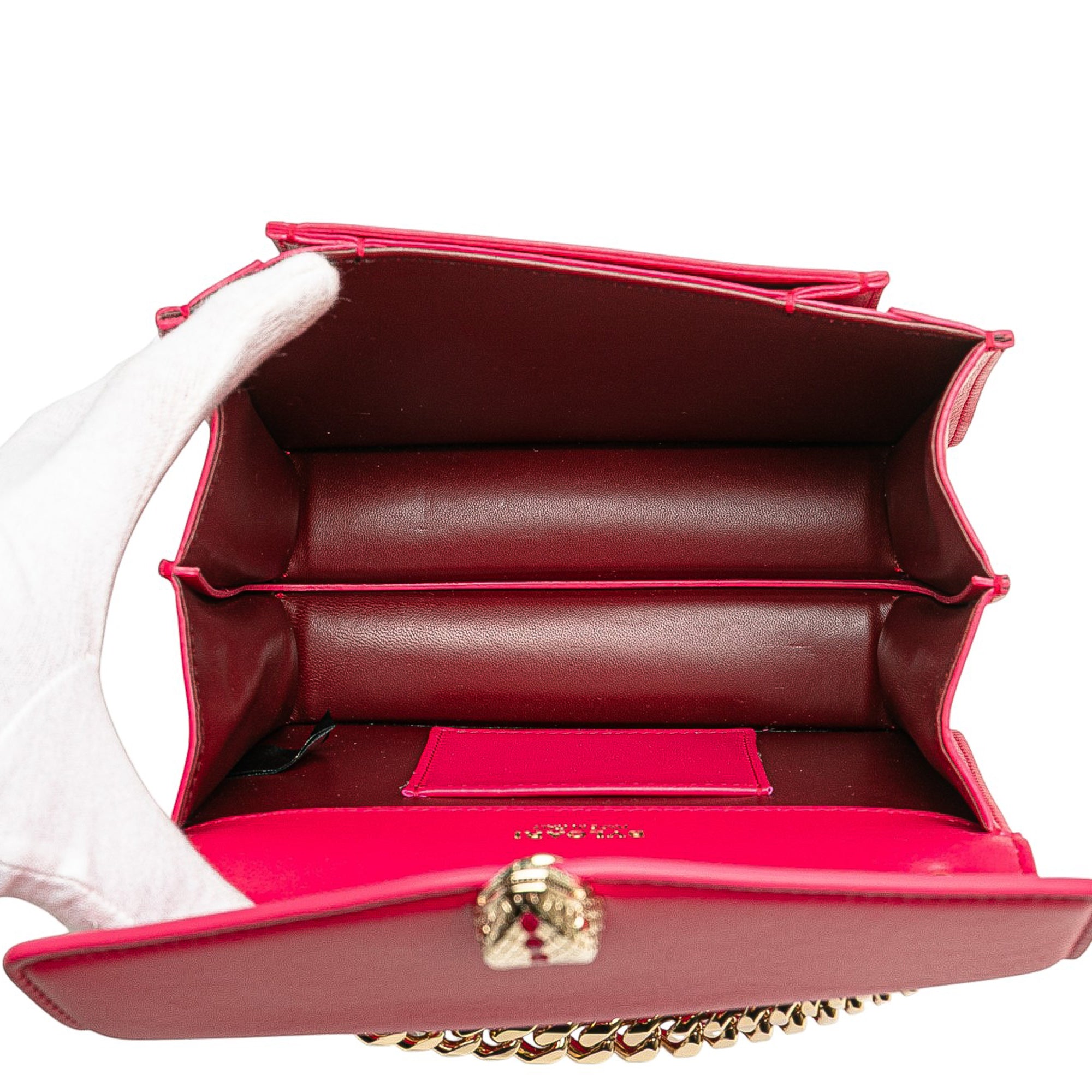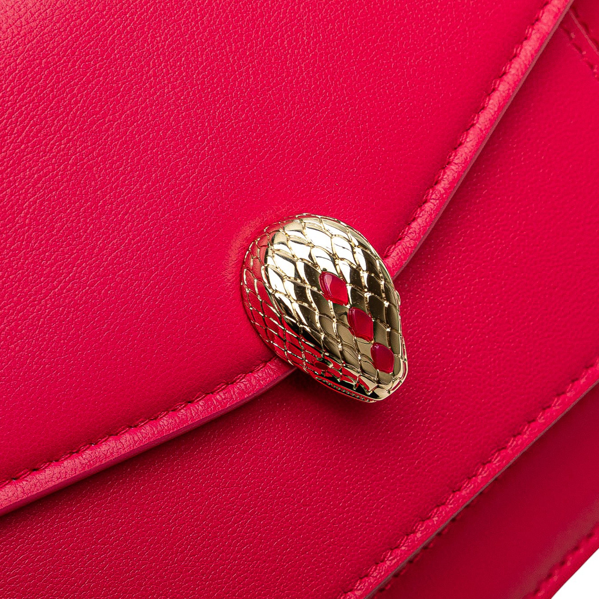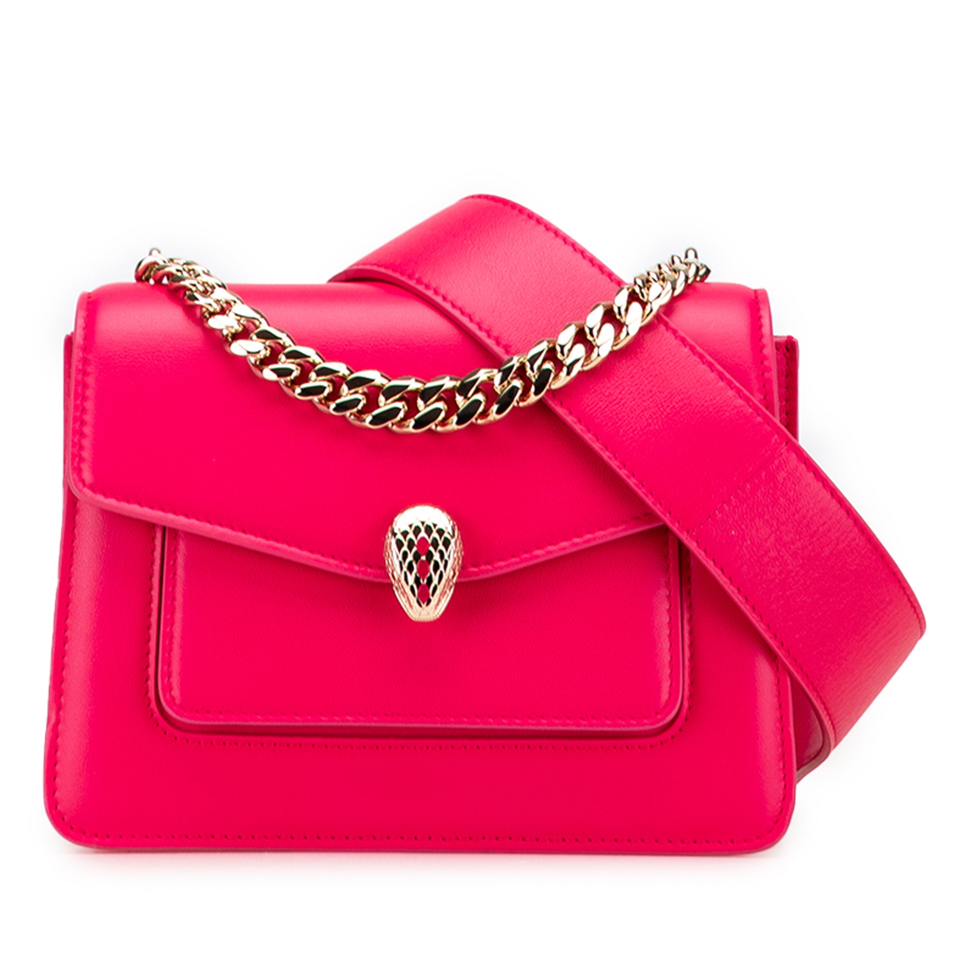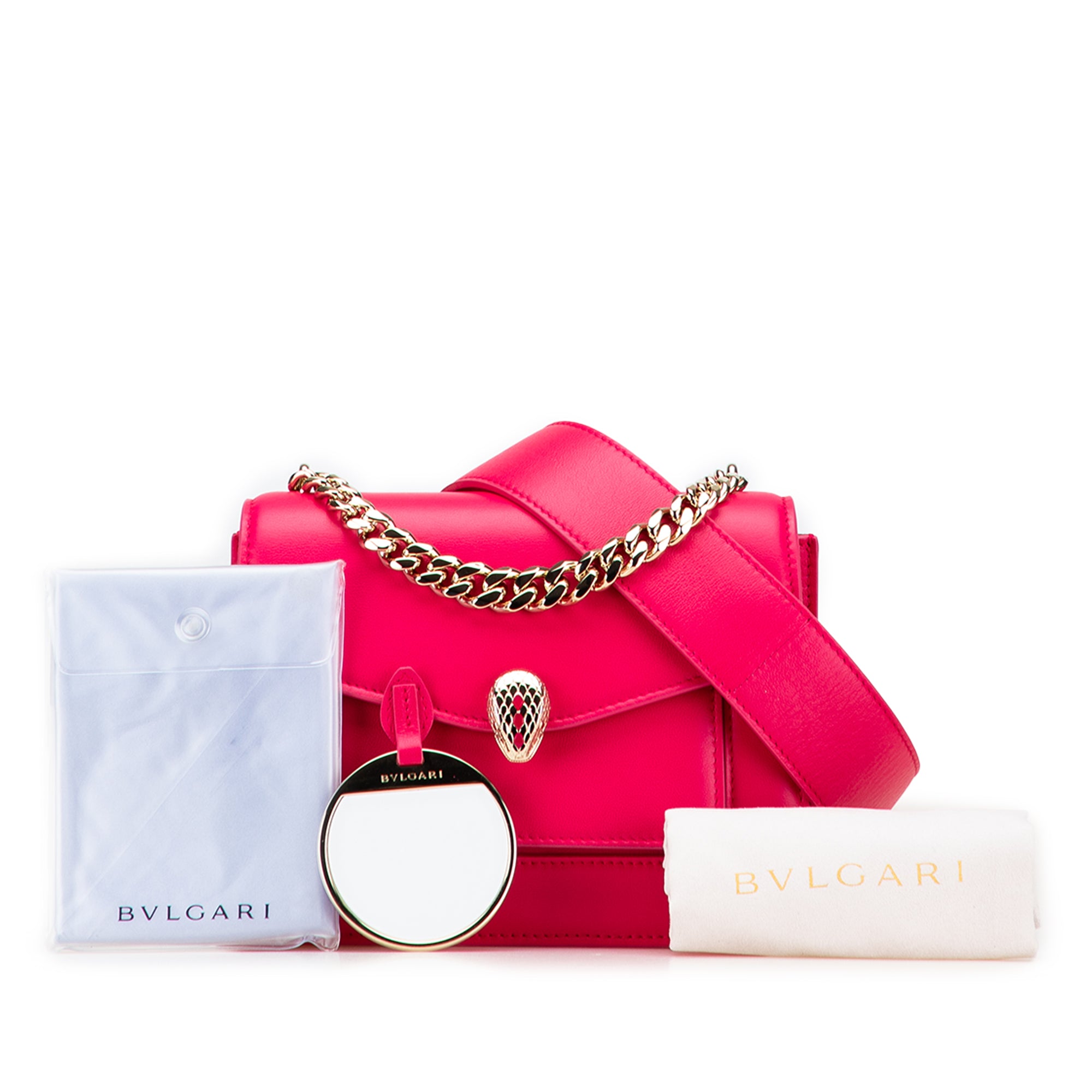 The Serpenti Forever satchel features a leather body, a chain link top handle, a detachable flat leather strap, a front flap with snap closure and serpenti adornment, and an interior slip pocket. Inclusion: Dust bag. Retail Price: 3875.00