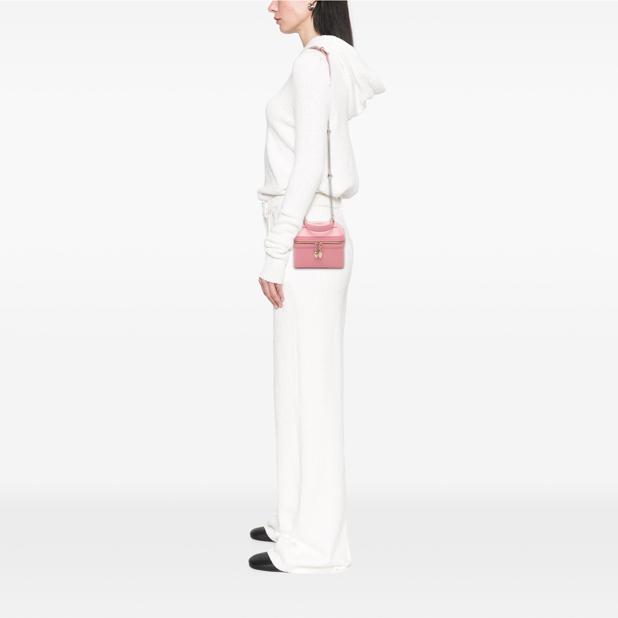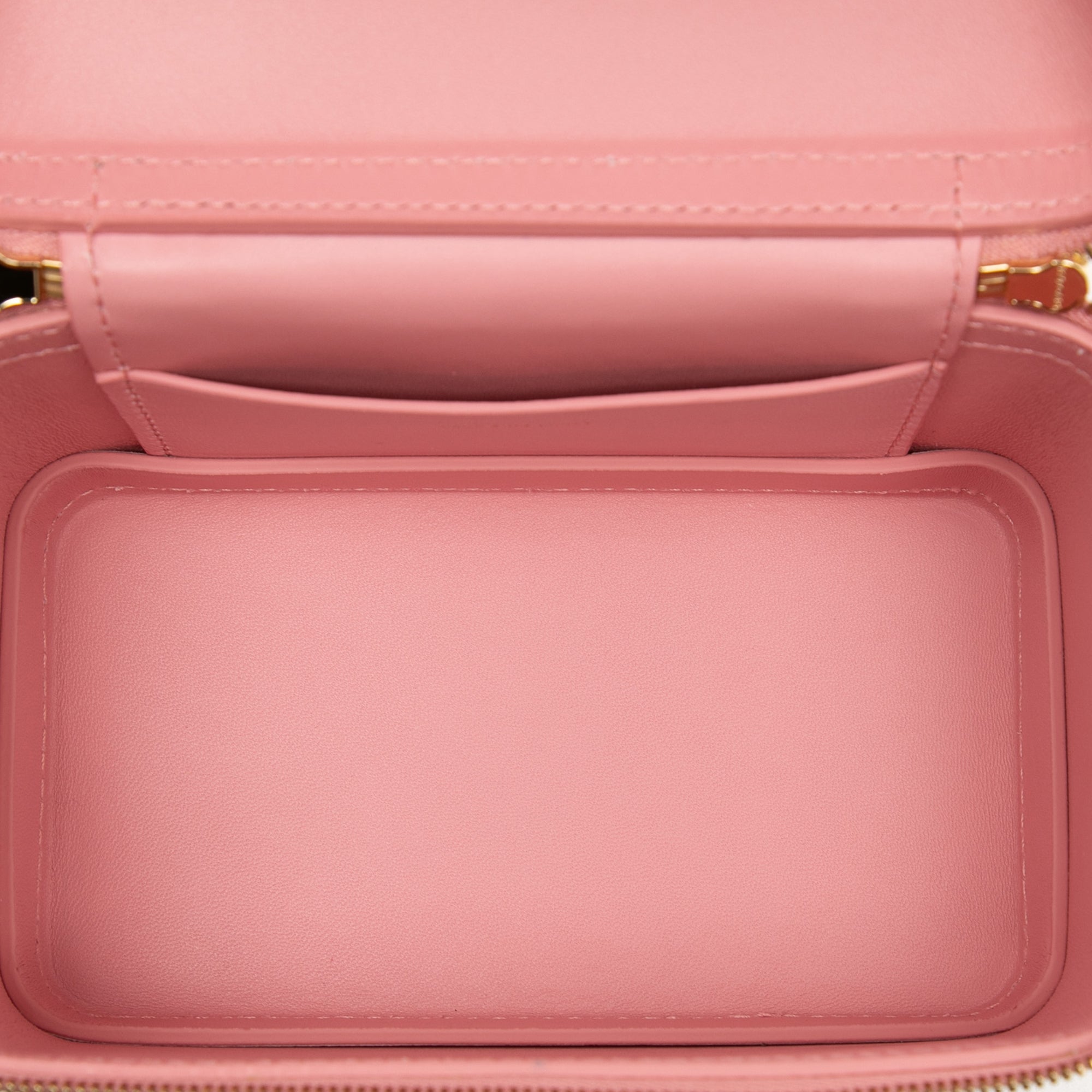 This vanity bag features a leather body, a flat leather top handle, a chain link strap with leather guard, a zip around closure, and interior slip pockets. Inclusion: Dust bag. Retail Price: 2500.00