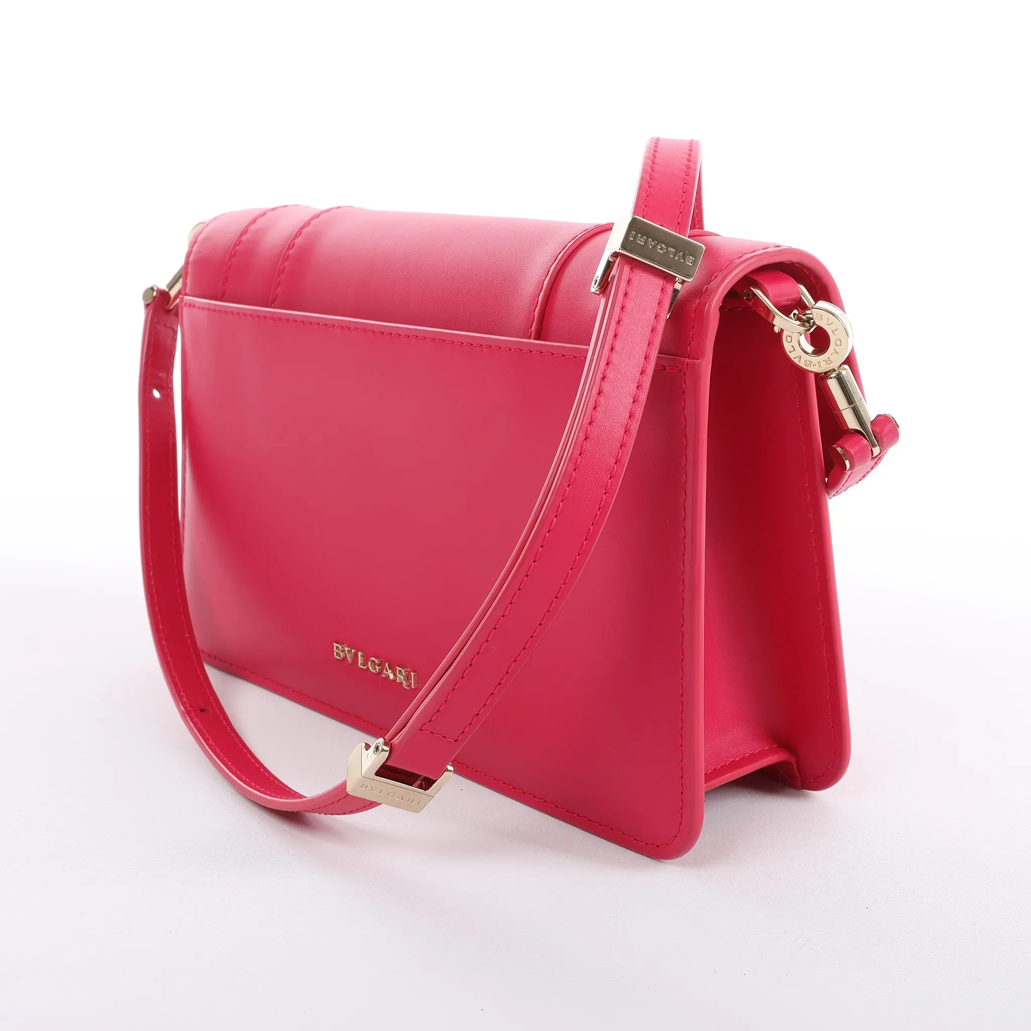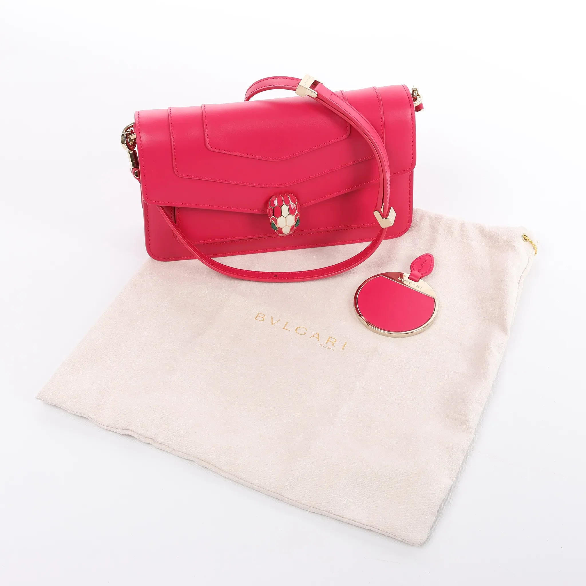 Bold, polished, and instantly recognizable. The BVLGARI Serpenti Forever crossbody in vivid pink leather is finished with the signature enamel snakehead clasp—compact, structured, and made for day-to-night impact.