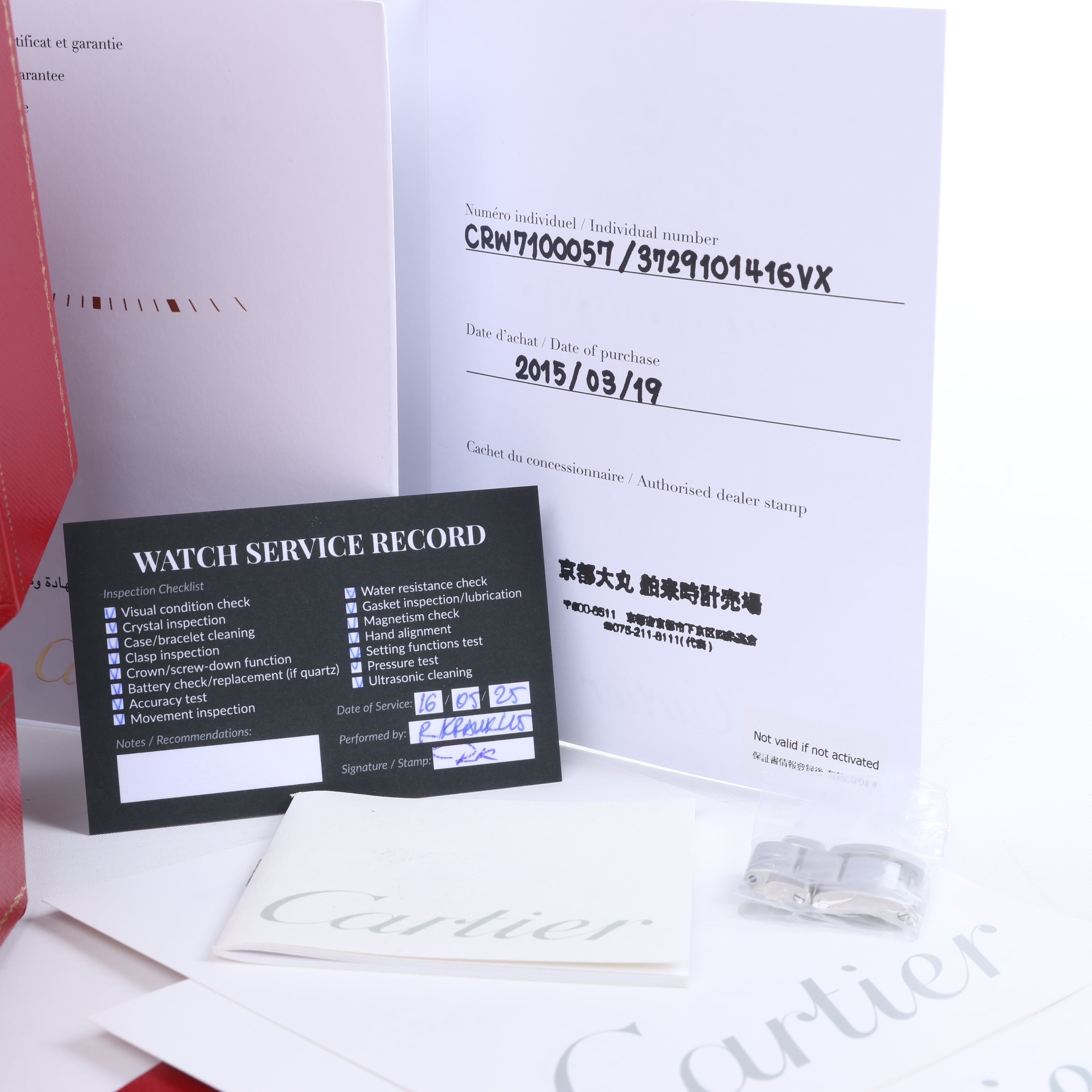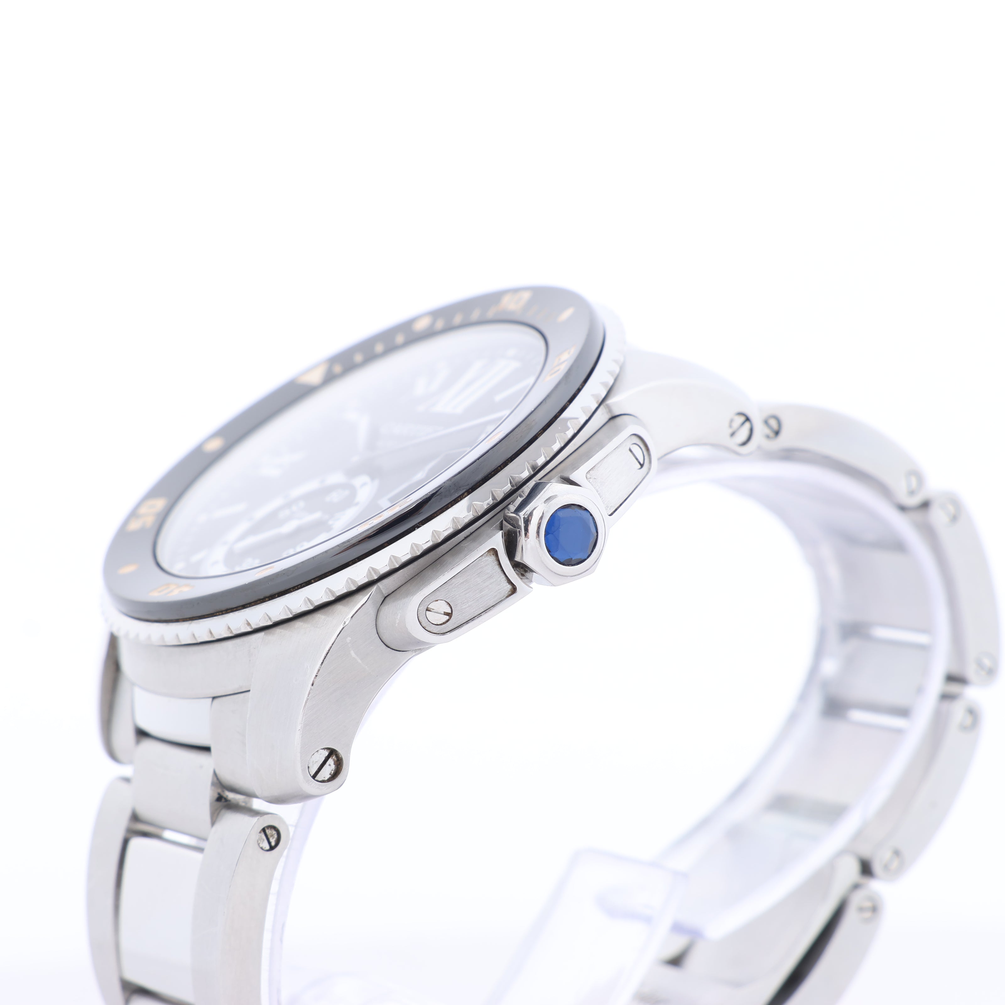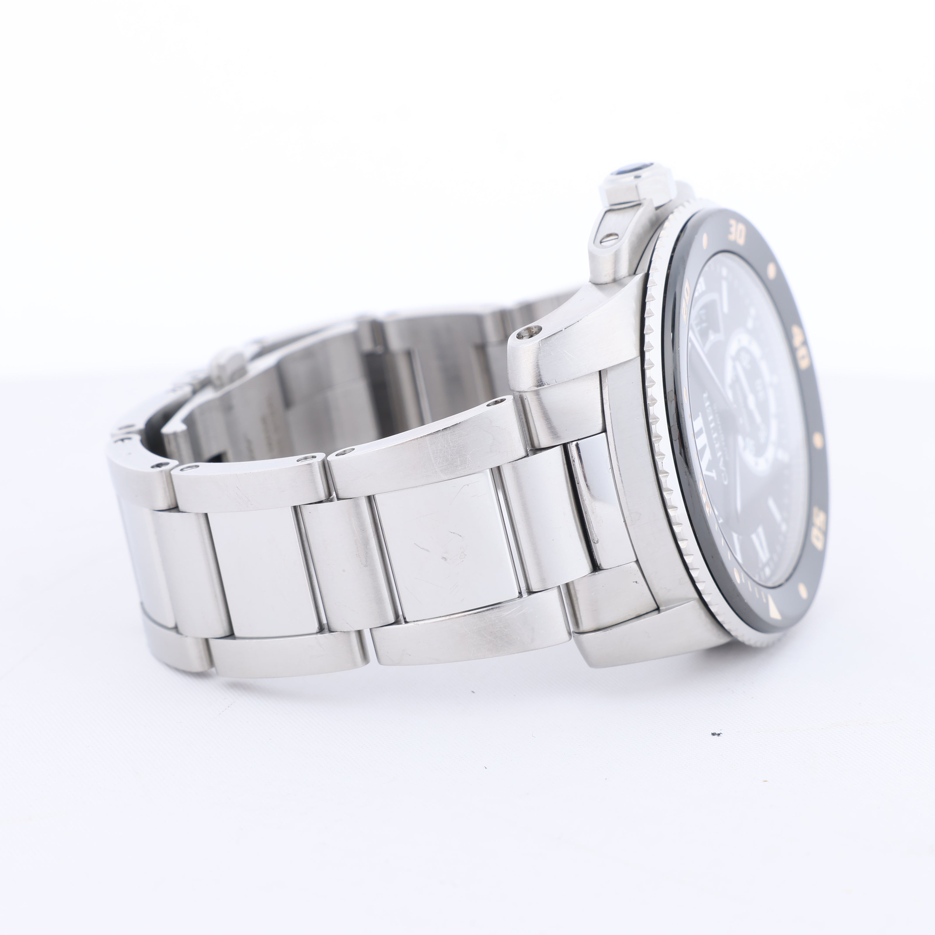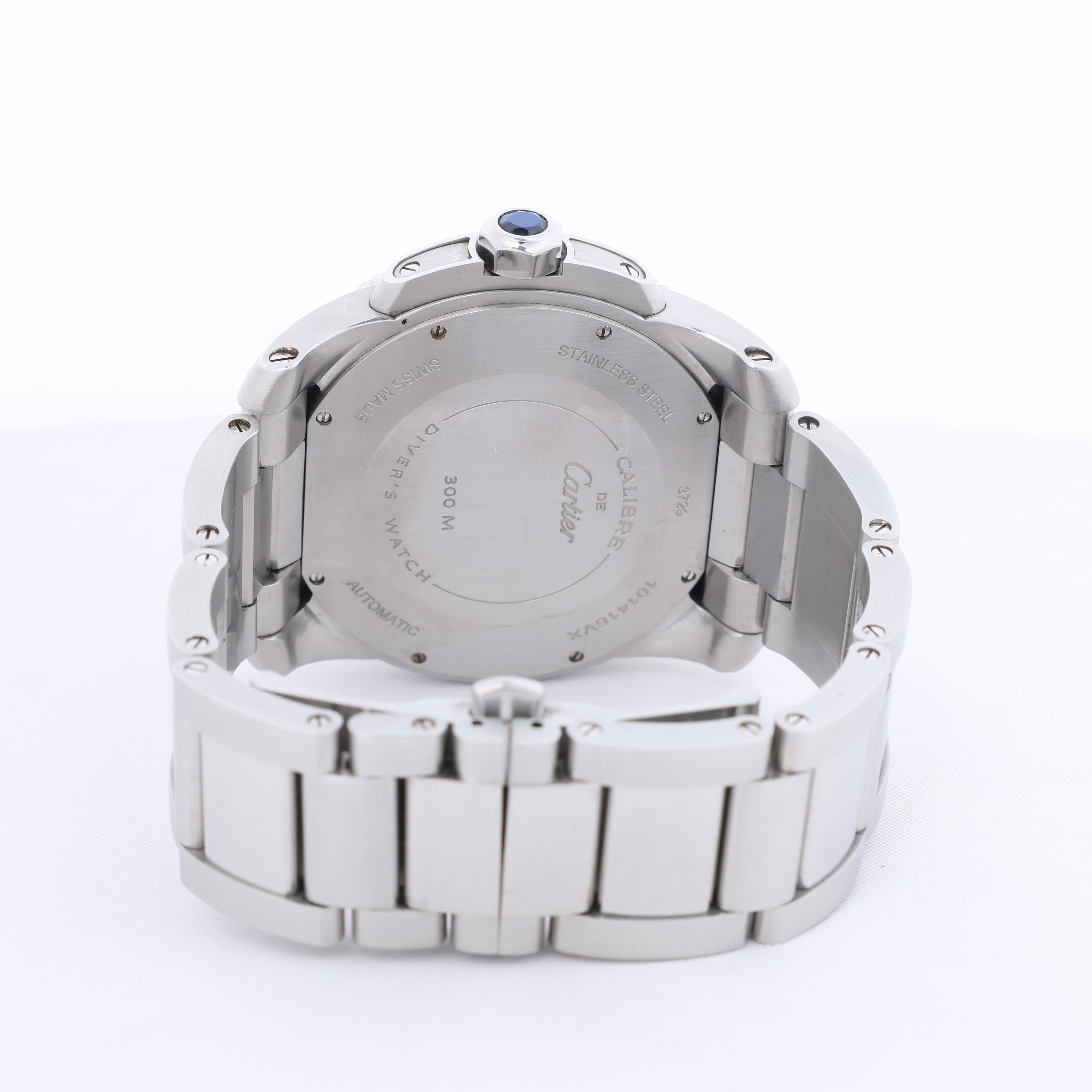 Brand: Cartier Model: CalibreReference: W7100057Condition: Excellent Condition Details: In excellent condition with almost no signs of wear with some scratches, see photos for reference. Has just been checked and serviced. Dial Colour: BlackCase Material: Stainless steel Starp Colour: SilverStrap material: Stainless SteelMovement: AutomaticFace Diameter: 43 mm Approx. max circumference: 17.5 cm + 2 extra linksComes With: Box (damaged), papers, certificate, Service card