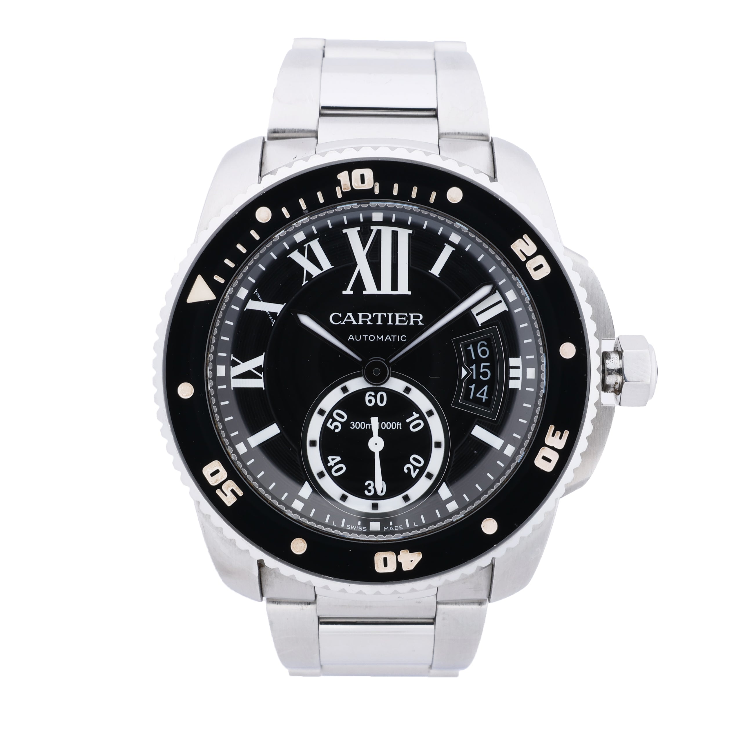 Cartier Calibre de Cartier Diver W7100057 features a bold black dial, unidirectional bezel, and stainless steel case and bracelet. Water-resistant to 300m, this automatic timepiece fuses sporty dive functionality with signature Cartier elegance.
