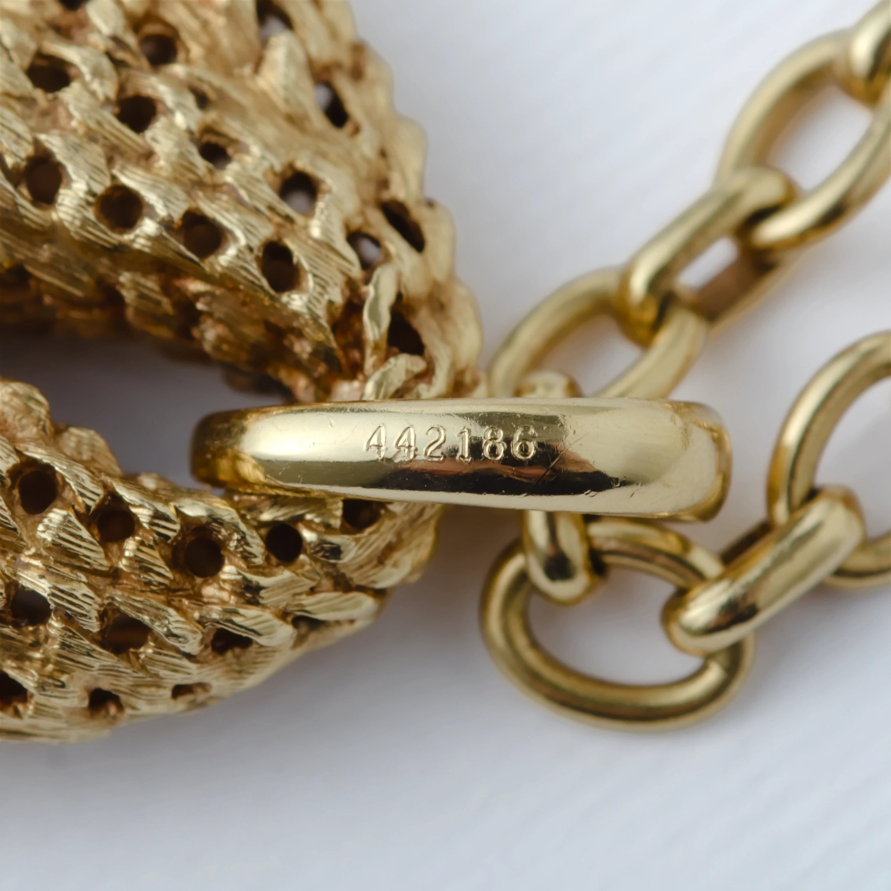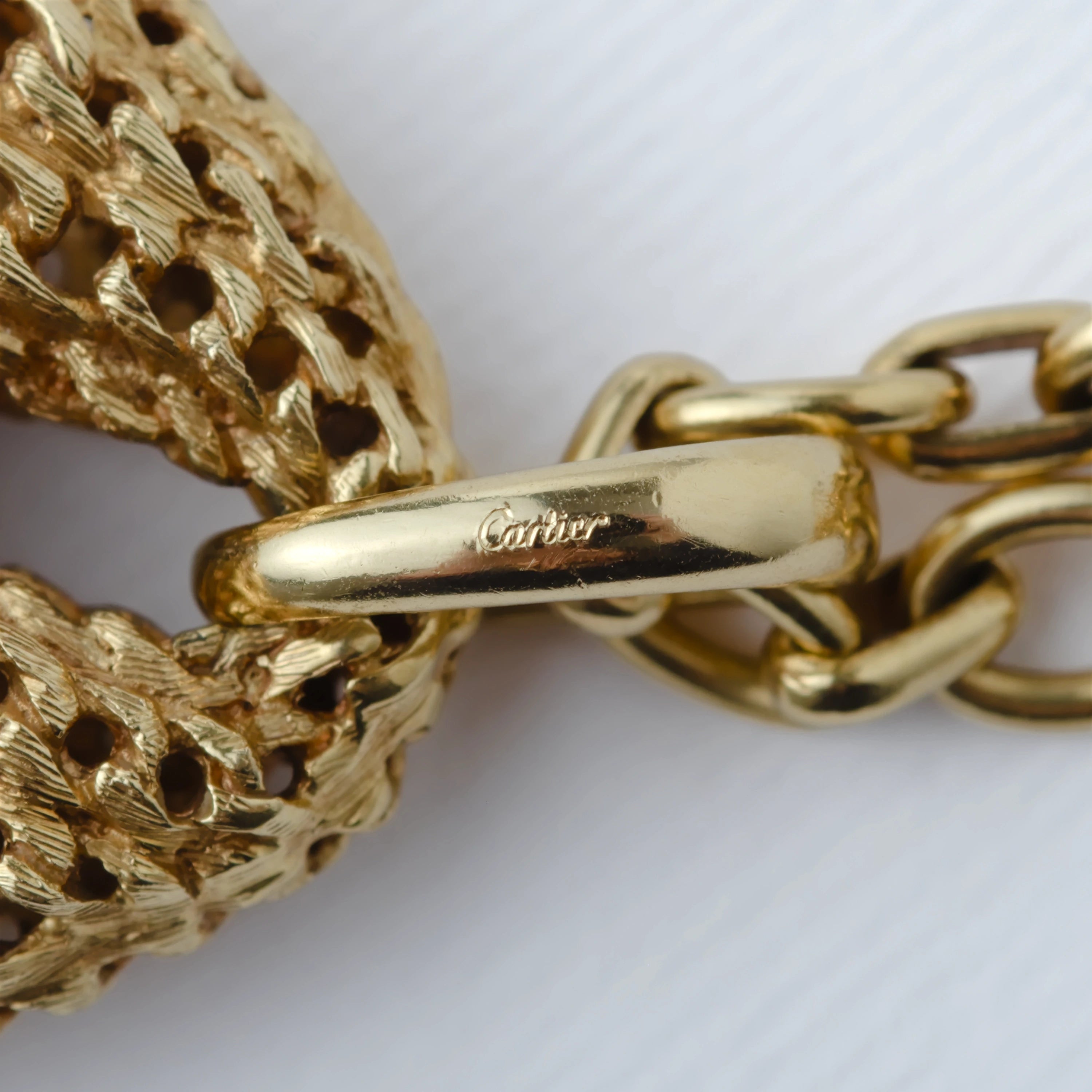 The pendant displays remarkable three-dimensional detailing, from the textured fleece to the finely modeled head, reflecting Cartier’s exceptional savoir-faire of the era. Suspended from its original yellow gold chain, this piece embodies the bold yet timeless aesthetic that defines Cartier’s collectible designs of the 1970s.