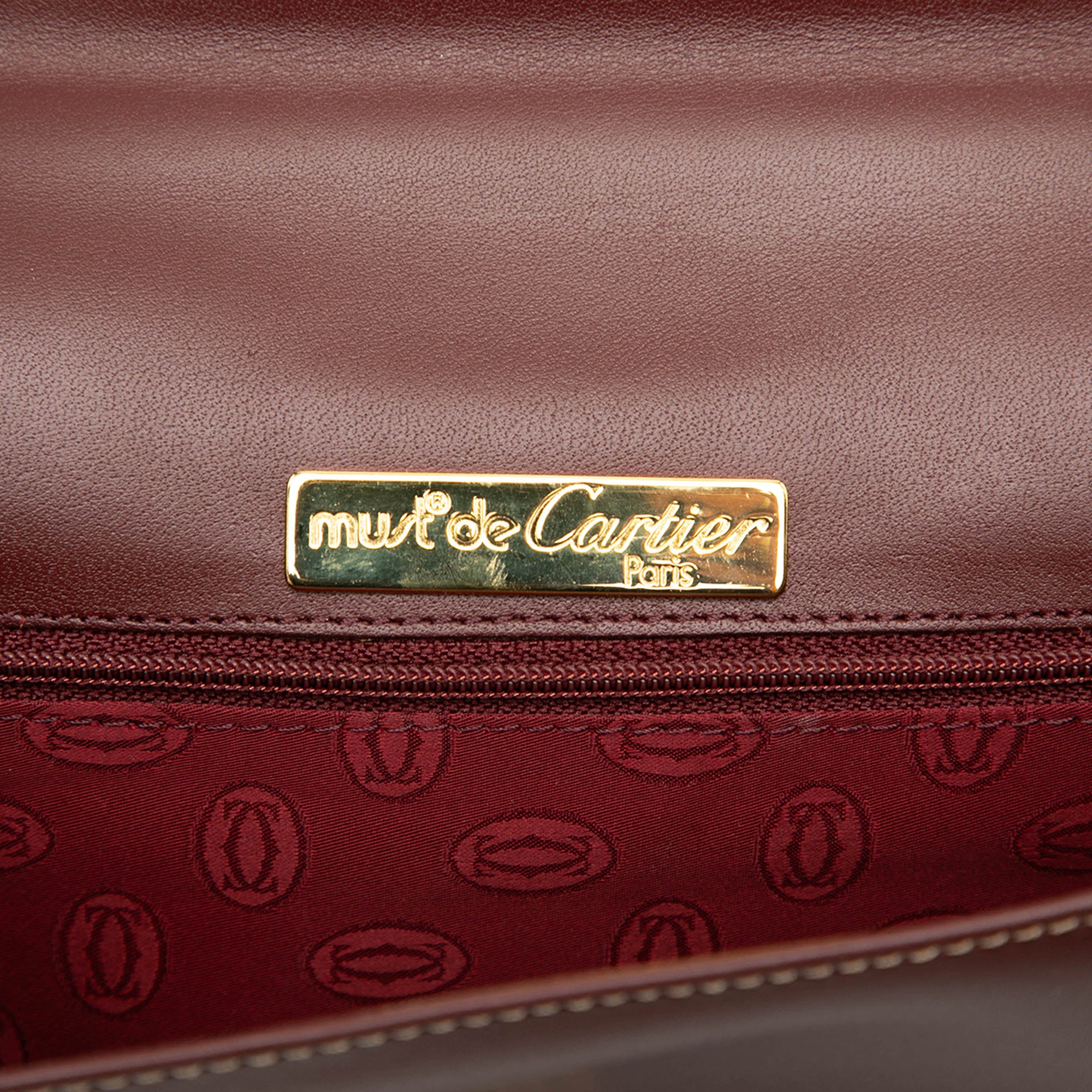 The Must De Cartier crossbody bag features a leather body, an exterior back slip pocket, an adjustable flat leather strap, a front flap with snap button closure, and interior zip and slip compartments. Inclusion: Dust bag, authenticity card. Retail Price: 1150.00