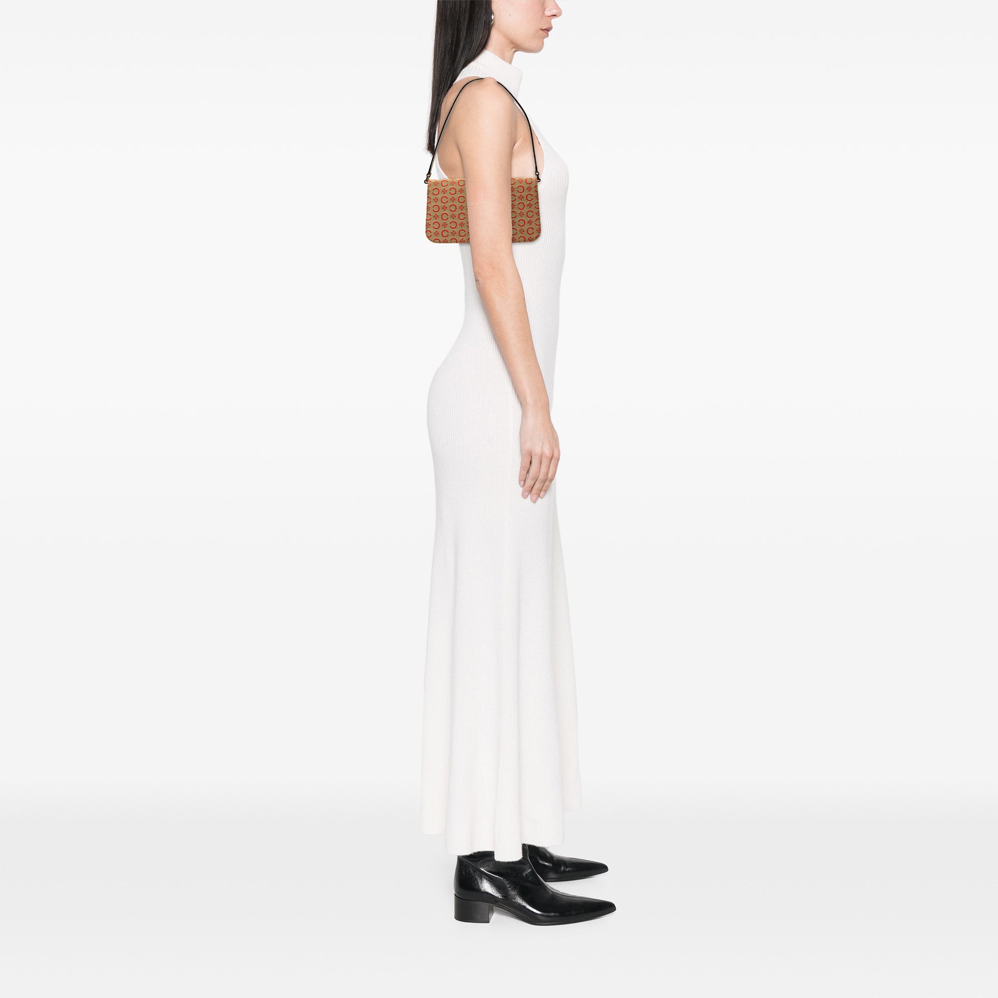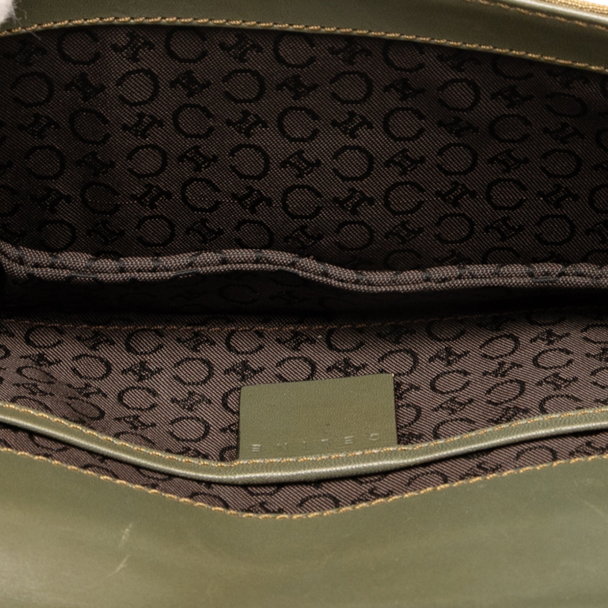 This shoulder bag features a canvas body, a flat leather strap, a front flap with magnetic snap closure, and an interior slip pocket. Retail Price: 1450.00