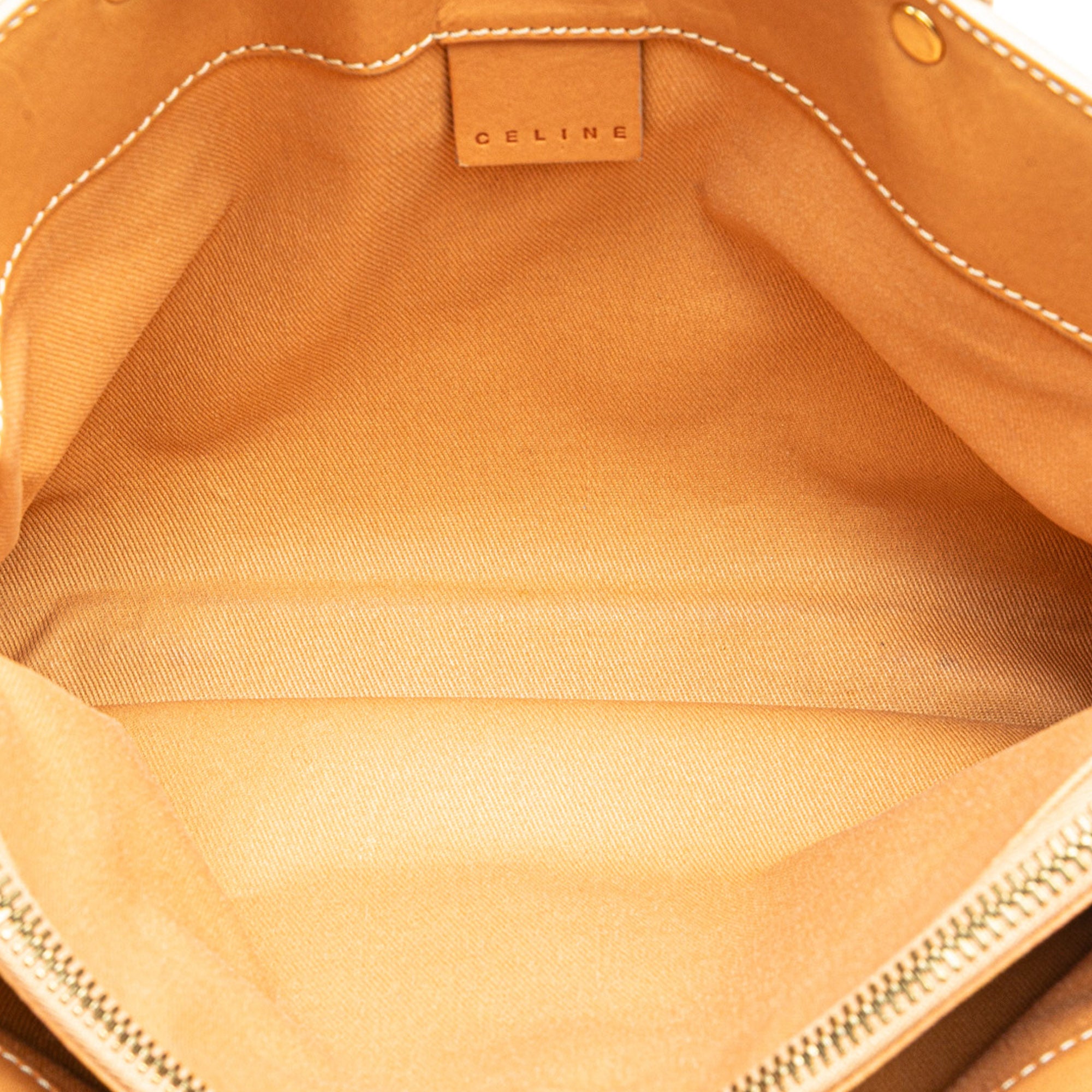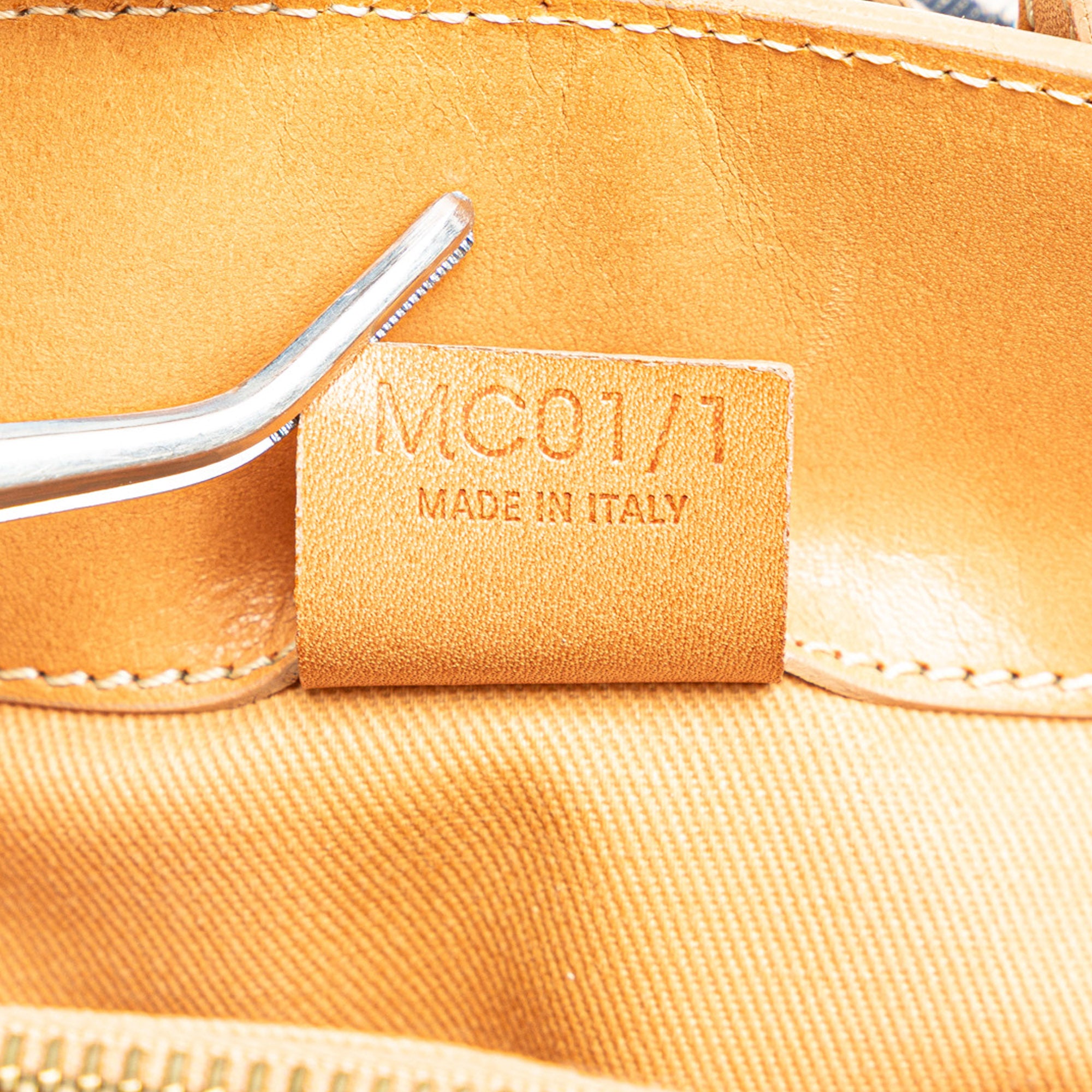 This handbag bag features a denim body with leather trim, flat leather straps, an open top, and an interior zip compartment. Retail Price: 655.00