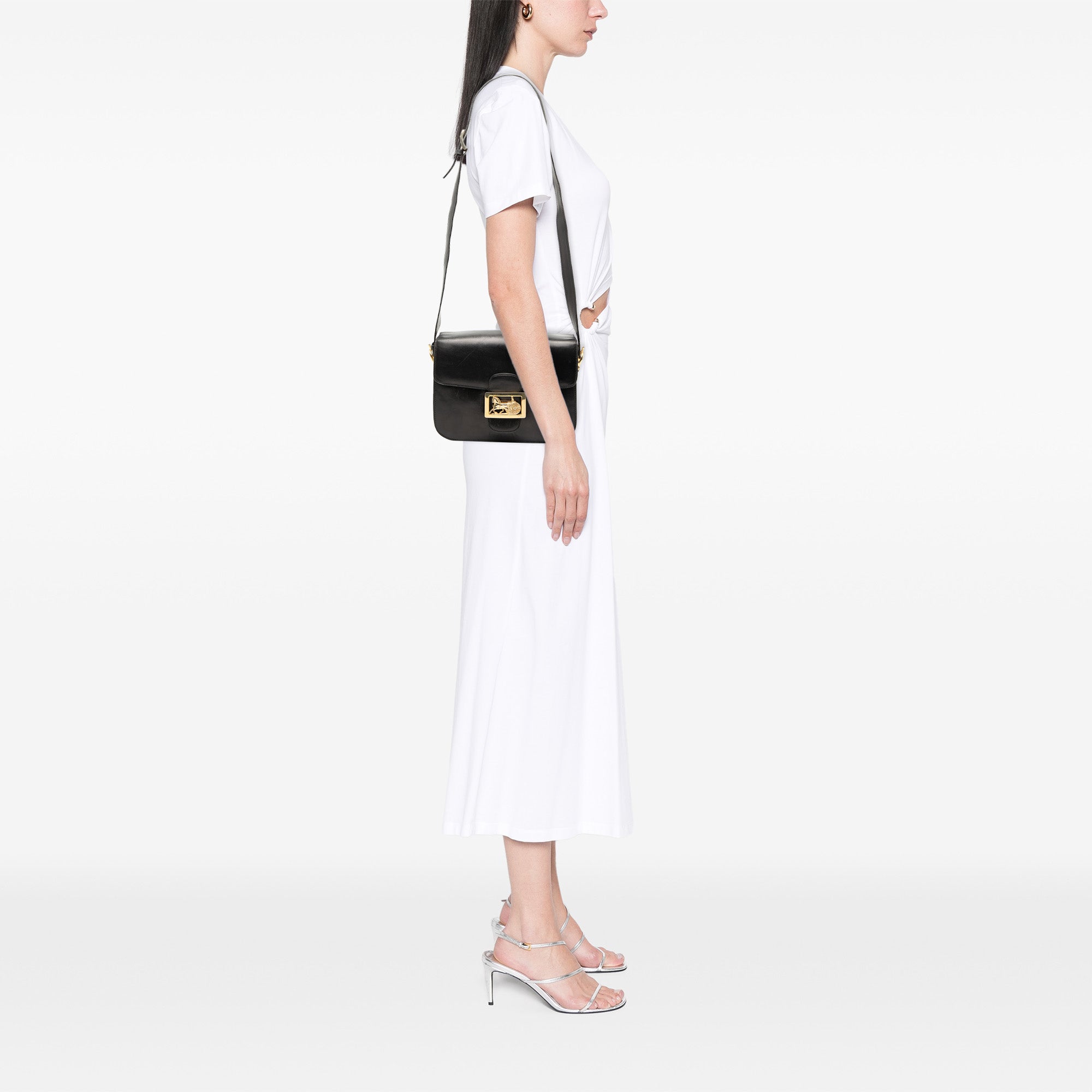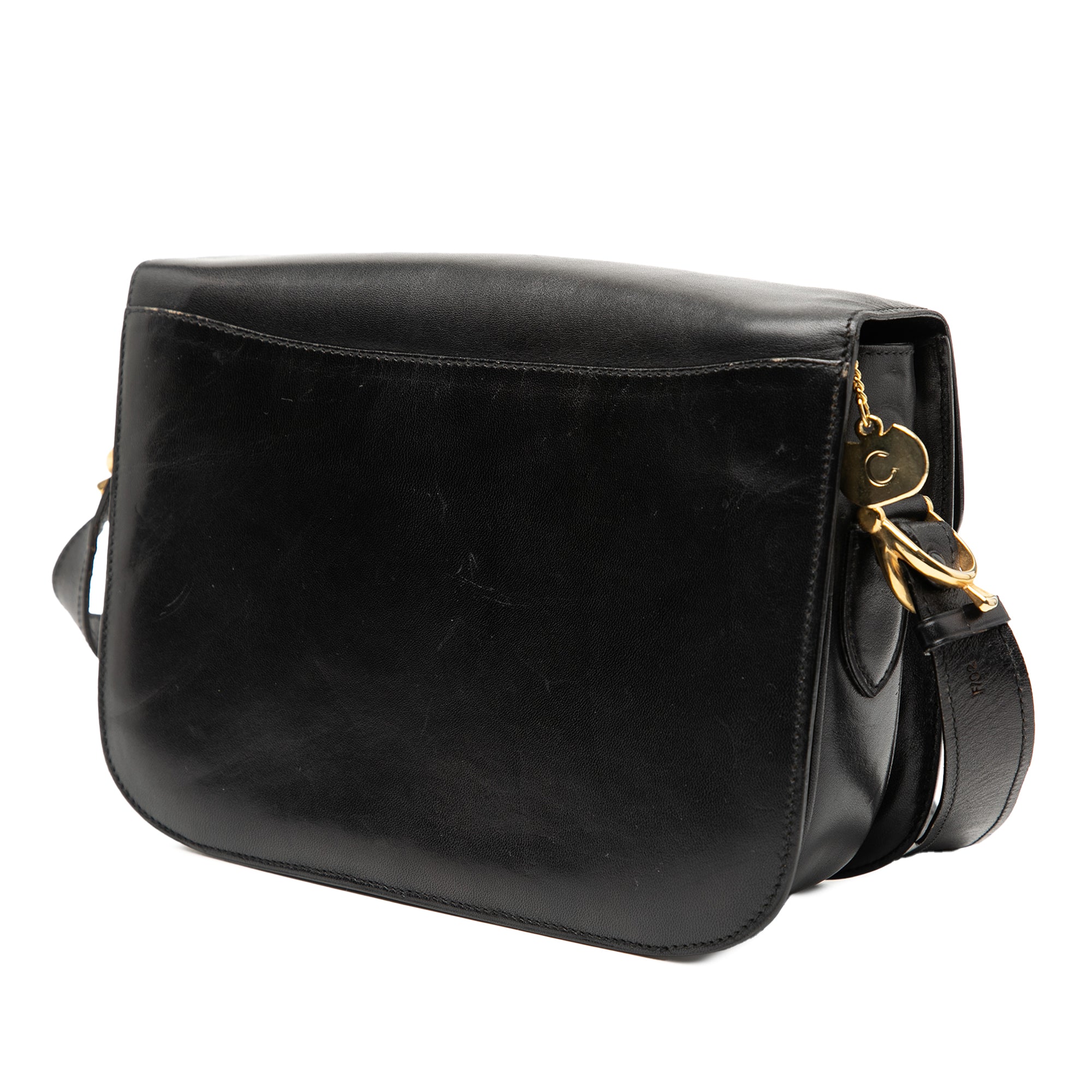 This crossbody bag features a leather body, an adjustable flat leather strap, a front flap with magnetic snap closure, and interior zip and slip pockets. Retail Price: 1100.00
