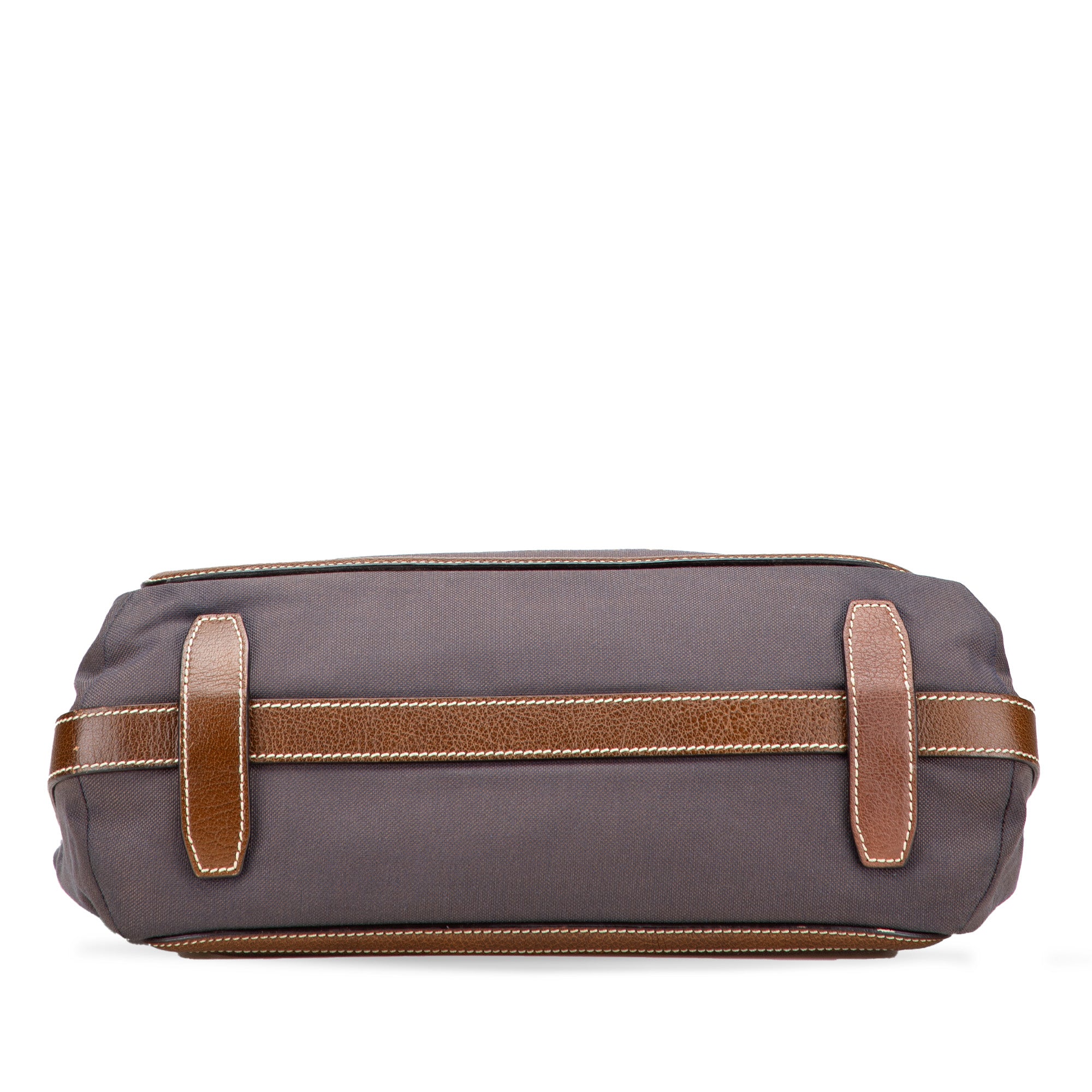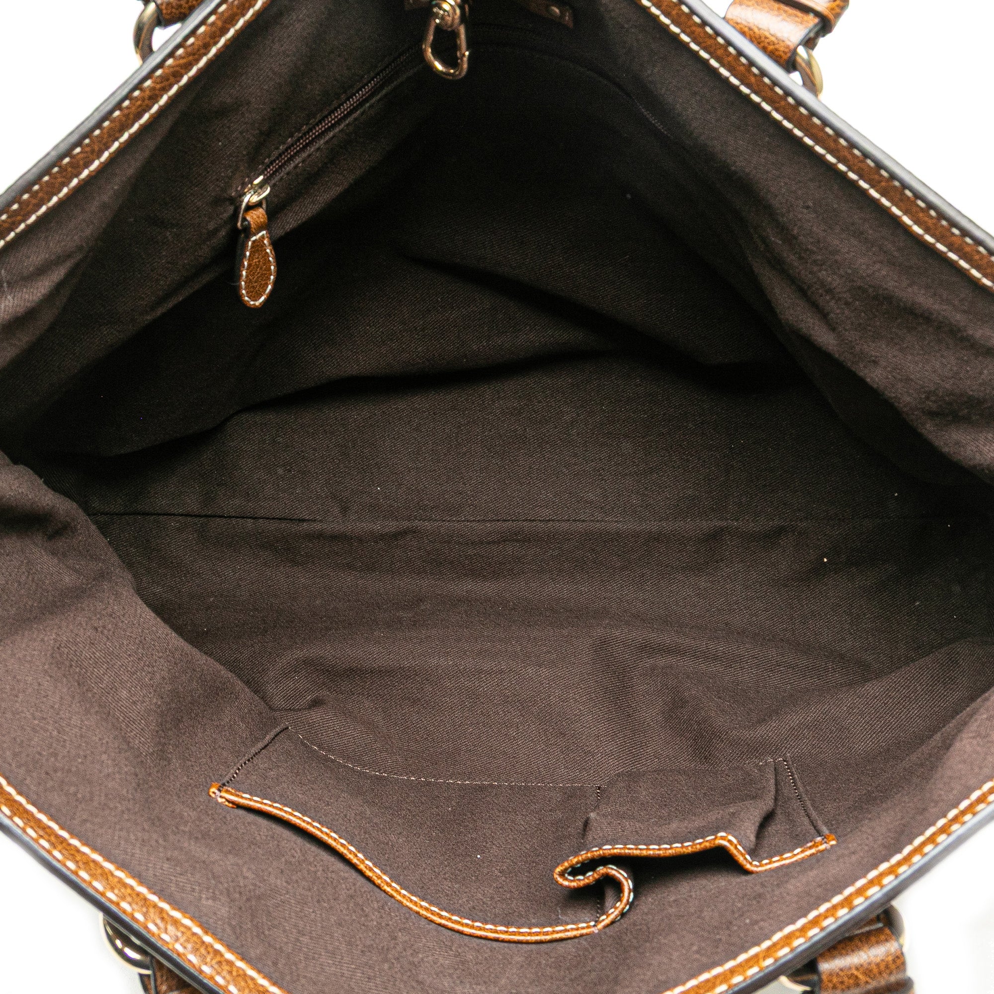 This tote bag features a canvas body with leather trim, flat leather straps, an open top with a claw clasp closure, and interior zip and slip pockets. Retail Price: 995.00